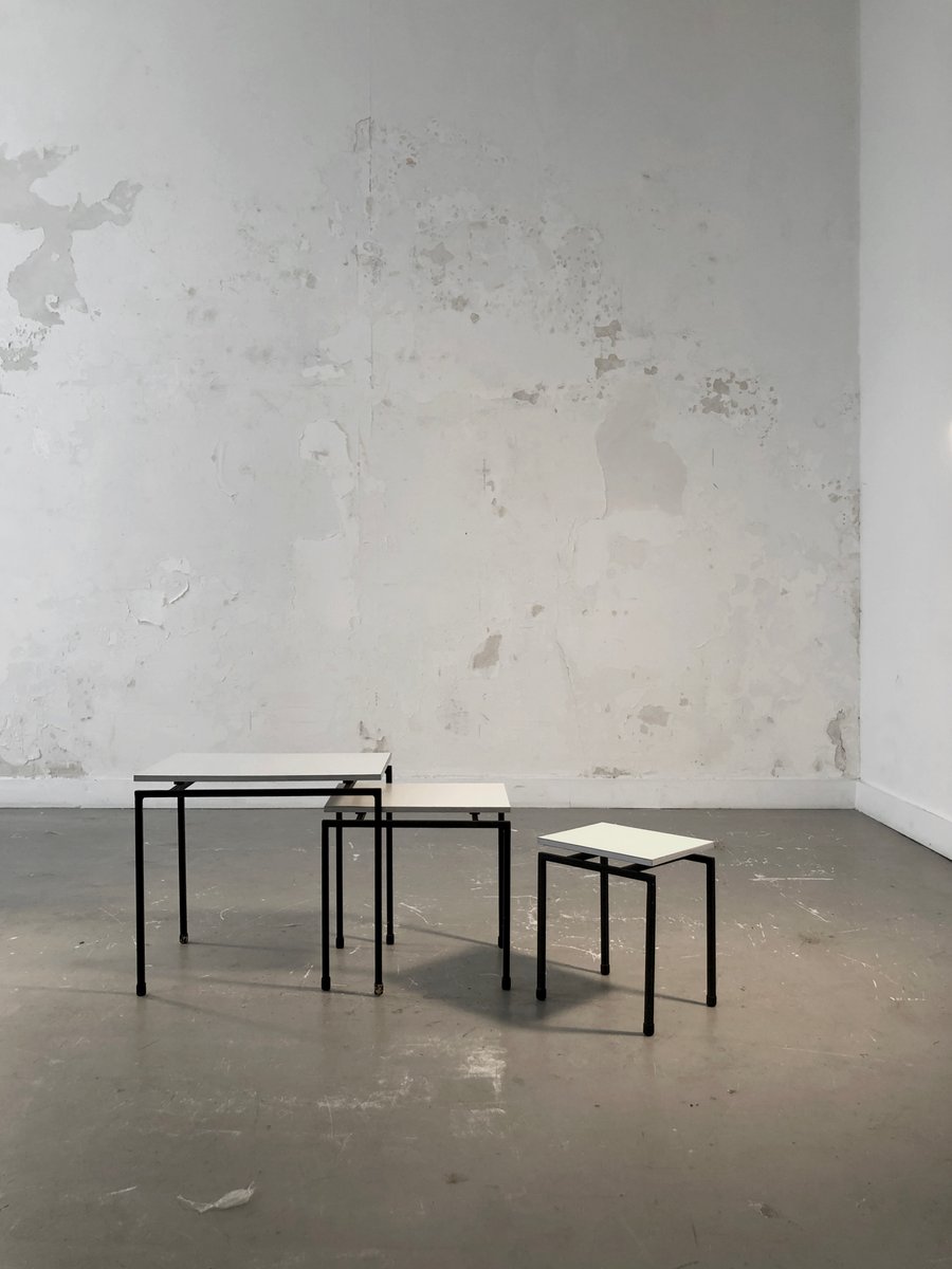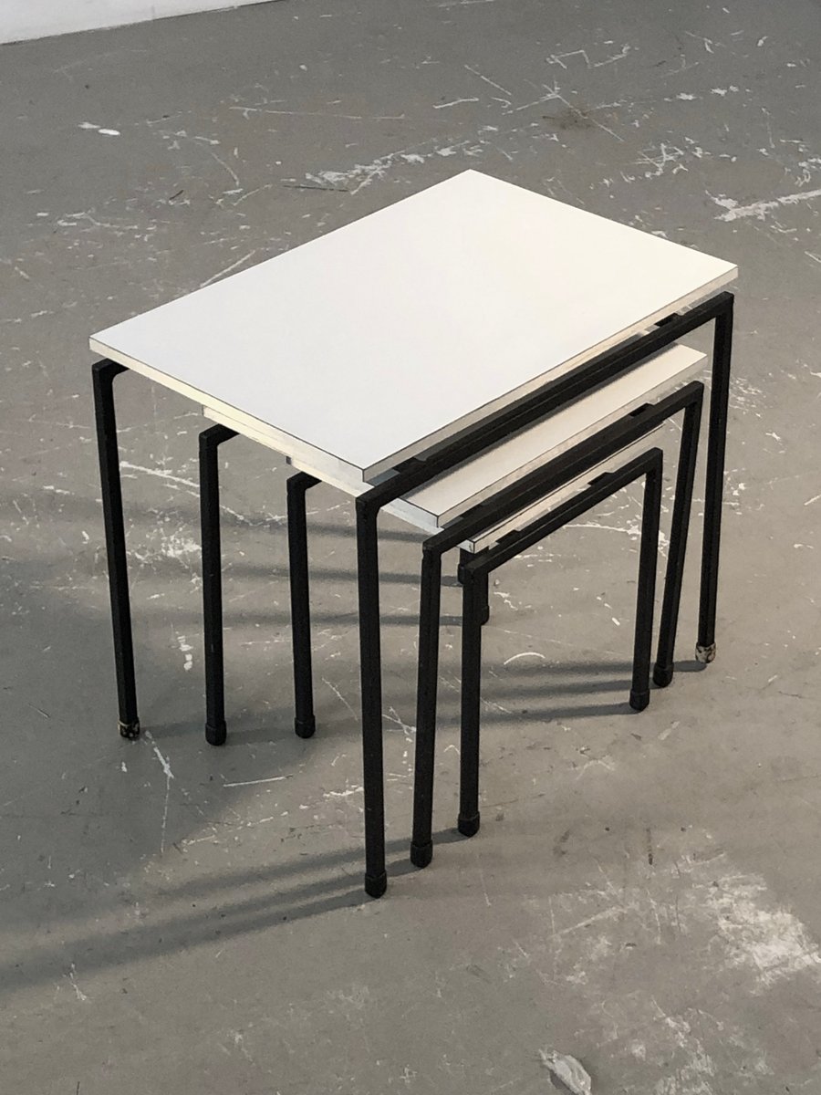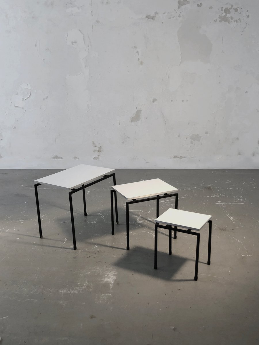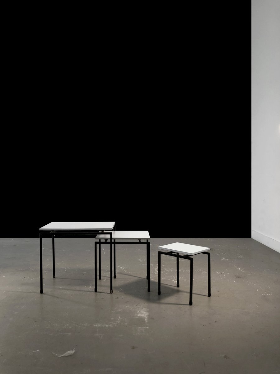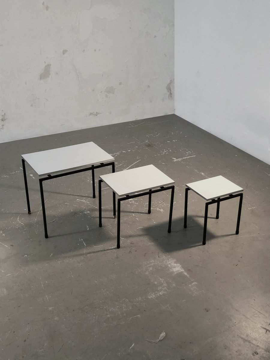 A beautiful set of 3 small nesting tables, or side tables, bedside tables or sofa ends, very graphic and rigorous, Minimalist, Modernist, Constructivist: geometric structures in black lacquered square section metal, white melamine wood tops with silver-plated edges, in the spirit of the creations of ARP, Alain Richard, etc... To be attributed, France 1950-1960.