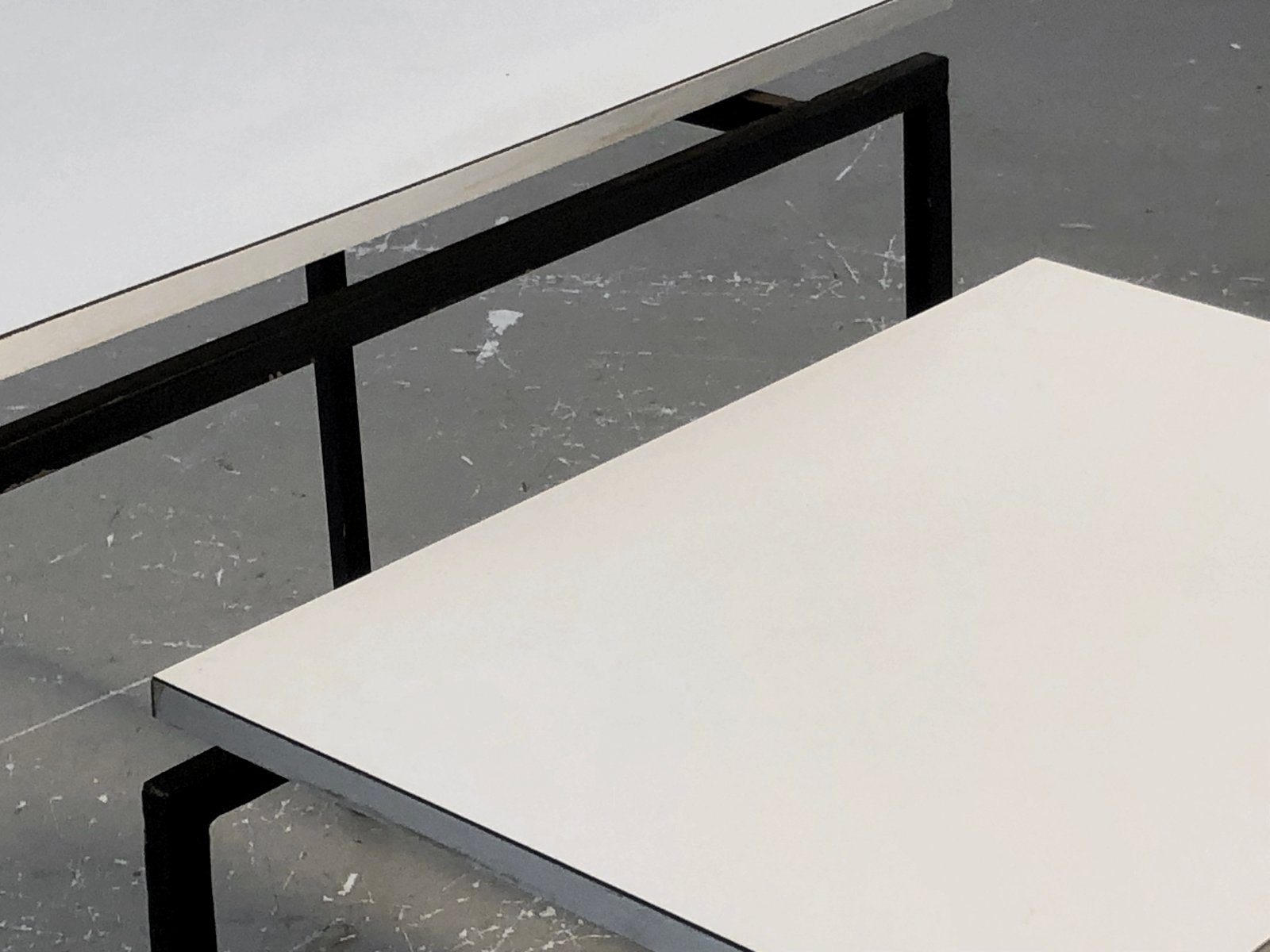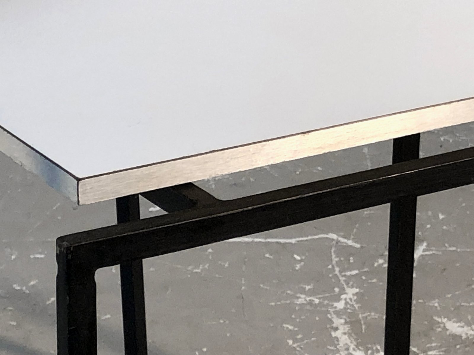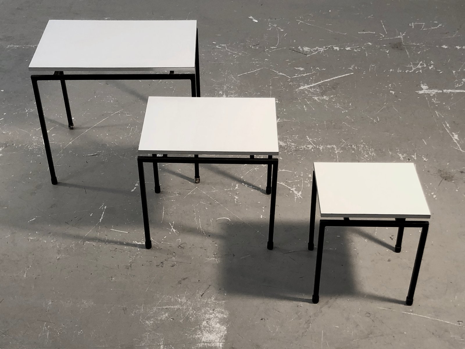 Ein schöner Satz von 3 kleinen Tischen oder Beistelltischen, Nachttischen oder Sofakissen, sehr grafisch und streng, minimalistisch, modernistisch, konstruktivistisch: geometrische Strukturen aus schwarz lackiertem Metall mit quadratischem Querschnitt, weiße Melaminholzplatten mit versilberten Kanten, im Geiste der Kreationen von ARP, Alain Richard, etc... Zuzuordnen, Frankreich 1950-1960.
