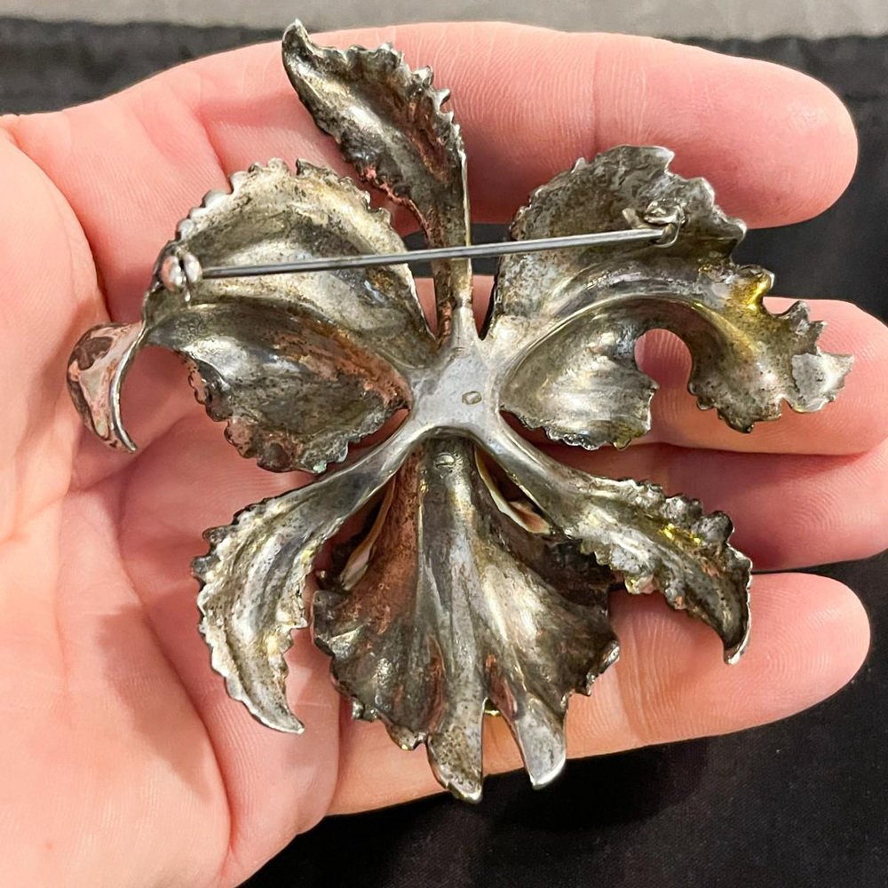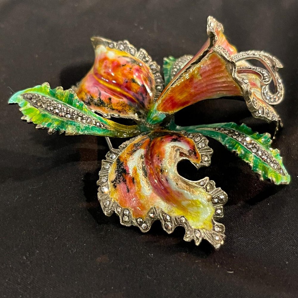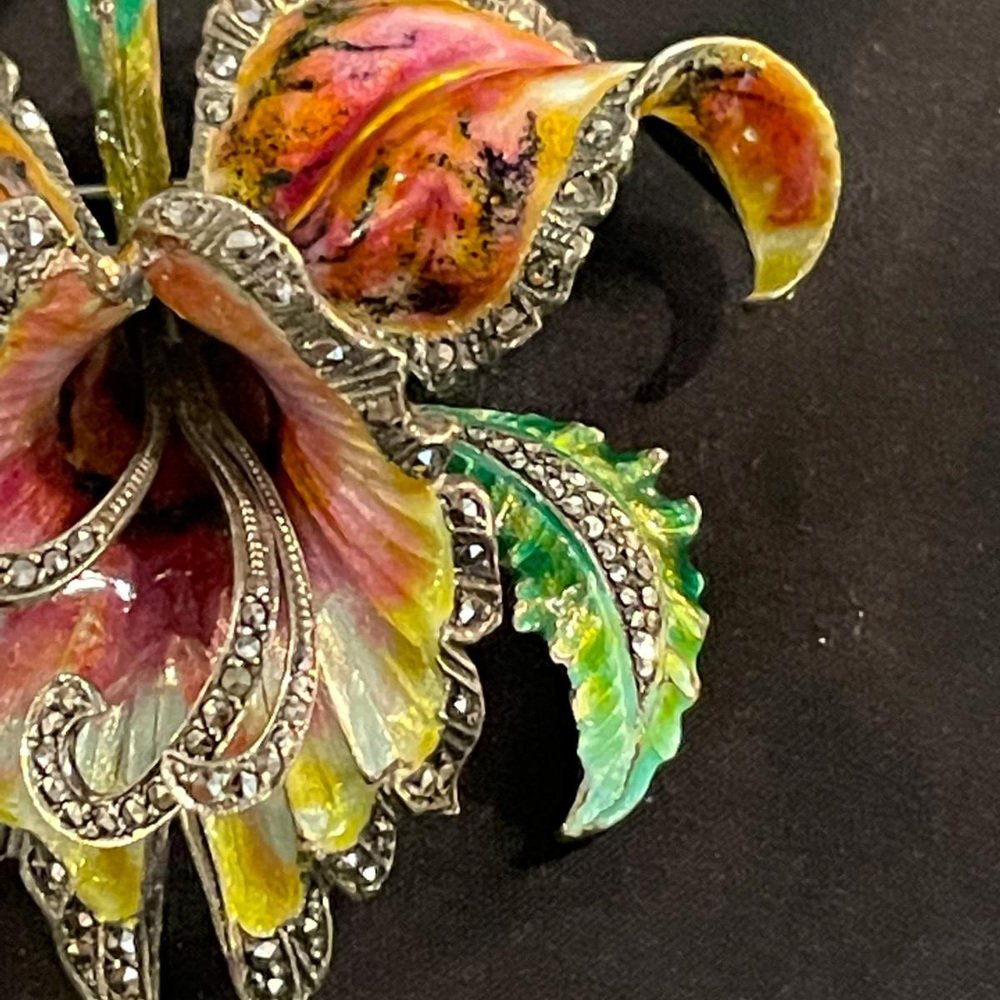 Enamelled silver brooch depicting an orchid or Iris. Although the flower is inspired by the Art Nouveau style, this is a later piece, dating from after 1950. The enamelling is refined and polychrome, with delicate shades of green, pink, violet, orange and white. The hallmark is visible on the reverse (see photos). Very good condition. Period: 20th Century / Mid Century. Country of Origin: Europe. Dimensions (H x W x D): 8 x 8 x 3 cm. Weight: 0,1 Kg. Condition: Good. Material: Metal / Enamelled silver / Solid silver.