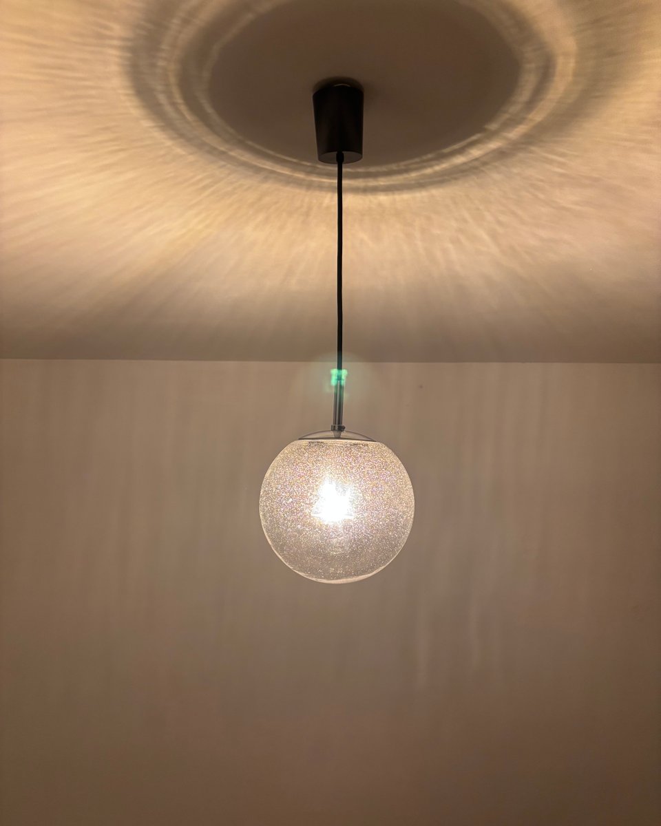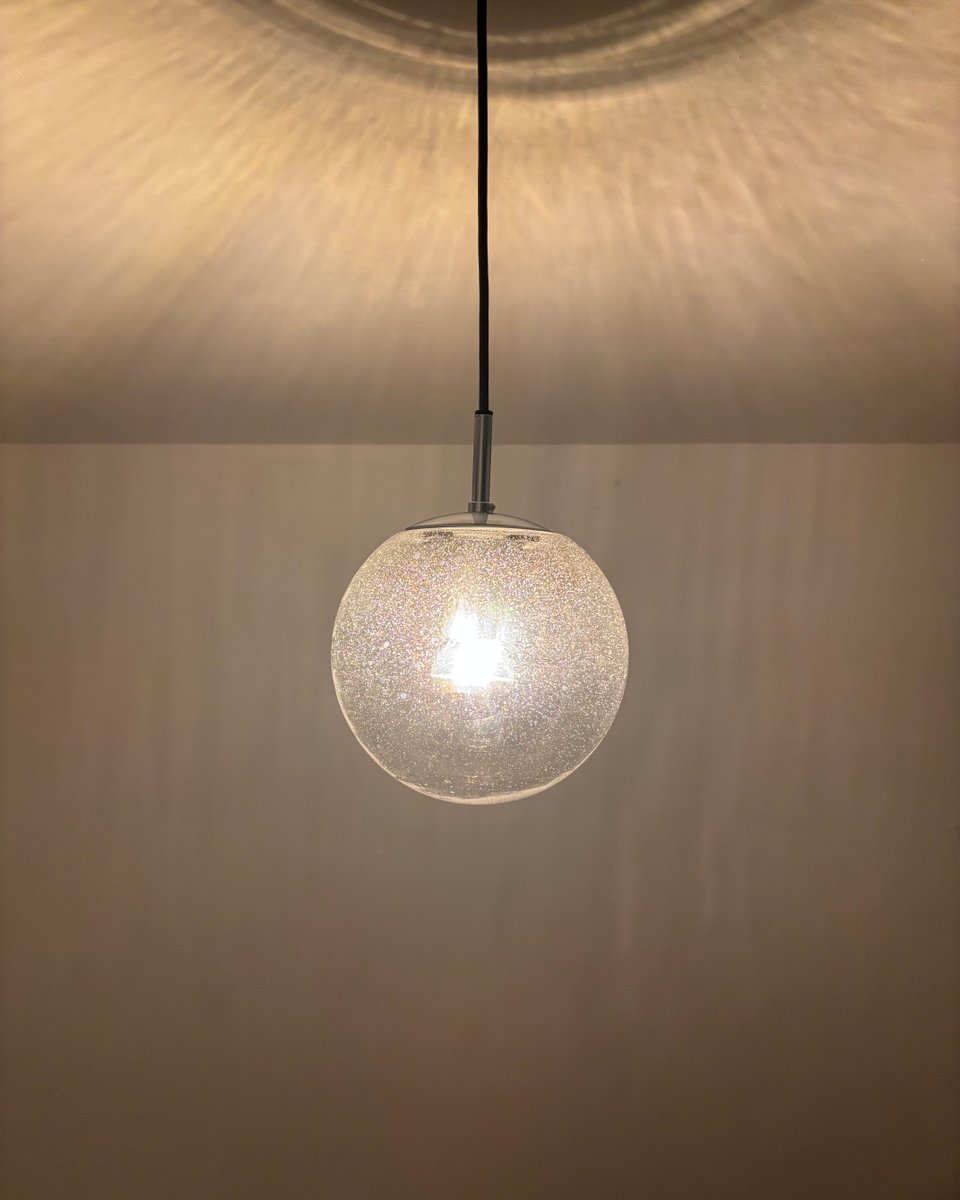 This timeless pendant lamp by Limburg features a hand-blown clear glass sphere, showcasing the brand’s signature craftsmanship. The spherical shade softly diffuses the light while maintaining a clean, architectural silhouette. A fine example of German mid-century lighting design, it carries the original manufacturer’s sticker as a mark of authenticity.