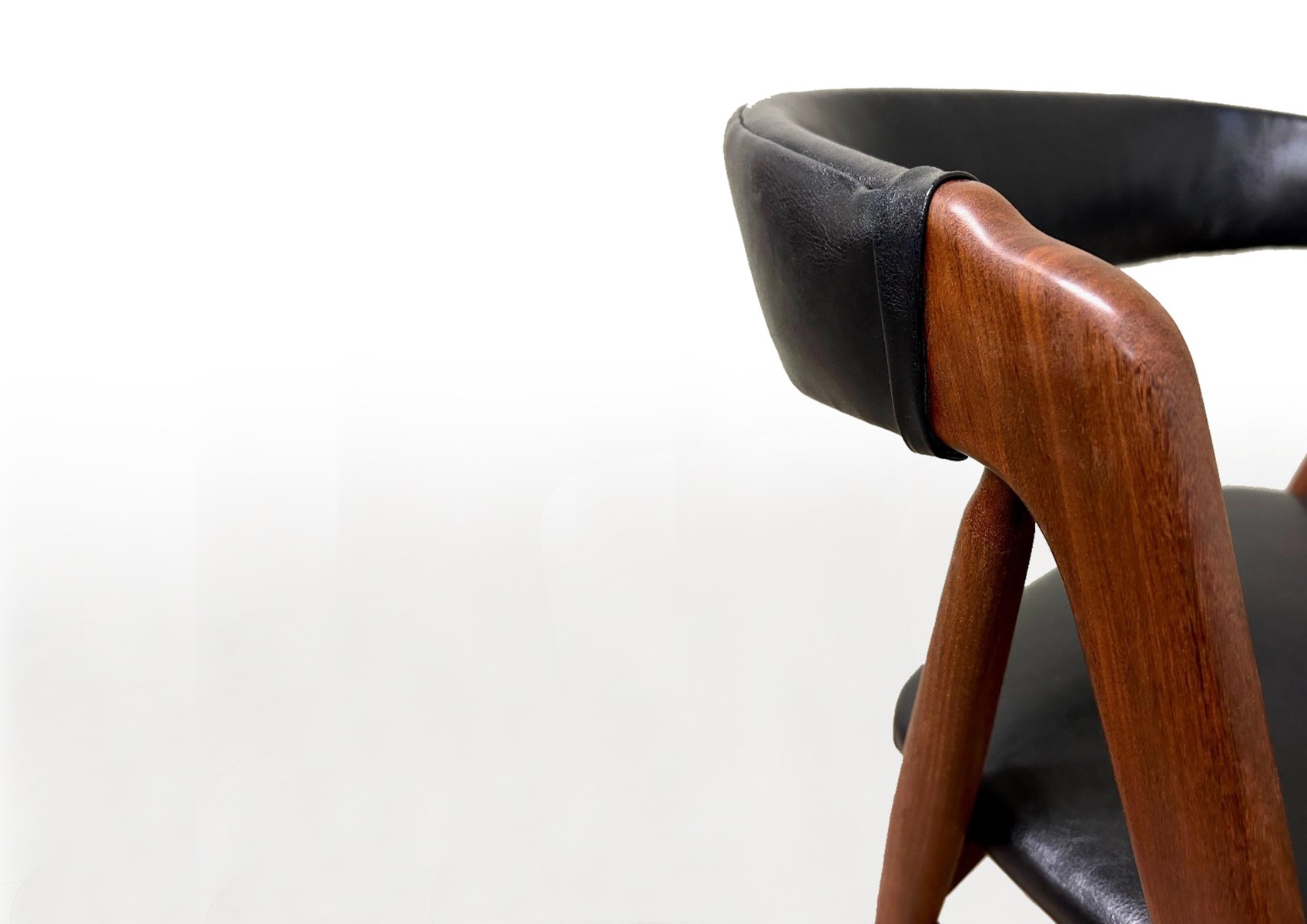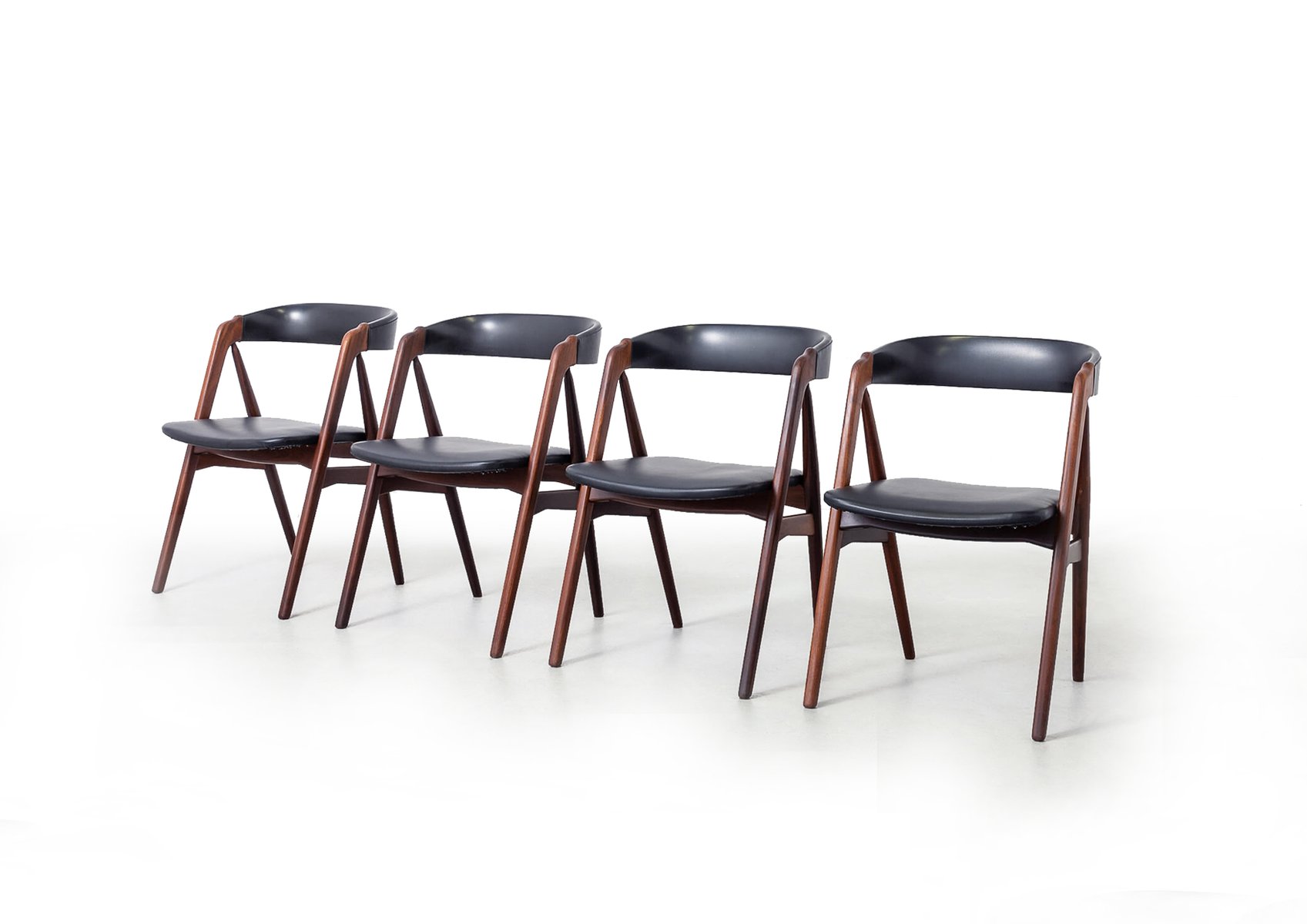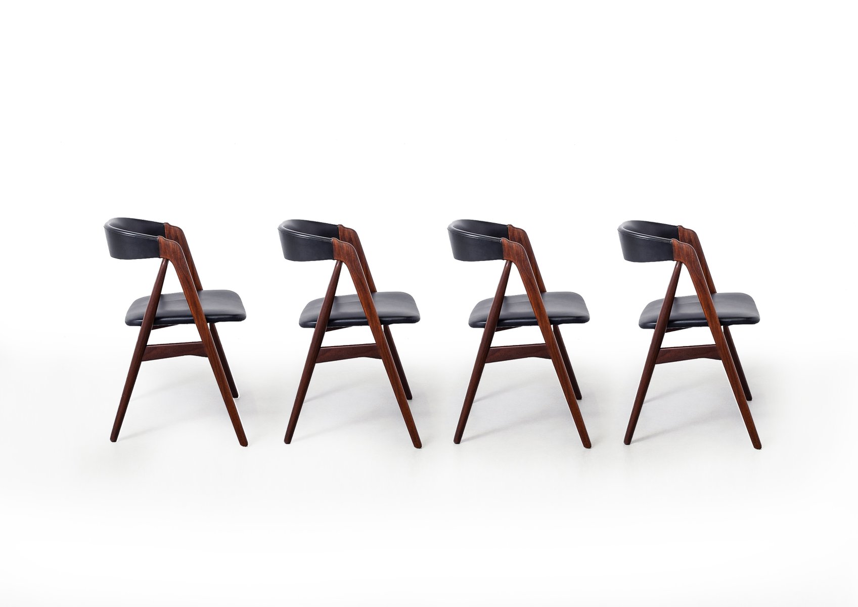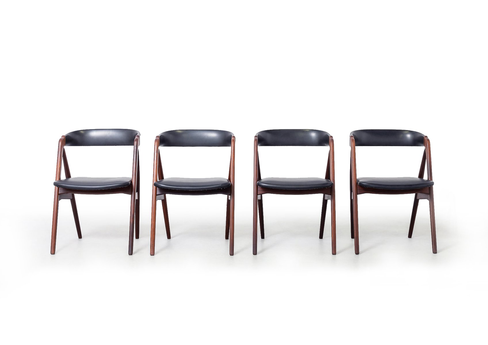 This set of four mid-century dining chairs, designed by Danish designer Harlev Thomas and crafted by Farstrup Møbler, showcases the best of Scandinavian design. Featuring a harmonious blend of sleek teak wood frames and black leather upholstery, these chairs offer both elegance and durability. Designed in the 1960s, their minimalist aesthetic, subtle curves, and high-quality materials make them a timeless addition to any dining space. In excellent original condition, this set captures the essence of Danish craftsmanship and modern design.