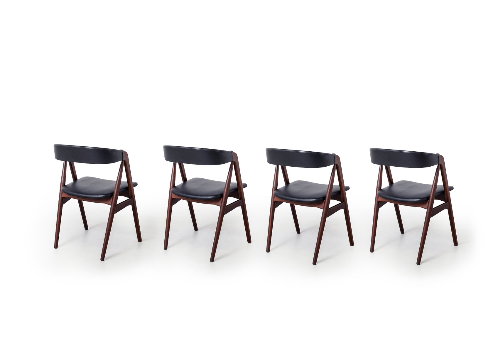 Dieses Set aus vier Esszimmerstühlen aus der Mitte des Jahrhunderts, entworfen vom dänischen Designer Harlev Thomas und hergestellt von Farstrup Møbler, zeigt das Beste des skandinavischen Designs. Mit einer harmonischen Mischung aus schlanken Teakholzrahmen und schwarzen Lederbezügen bieten diese Stühle sowohl Eleganz als auch Haltbarkeit. Die minimalistische Ästhetik, die subtilen Kurven und die hochwertigen Materialien machen die in den 1960er Jahren entworfenen Stühle zu einer zeitlosen Ergänzung für jeden Essbereich. Dieses Set ist in ausgezeichnetem Originalzustand und verkörpert die Essenz dänischer Handwerkskunst und modernen Designs.