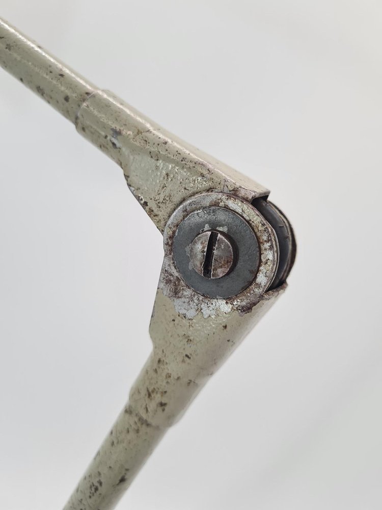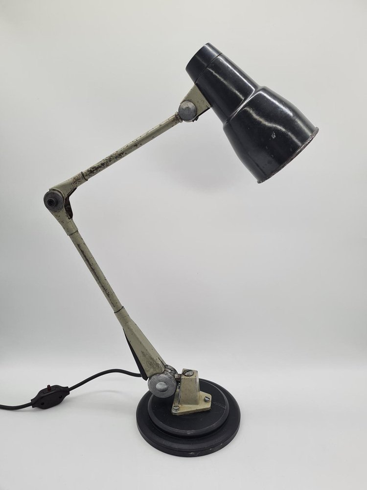 Eine originelle, schwere Schreibtischlampe mit ausgeprägtem industriellem Charakter, entworfen im Mid-Century-Modern-Stil. Die Konstruktion basiert auf einem vollständig verstellbaren Metallarm mit mehreren Gelenken, der eine präzise Positionierung des Lichts ermöglicht. Der Lampenschirm besteht aus Metall und hat eine klassische, technische Form. Sichtbare natürliche Gebrauchsspuren, Patina und kleinere Lackabriebstellen unterstreichen den authentischen, funktionalen Ursprung der Lampe und verleihen ihr einen rohen Charakter, der in Loft- und modernistischen Einrichtungen geschätzt wird.