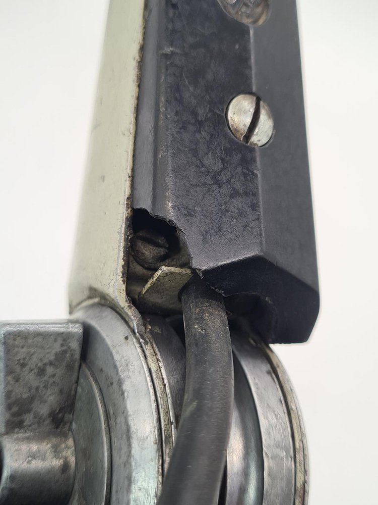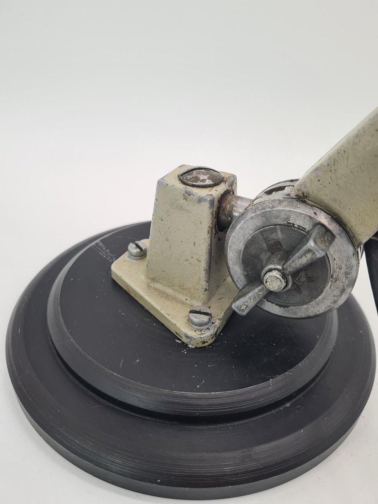 Die Lampe ist auf einem soliden, stabilen Sockel montiert – der aktuelle Sockel wurde nachträglich (in einer Werkstatt) angefertigt und ersetzt die ursprüngliche Schraubzwingenbefestigung an der Tischplatte. Dies verbessert die Funktionalität und ermöglicht eine klassische Verwendung als Schreibtischlampe, ohne die oberen Elemente der Konstruktion zu beeinträchtigen. Die Lampe ist elektrisch funktionsfähig und verfügt über ein Kabel mit Schalter. Standard-Glühbirnengewinde.