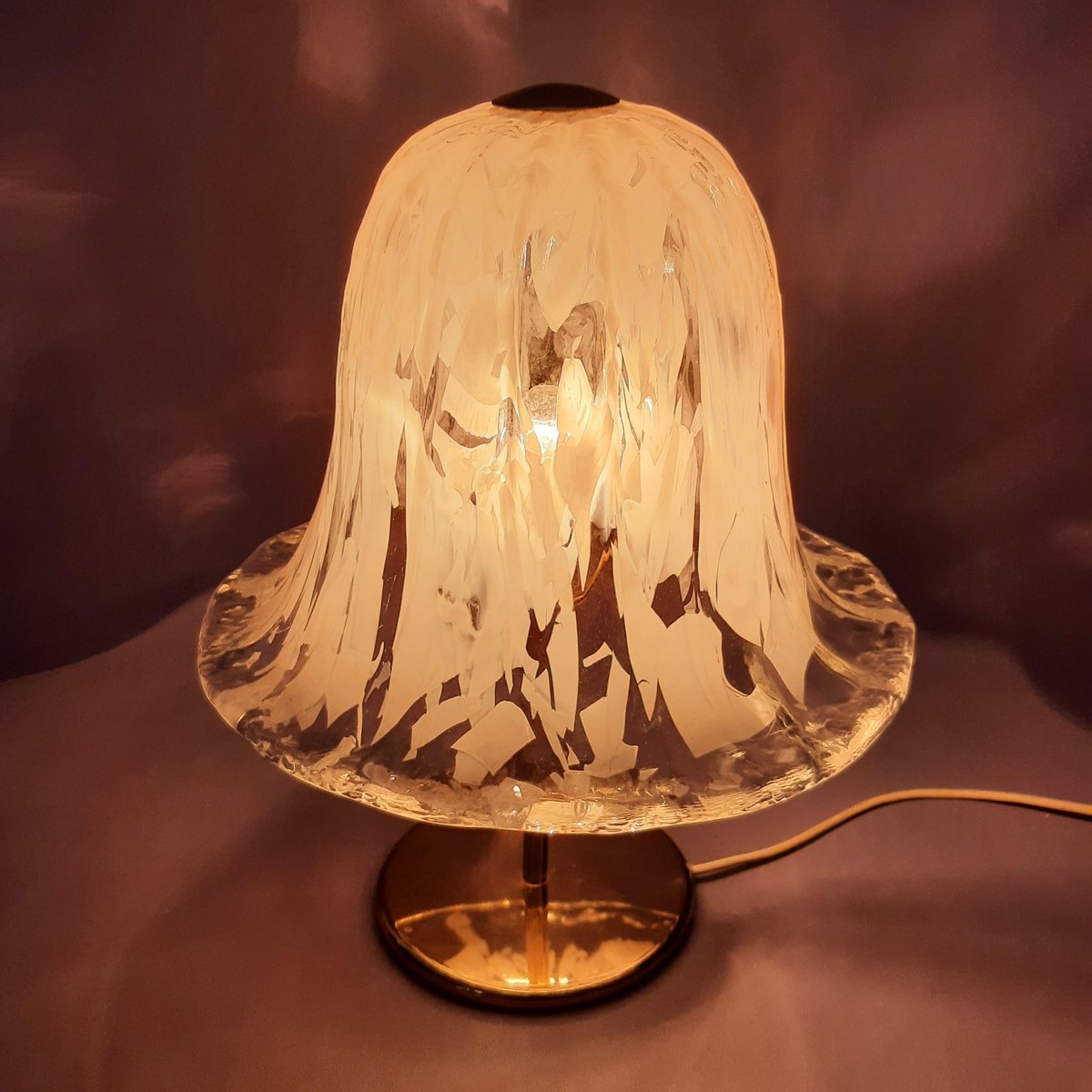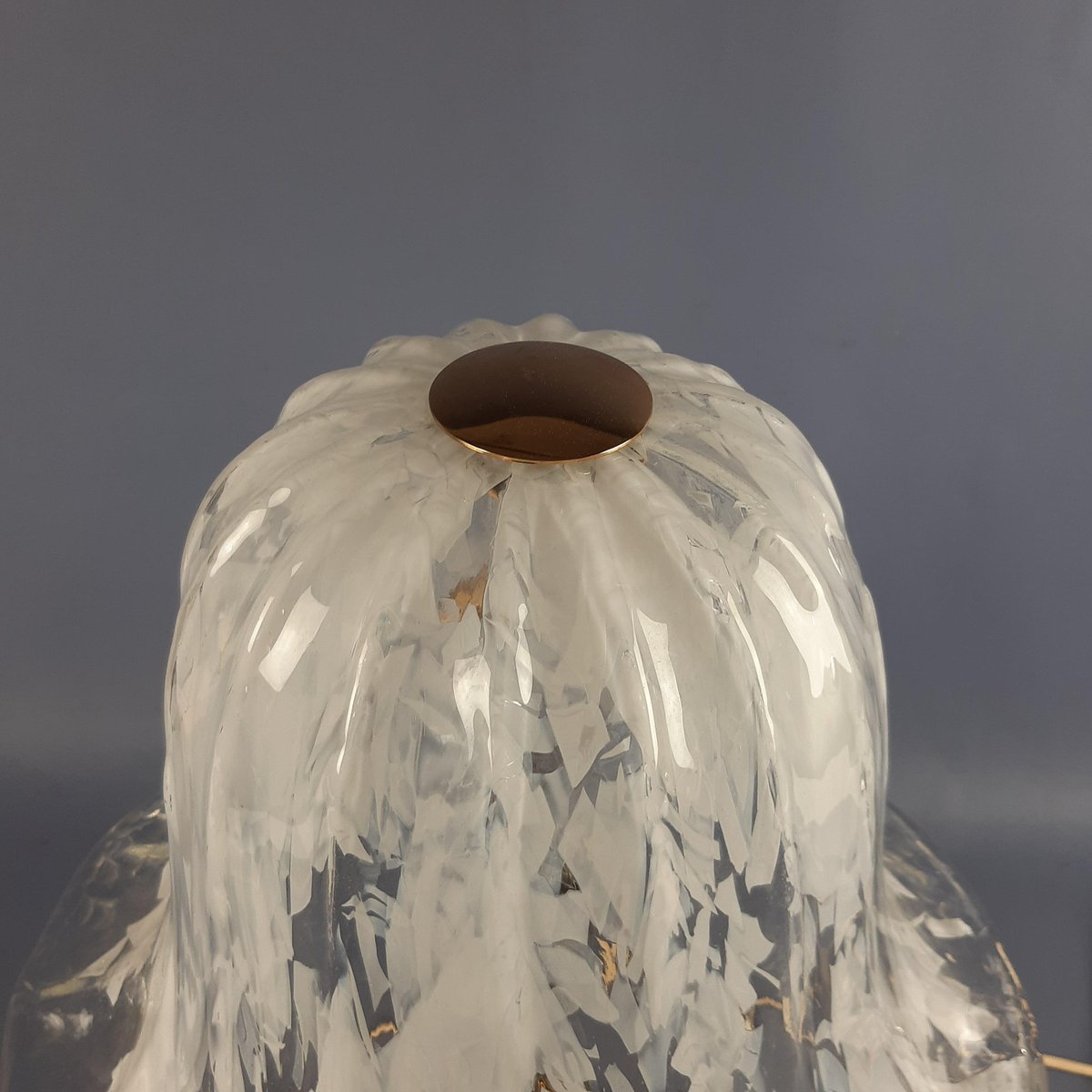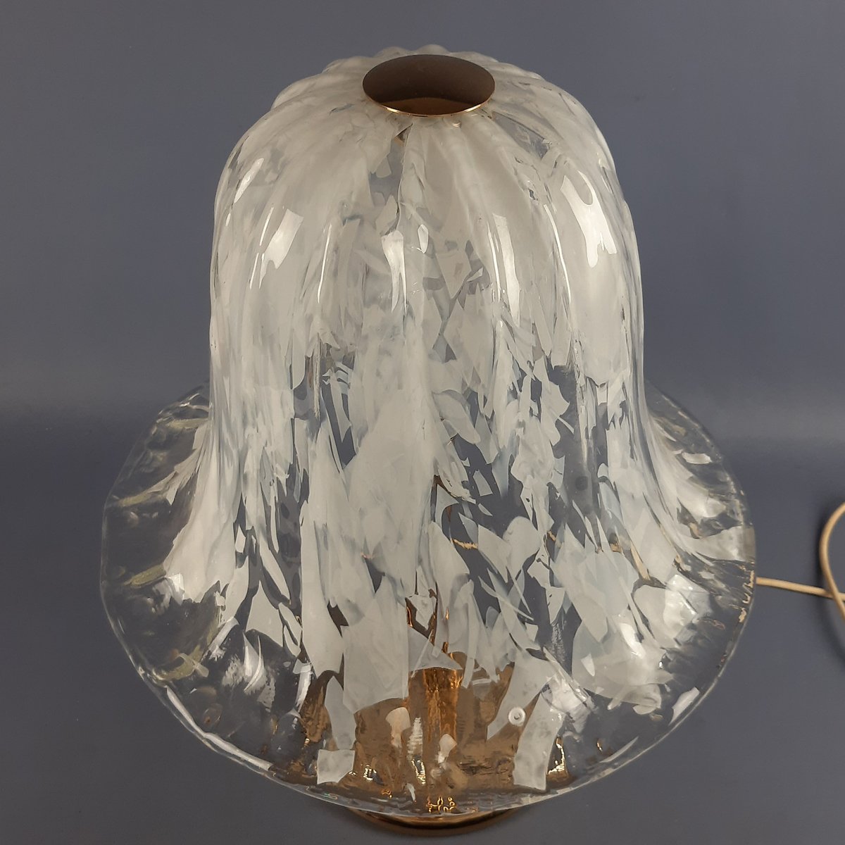Glas und Stil: Der Diffusor ist aus mundgeblasenem Muranoglas mit einem dekorativen Muster aus weißen Sprenkeln (milchig oder incamiciato-Stil), die einen lebendigen, wellenförmigen Effekt erzeugen, der typisch für die venezianische Glaskunst ist. Die Glocken- oder Pilzform mit ausgestelltem Rand ist perfekt für eine stimmungsvolle Beleuchtung.
