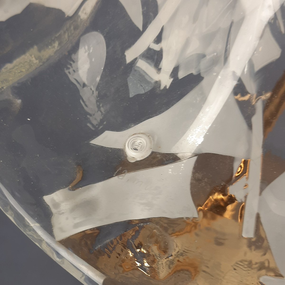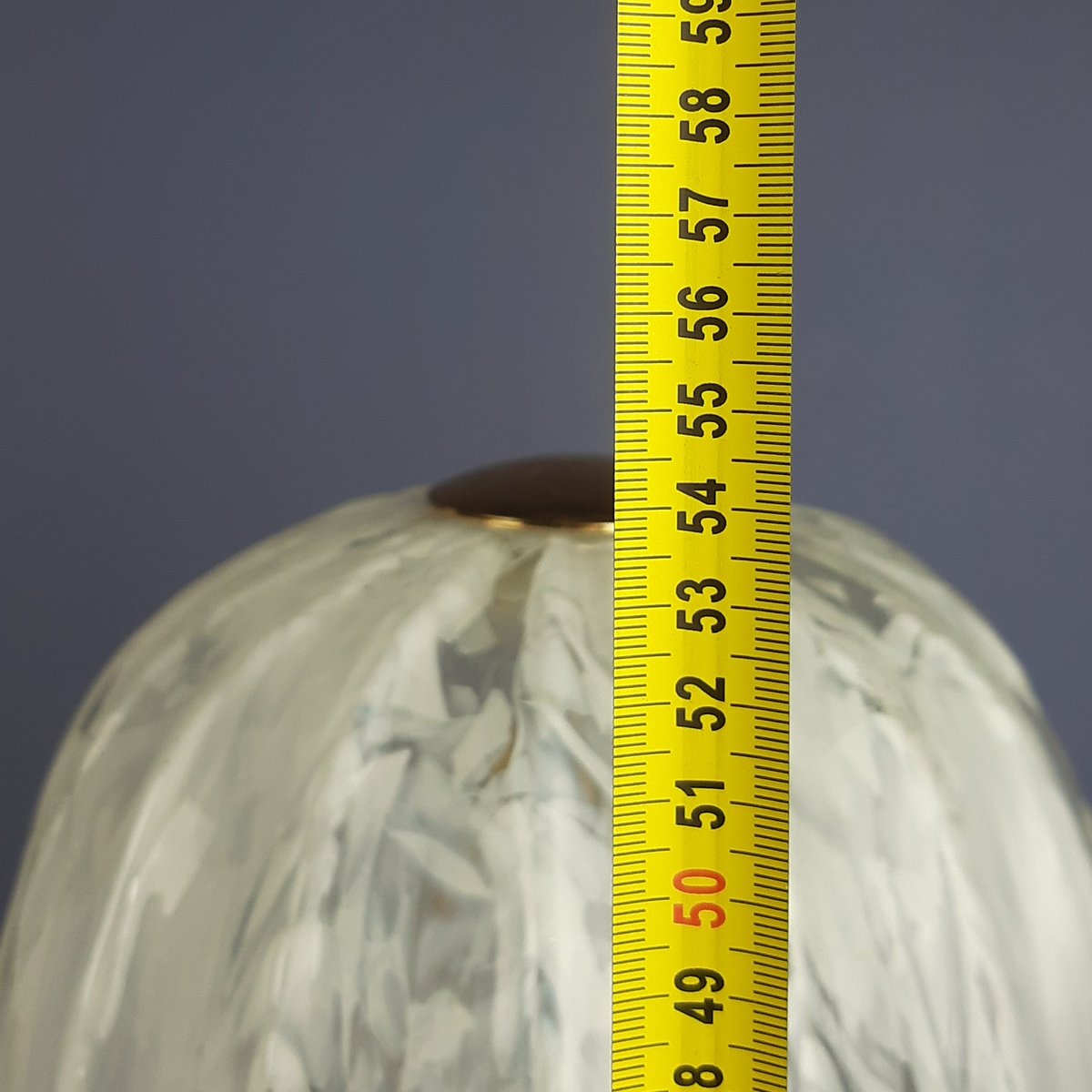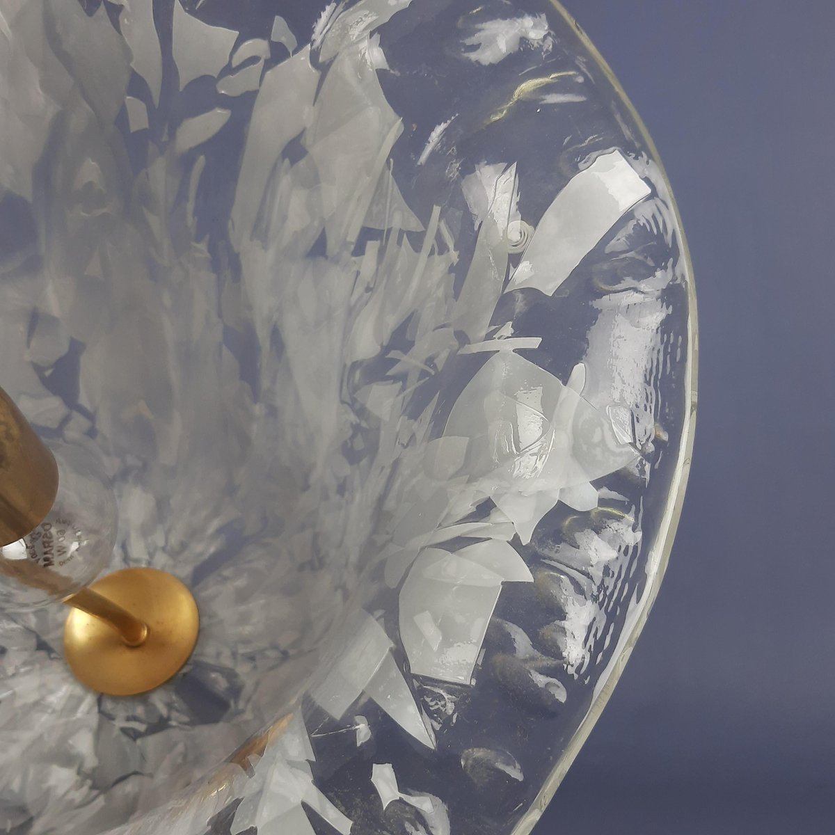 Glas und Stil: Der Diffusor ist aus mundgeblasenem Muranoglas mit einem dekorativen Muster aus weißen Sprenkeln (milchig oder incamiciato-Stil), die einen lebendigen, wellenförmigen Effekt erzeugen, der typisch für die venezianische Glaskunst ist. Die Glocken- oder Pilzform mit ausgestelltem Rand ist perfekt für eine stimmungsvolle Beleuchtung.