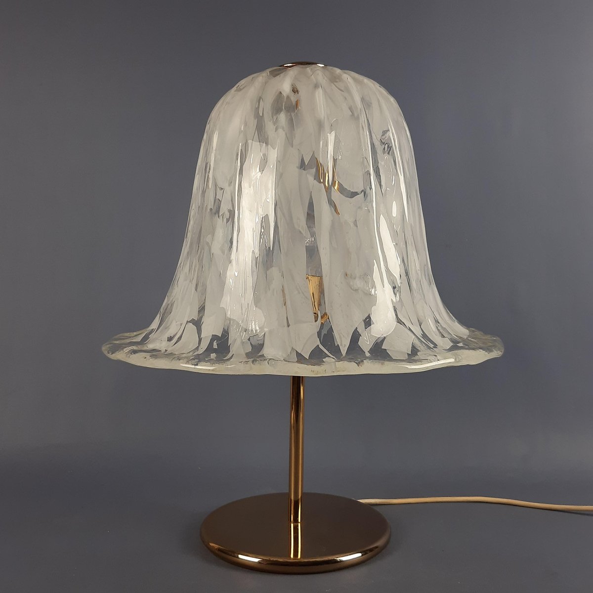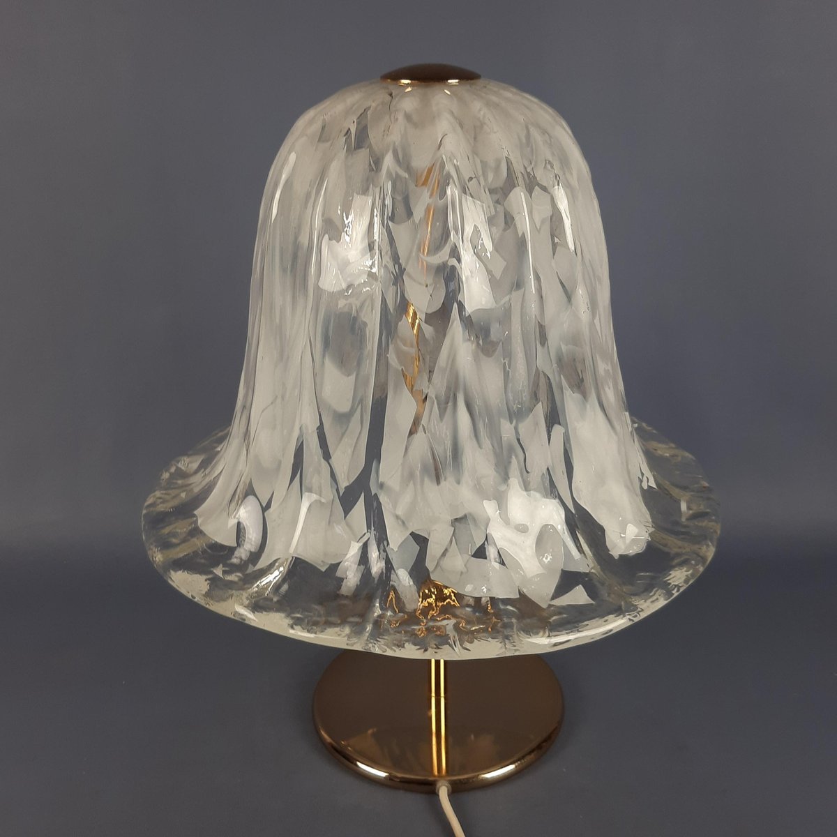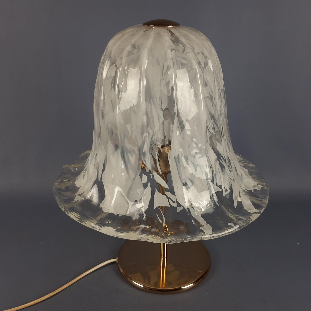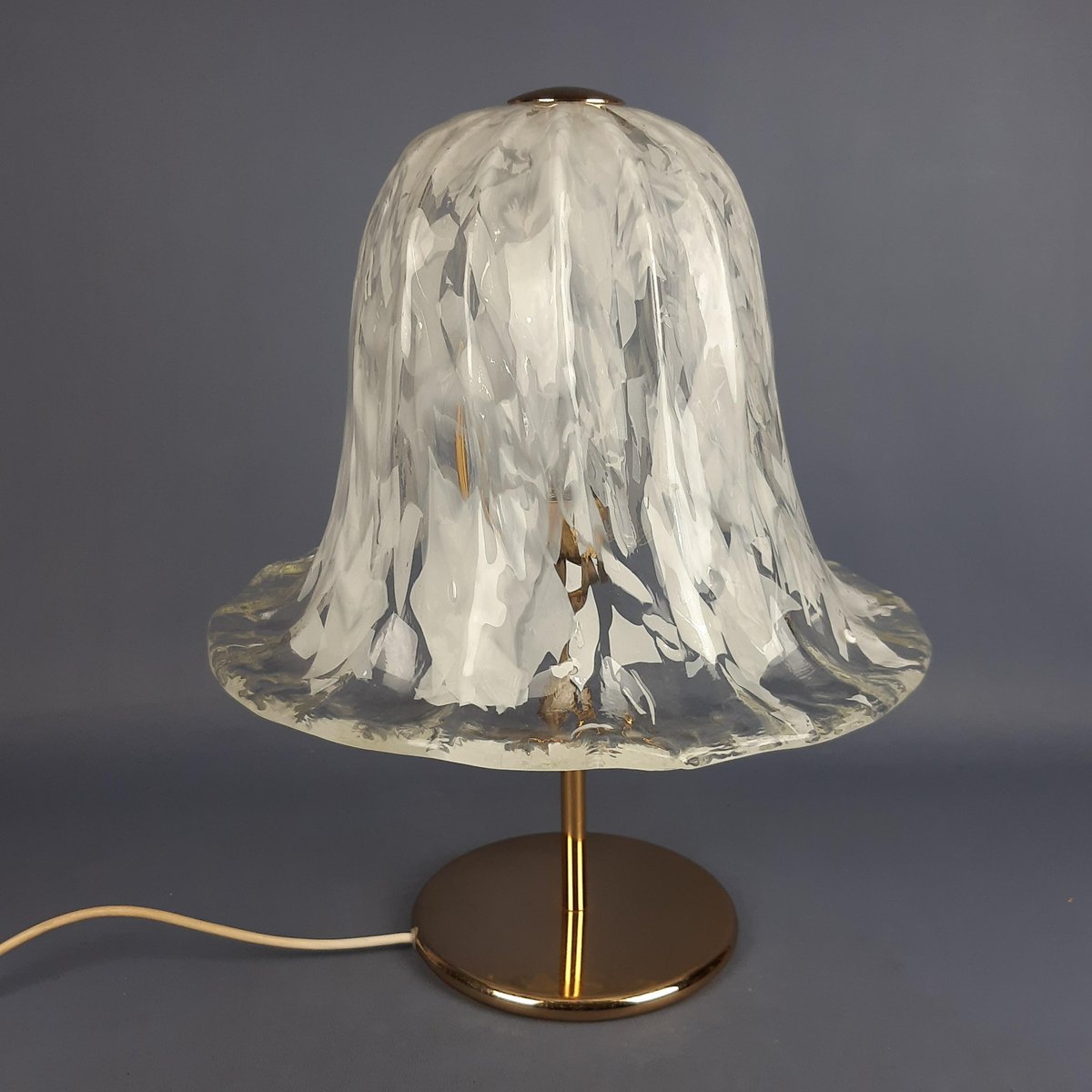 Sockel und Materialien: Die Leuchte steht auf einem Sockel aus poliertem Messing, der ihr einen Hauch von Eleganz verleiht und das Licht reflektiert. Die Kombination aus weißem/klarem Glas und Messing ist ein Klassiker des italienischen Designs aus dieser Zeit.