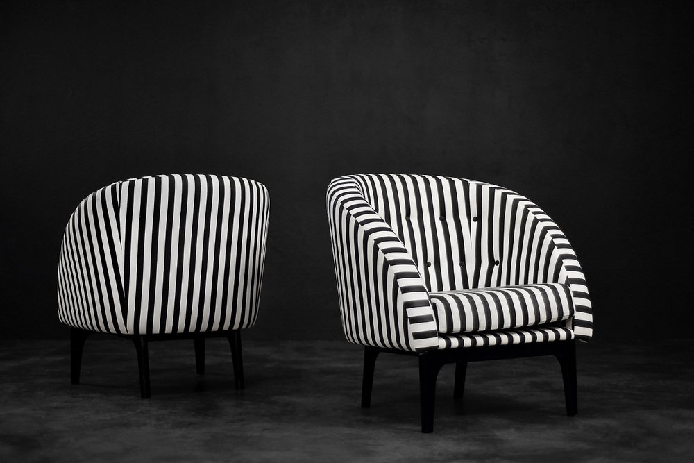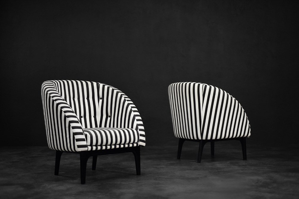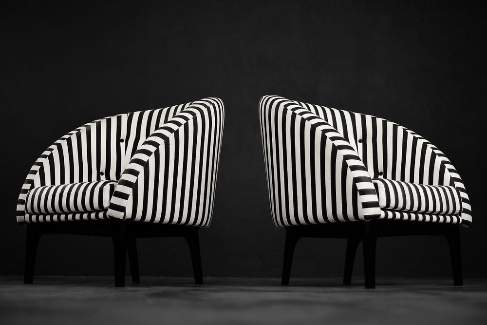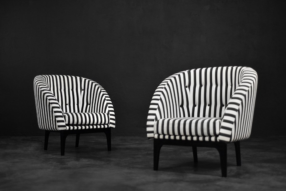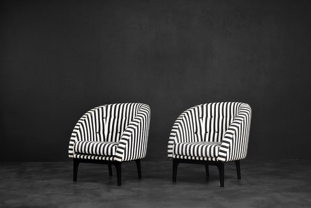 Dieses Set aus zwei Sesseln wurde in den 1960er Jahren in Dänemark hergestellt. Sie sind mit einem dicken schwarz-weiß gestreiften Stoff gepolstert. Schwarz und Weiß ist eine klassische, zeitlose Farbkombination. Darüber hinaus bringt das Streifenmuster Dynamik und Abwechslung in die Einrichtung. Die kontrastierende Gegensätzlichkeit ist einer der Hauptvorteile der Möbel aus der Mid-Century Modern-Ära. Die Sitze sind niedrig und haben eine abgerundete Schalenform. Das Sitzkissen ist locker platziert und die Rückenlehne ist mit schwarzen Knöpfen verziert. Die kurzen Beine sind aus Massivholz und schwarz lackiert. Die Sessel passen sowohl in klassische als auch in moderne Innenräume. Es handelt sich um ein seltenes Modell, dessen Design von einer wachsenden Gruppe von Liebhabern guten Designs geschätzt wird.