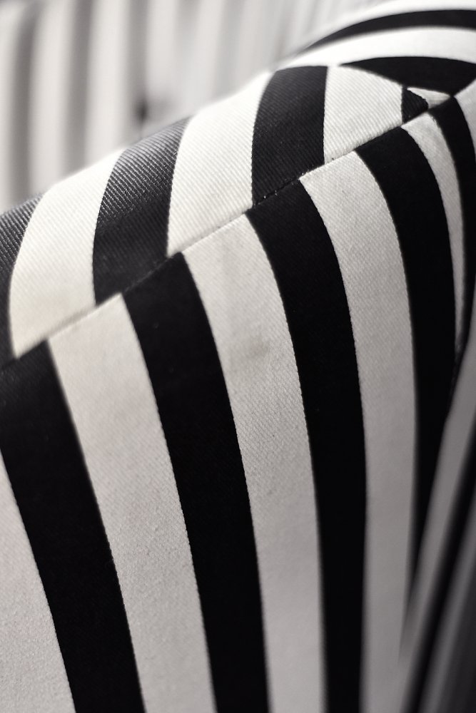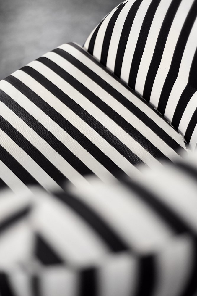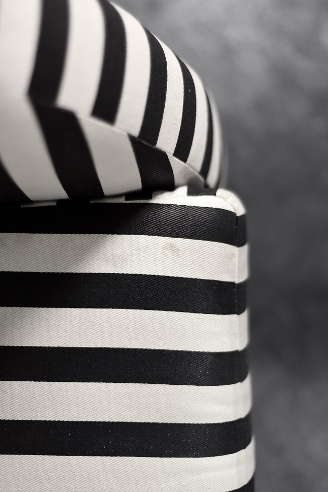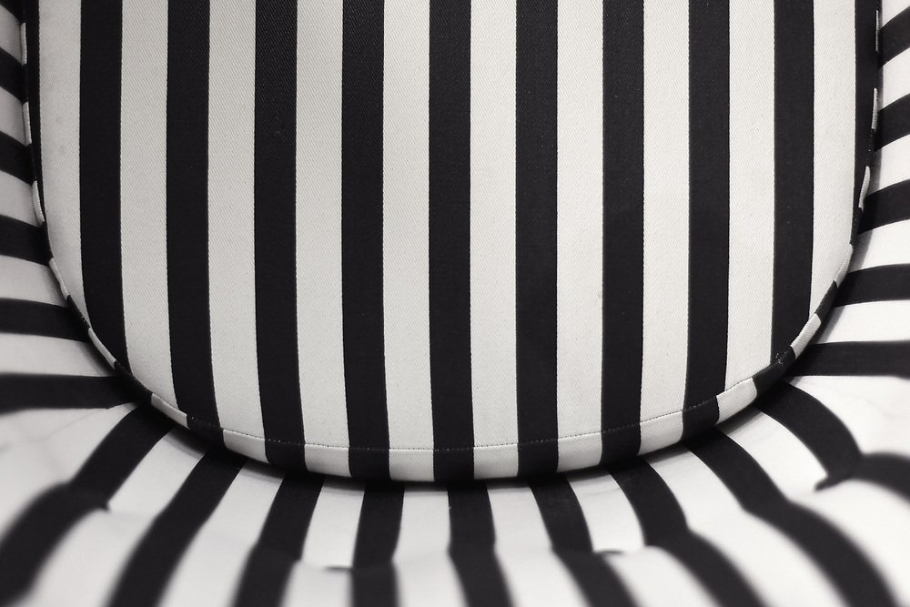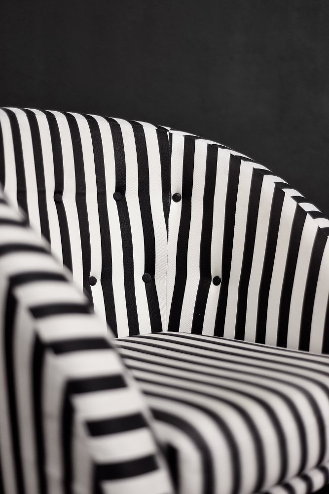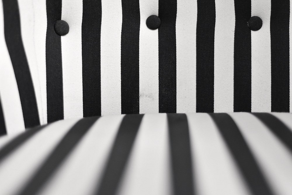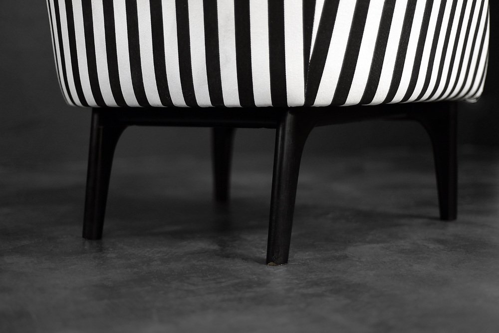 This set of two armchairs was made in Denmark during the 1960s. They are upholstered in a thick black and white striped fabric. Black and white is a classic, timeless color combination. In addition, the striped pattern due dynamics and brings variety to the interior. Contrasting opposition is one of the main advantages of furniture from the Mid-Century Modern era. The seats are low and have a rounded bucket shape. The seat cushion is loosely placed and the backrest is decorated with black buttons. The short legs are made of solid wood, finished in black. The armchairs will work well in both classic and modern interiors. This is a rare model whose design is appreciated by a growing group of connoisseurs of good design.