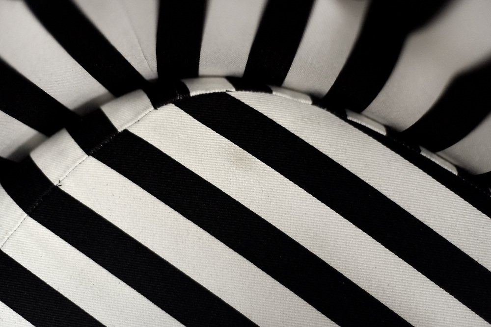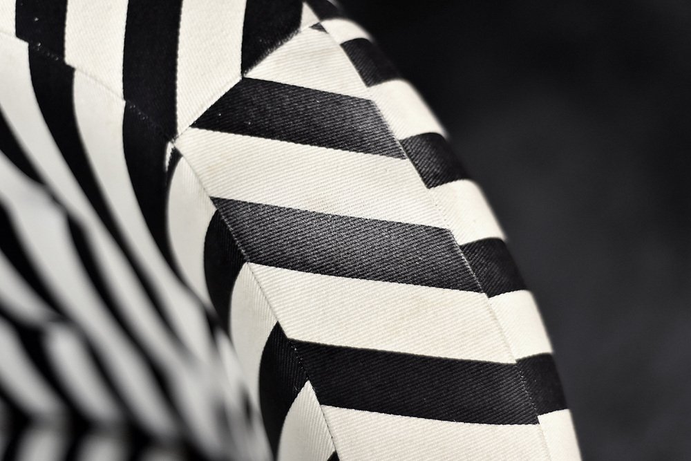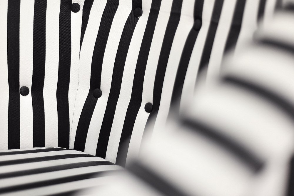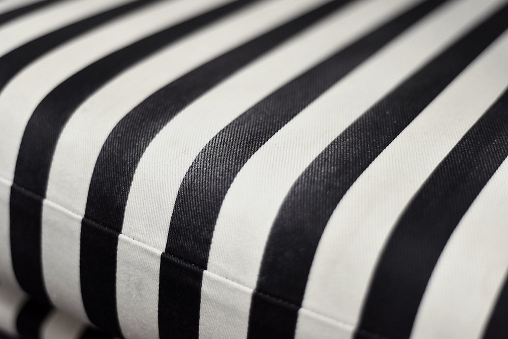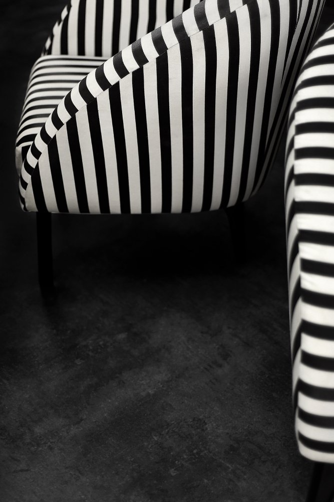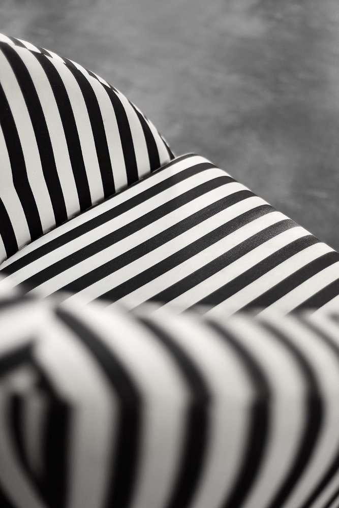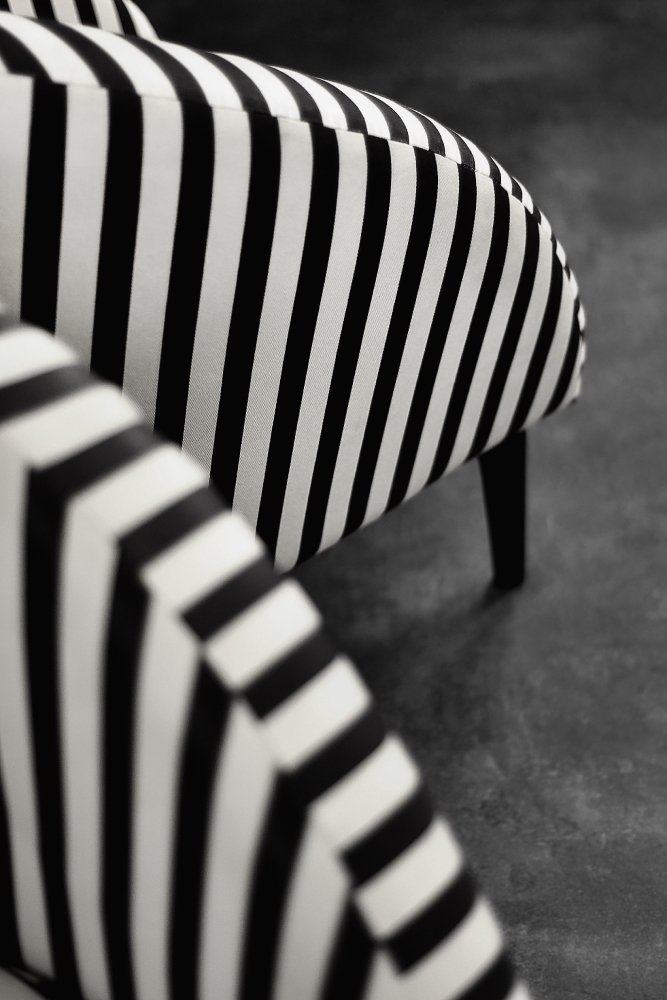 This set of two armchairs was made in Denmark during the 1960s. They are upholstered in a thick black and white striped fabric. Black and white is a classic, timeless color combination. In addition, the striped pattern due dynamics and brings variety to the interior. Contrasting opposition is one of the main advantages of furniture from the Mid-Century Modern era. The seats are low and have a rounded bucket shape. The seat cushion is loosely placed and the backrest is decorated with black buttons. The short legs are made of solid wood, finished in black. The armchairs will work well in both classic and modern interiors. This is a rare model whose design is appreciated by a growing group of connoisseurs of good design.