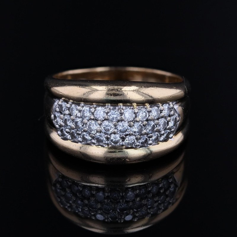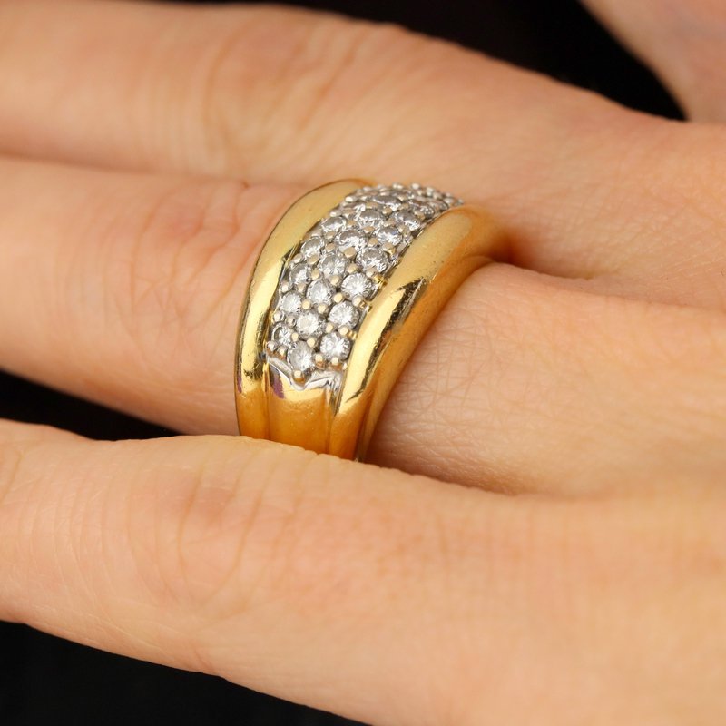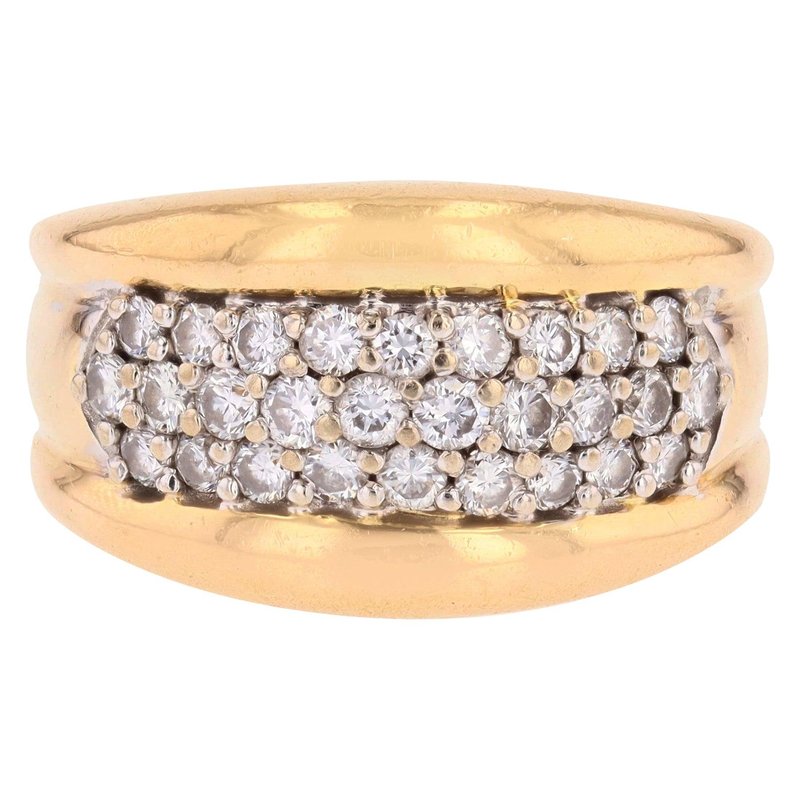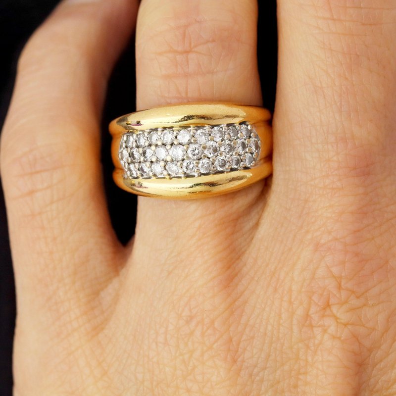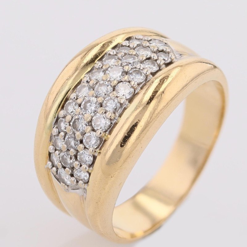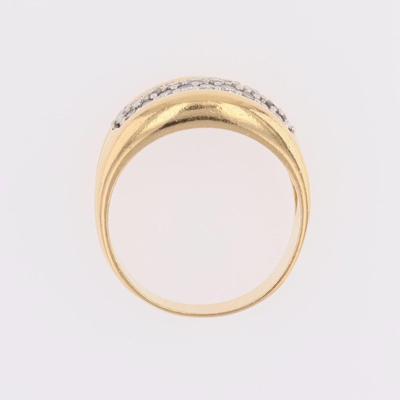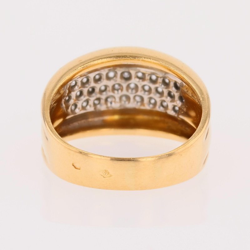 Ring in 18 karat yellow gold, eagle head hallmark. Elegant bangle ring, it is formed by a wide and curved ring on the top. 3 lines of modern brilliant cut diamonds are set with grains on top. Total weight of diamonds : 0.45 carat approximately. Height : 11.5 mm approximately, width of the pattern : 17.5 mm approximately, thickness : 3.5 mm approximately, width of the ring at the base : 4.3 mm approximately. Total weight of the jewel : 7,5 g approximately. US Size : 7,5 ; resizing possible. Second- hand jewelry - Very good condition - Very little worn - Fully checked and repolished. Our opinion : An antique diamond ring very easy to wear and with a beautiful presence on the hand.
