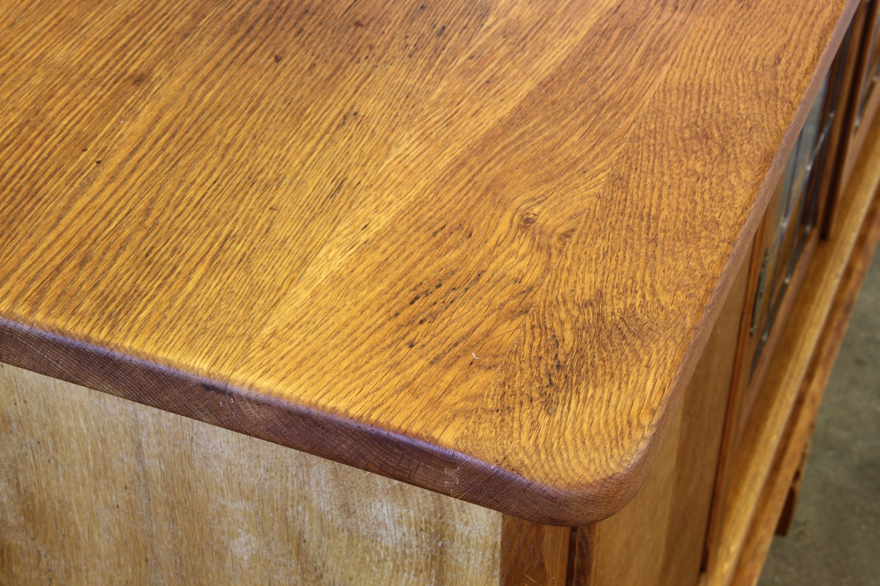 The wood surface shown a beautiful grain structure. Even though that the cabinet is big and heavy, it still feels slim and elegant. The squared dimensions of the item make it carm and warm in appearance. The 5 legs connected with and low beam gives a sence of strength and stability to it and brings the furniture together. The carvings in the frame and the legs toegther with the straight lines, glass doors, flat surfaces and squared design, gives it a good look for a moderne home, where soul and vintage style is wanted.
