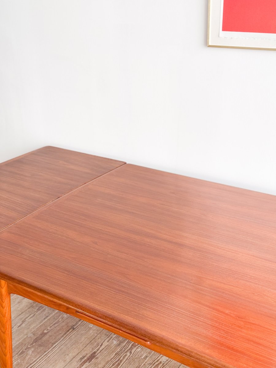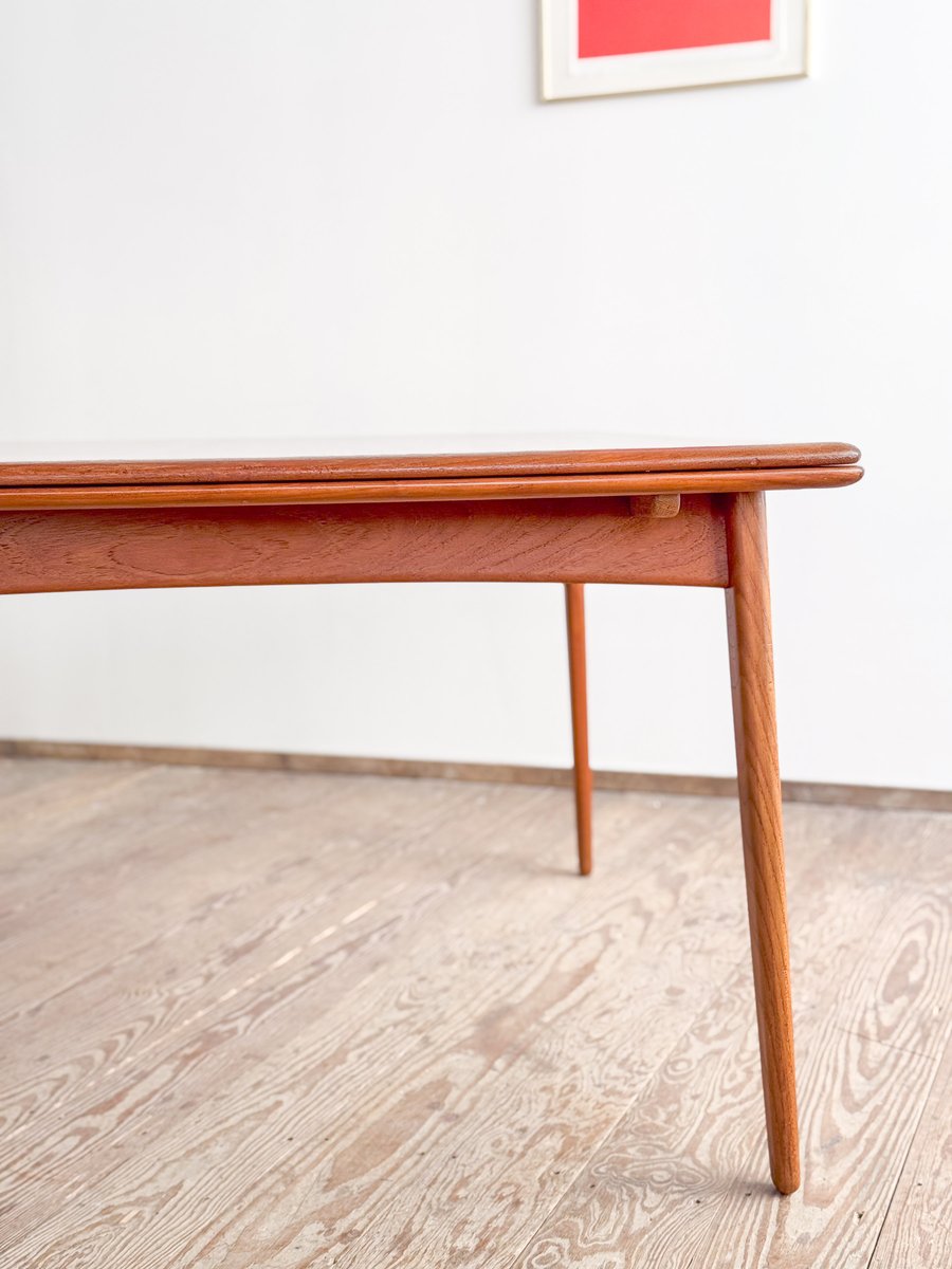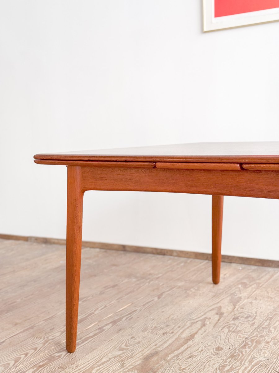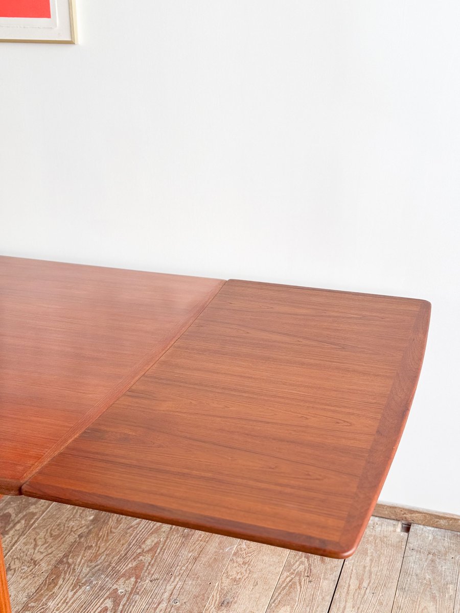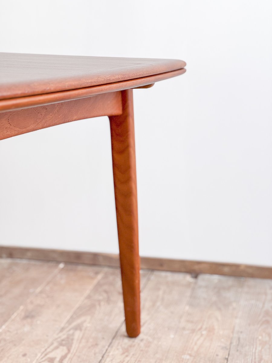 Dieser sehr elegante dänische Esstisch wurde vermutlich in Dänemark entworfen und gefertigt. Der Mid Century Tisch ist aus Teak-Holz gefertigt und überzeugt durch seine sehr besondere Breite und das schön detaillierte Tischgestell. Der Tisch ist an den Tisch-Enden etwas heraus gewölbt, ein weitere schönes Detail, das dem Tisch eine gewisse Spannung verleiht. Die Erweiterungplatten sind etwas angeschrägt, wodurch der Spalt zwischen den Platten minimiert wird.