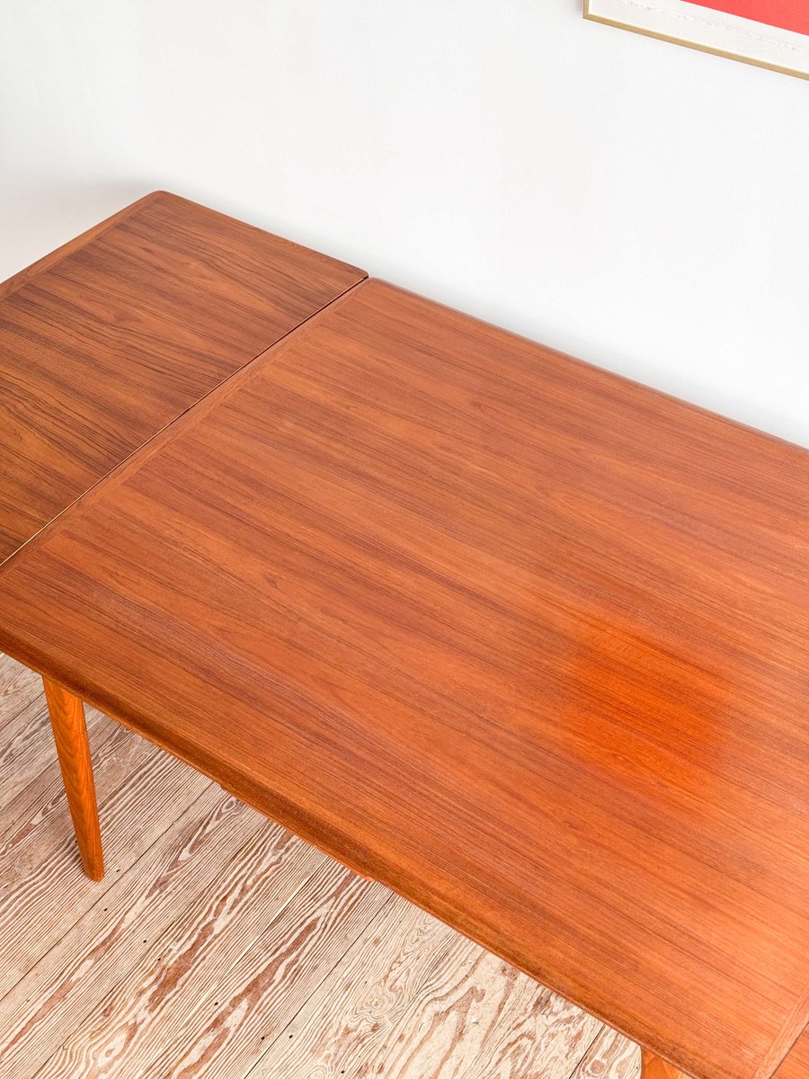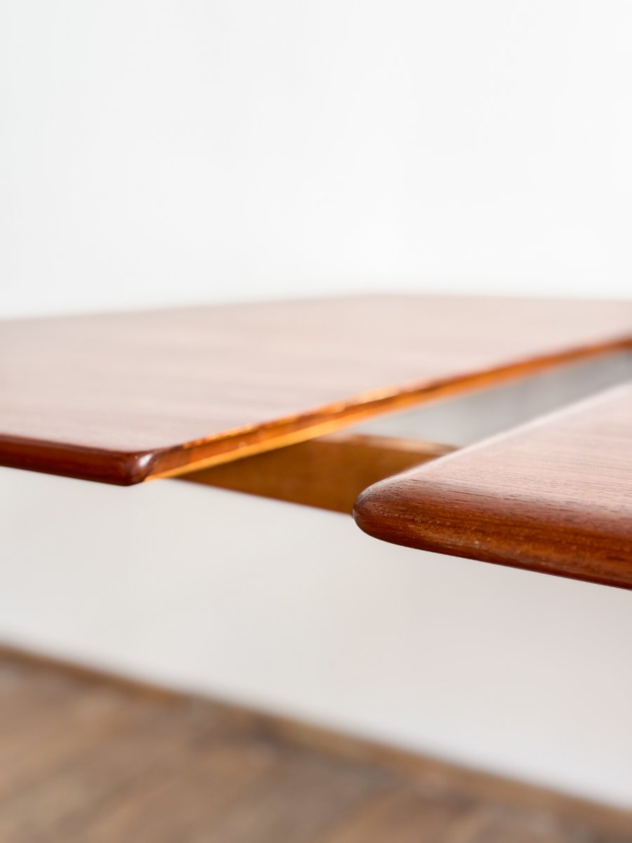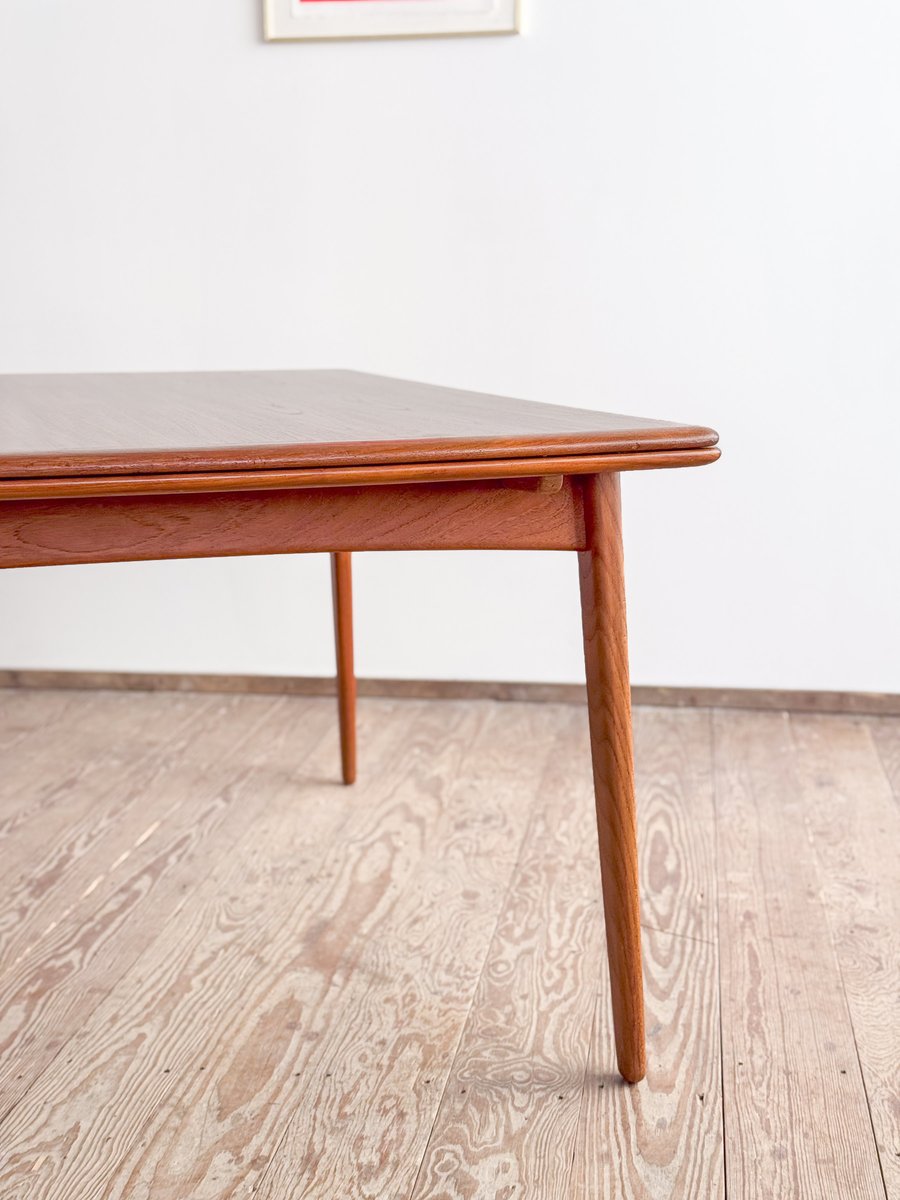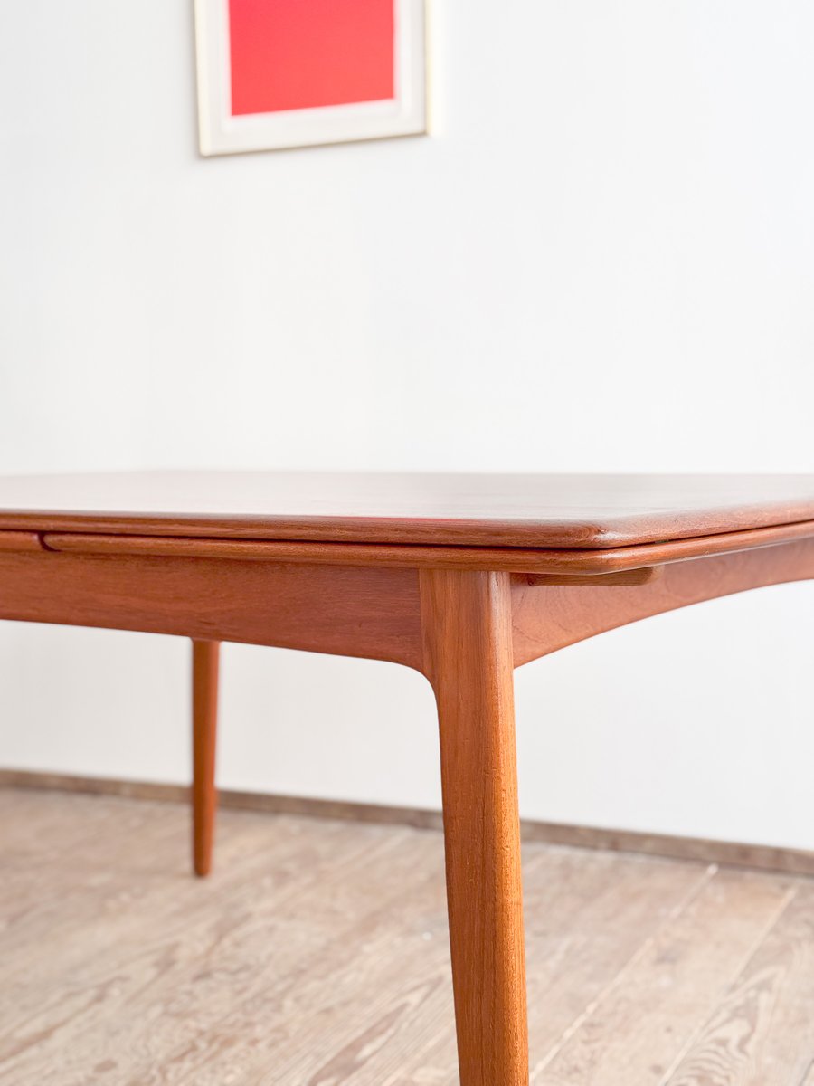 Dieser sehr elegante dänische Esstisch wurde vermutlich in Dänemark entworfen und gefertigt. Der Mid Century Tisch ist aus Teak-Holz gefertigt und überzeugt durch seine sehr besondere Breite und das schön detaillierte Tischgestell. Der Tisch ist an den Tisch-Enden etwas heraus gewölbt, ein weitere schönes Detail, das dem Tisch eine gewisse Spannung verleiht. Die Erweiterungplatten sind etwas angeschrägt, wodurch der Spalt zwischen den Platten minimiert wird.