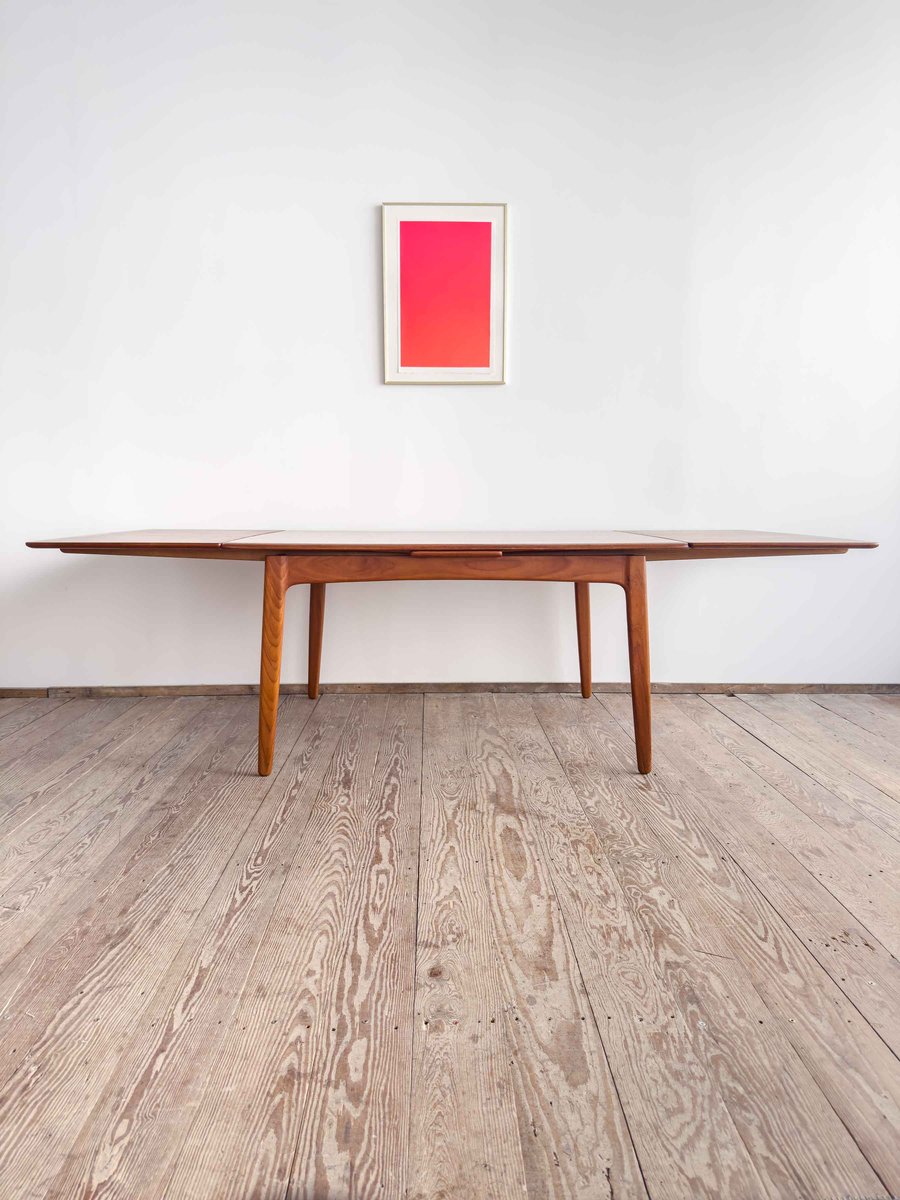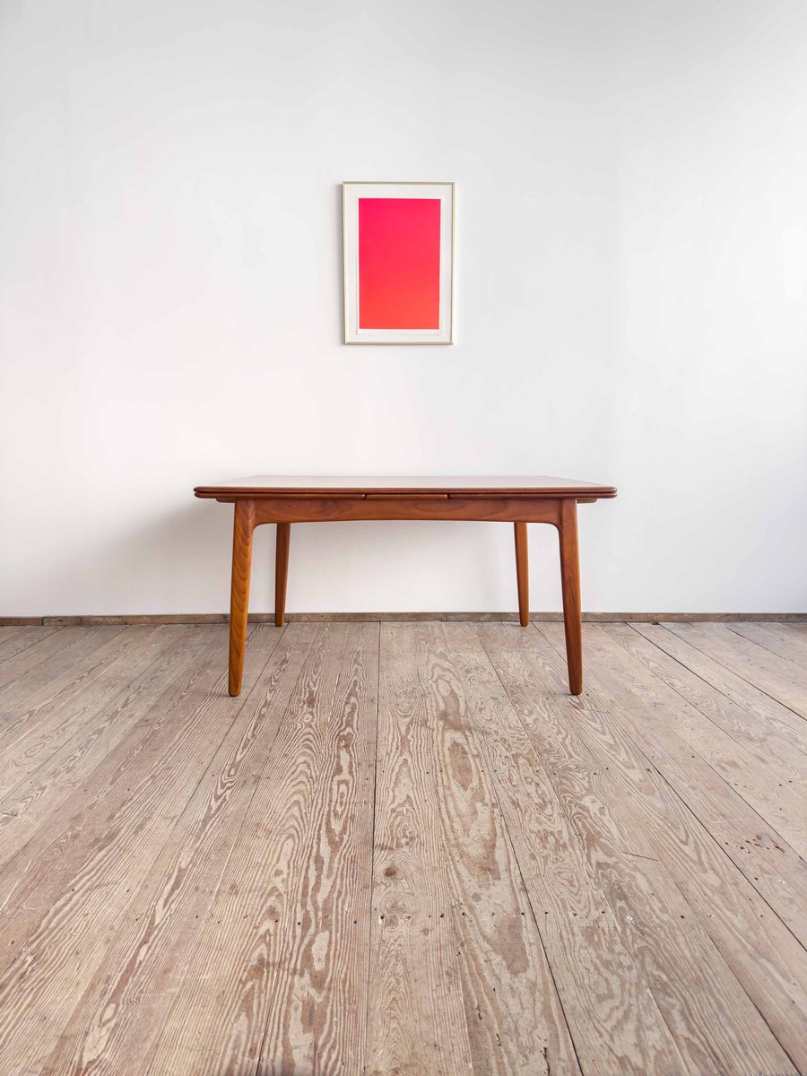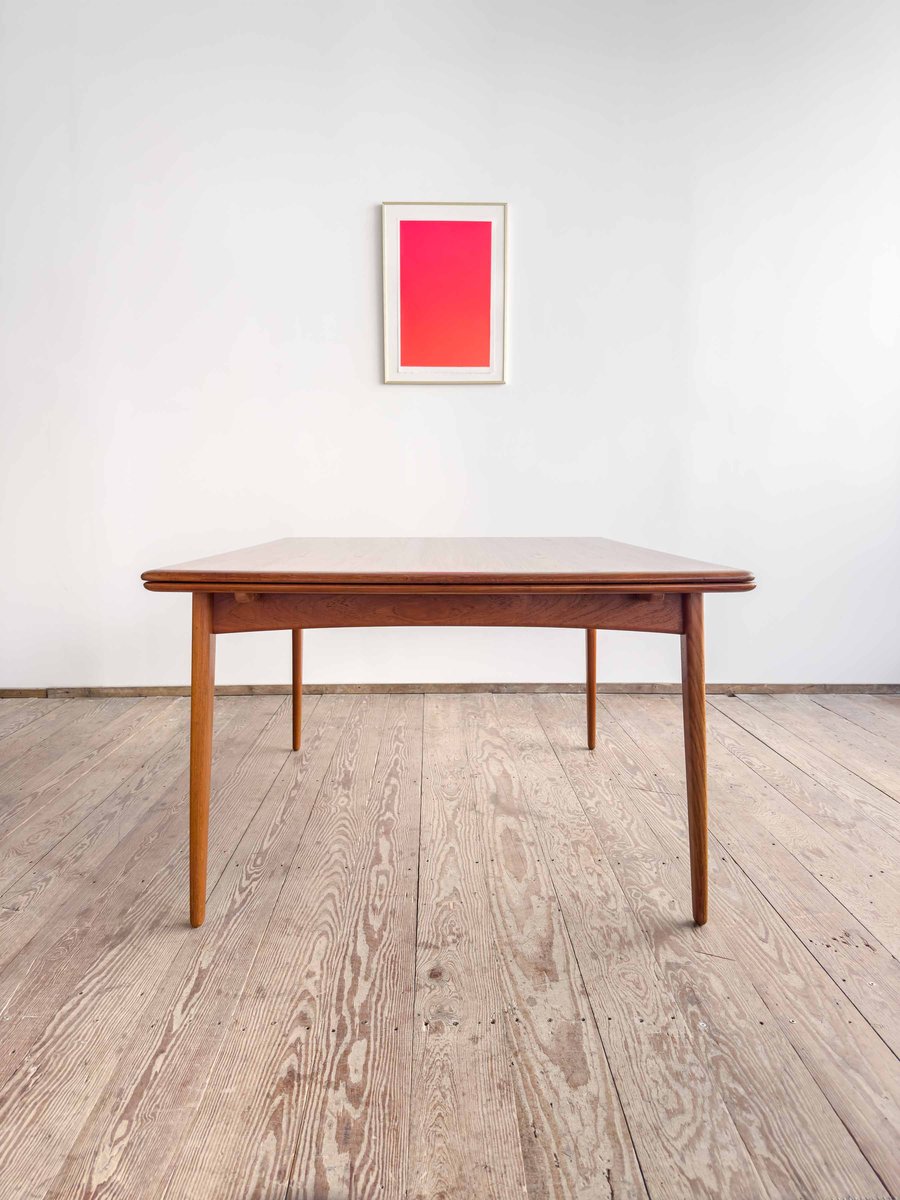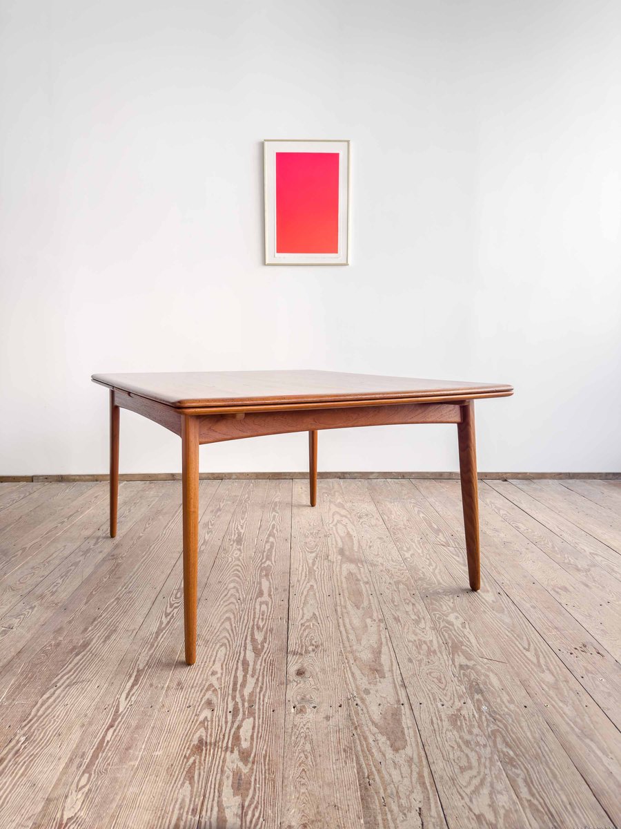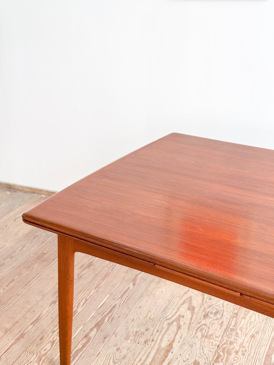 Dieser sehr elegante dänische Esstisch wurde vermutlich in Dänemark entworfen und gefertigt. Der Mid Century Tisch ist aus Teak-Holz gefertigt und überzeugt durch seine sehr besondere Breite und das schön detaillierte Tischgestell. Der Tisch ist an den Tisch-Enden etwas heraus gewölbt, ein weitere schönes Detail, das dem Tisch eine gewisse Spannung verleiht. Die Erweiterungplatten sind etwas angeschrägt, wodurch der Spalt zwischen den Platten minimiert wird.
