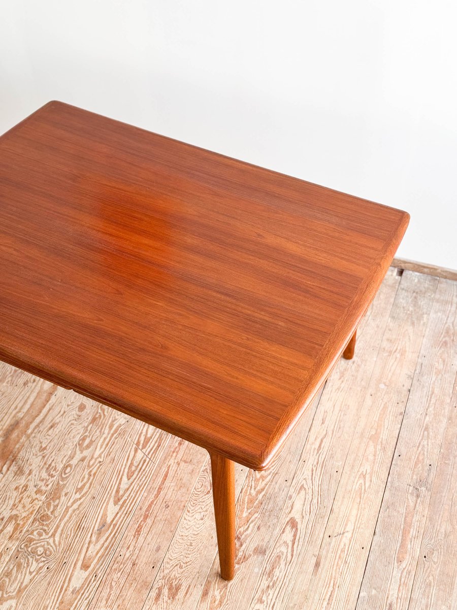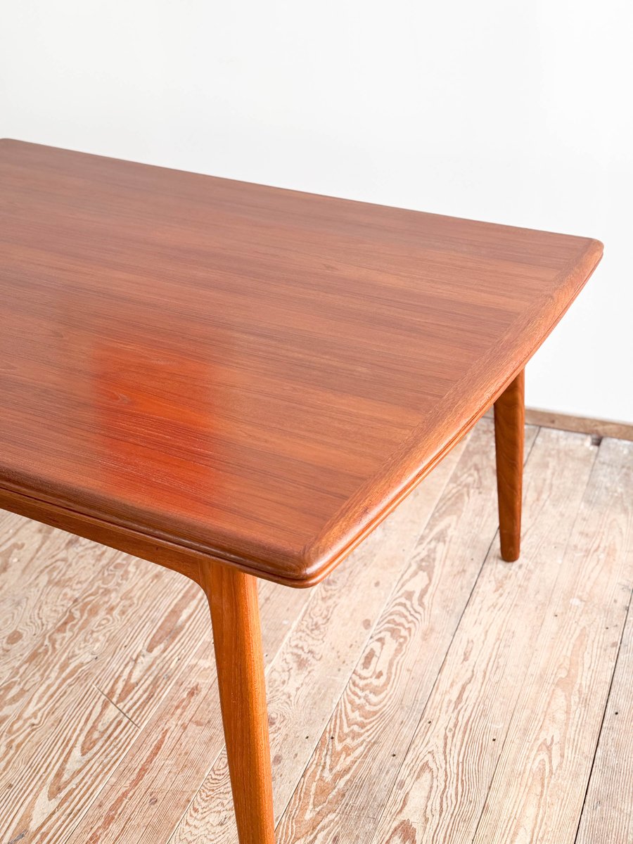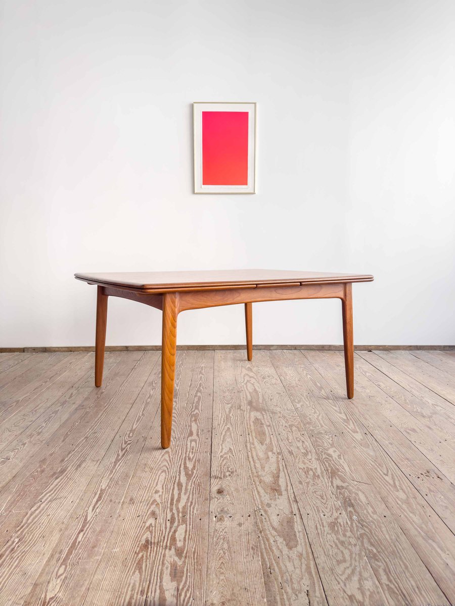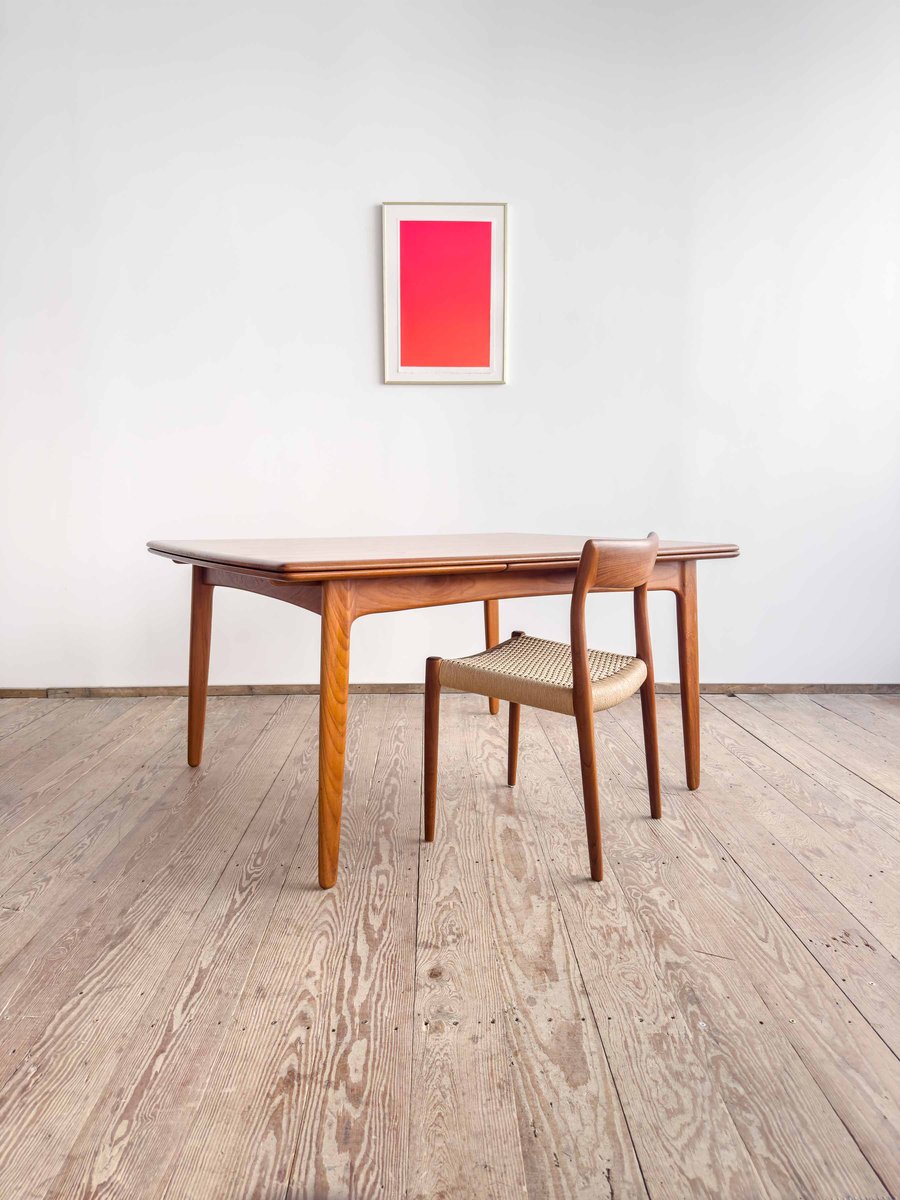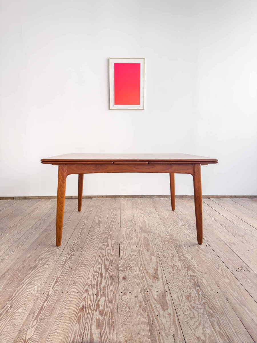 Dieser sehr elegante dänische Esstisch wurde vermutlich in Dänemark entworfen und gefertigt. Der Mid Century Tisch ist aus Teak-Holz gefertigt und überzeugt durch seine sehr besondere Breite und das schön detaillierte Tischgestell. Der Tisch ist an den Tisch-Enden etwas heraus gewölbt, ein weitere schönes Detail, das dem Tisch eine gewisse Spannung verleiht. Die Erweiterungplatten sind etwas angeschrägt, wodurch der Spalt zwischen den Platten minimiert wird.