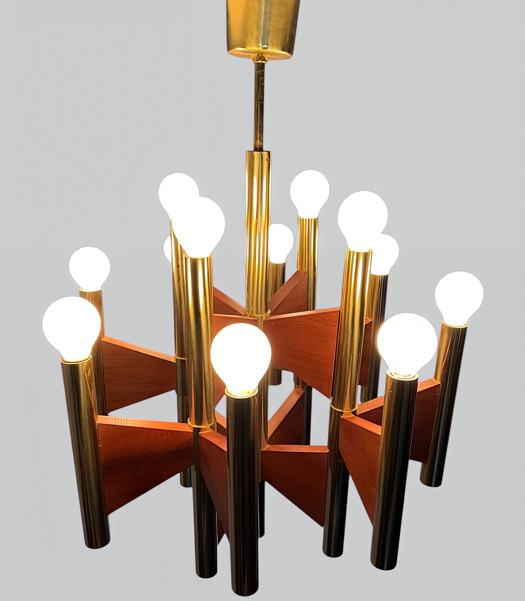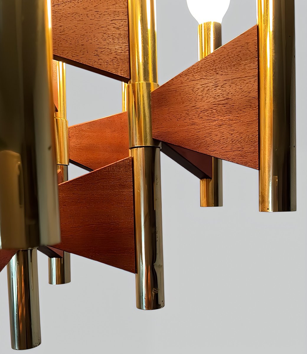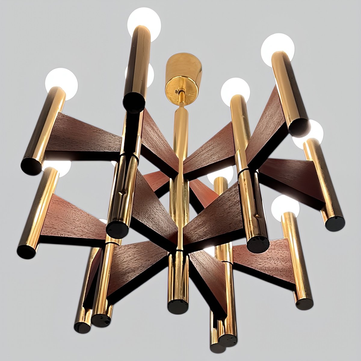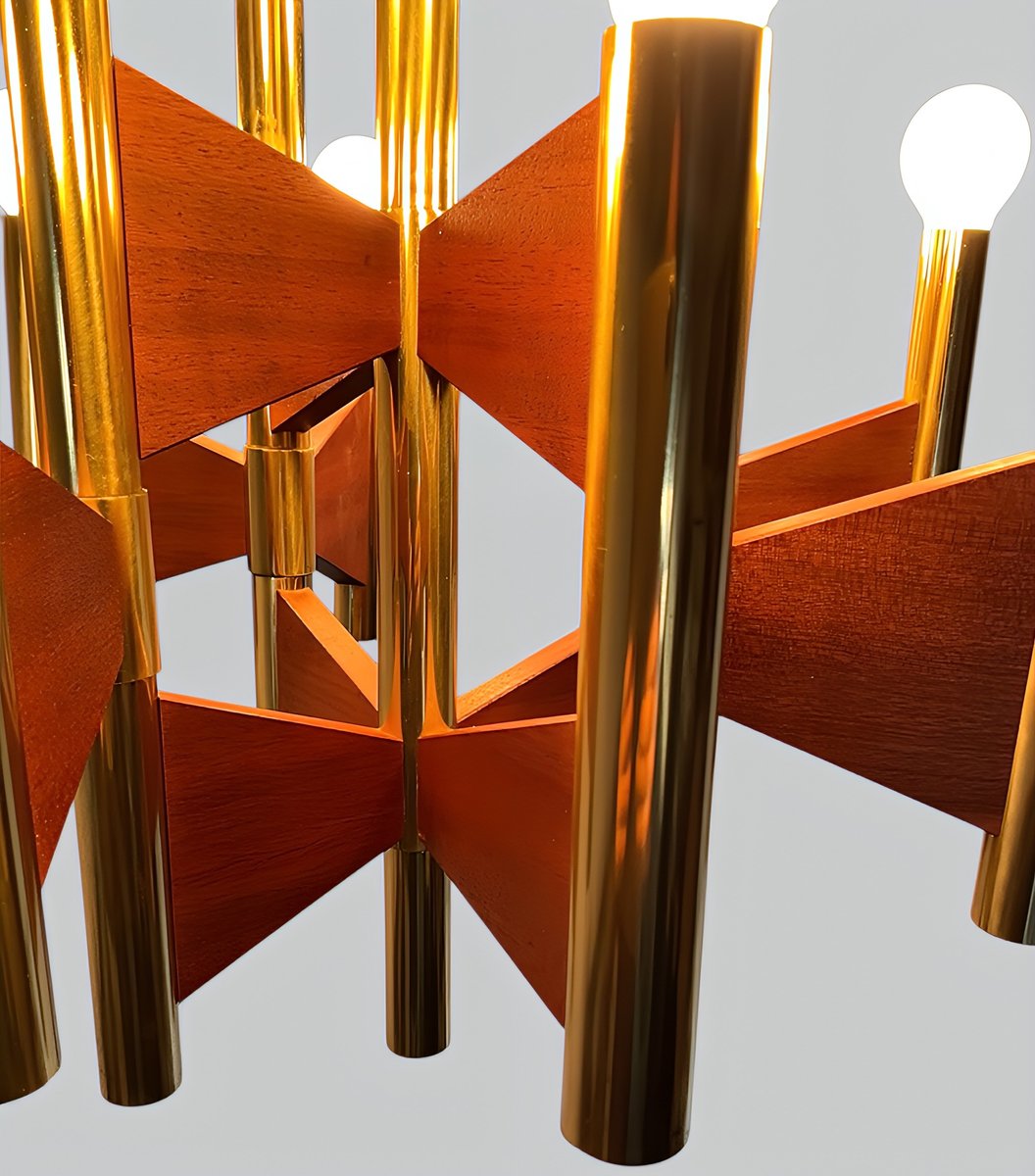 + The chandelier has 12 cylindrical, gold-plated brass and steel tube lamp holders/arms, which are additionally – and exceptionally – supported by geometrically shaped, thin teakwood plates.