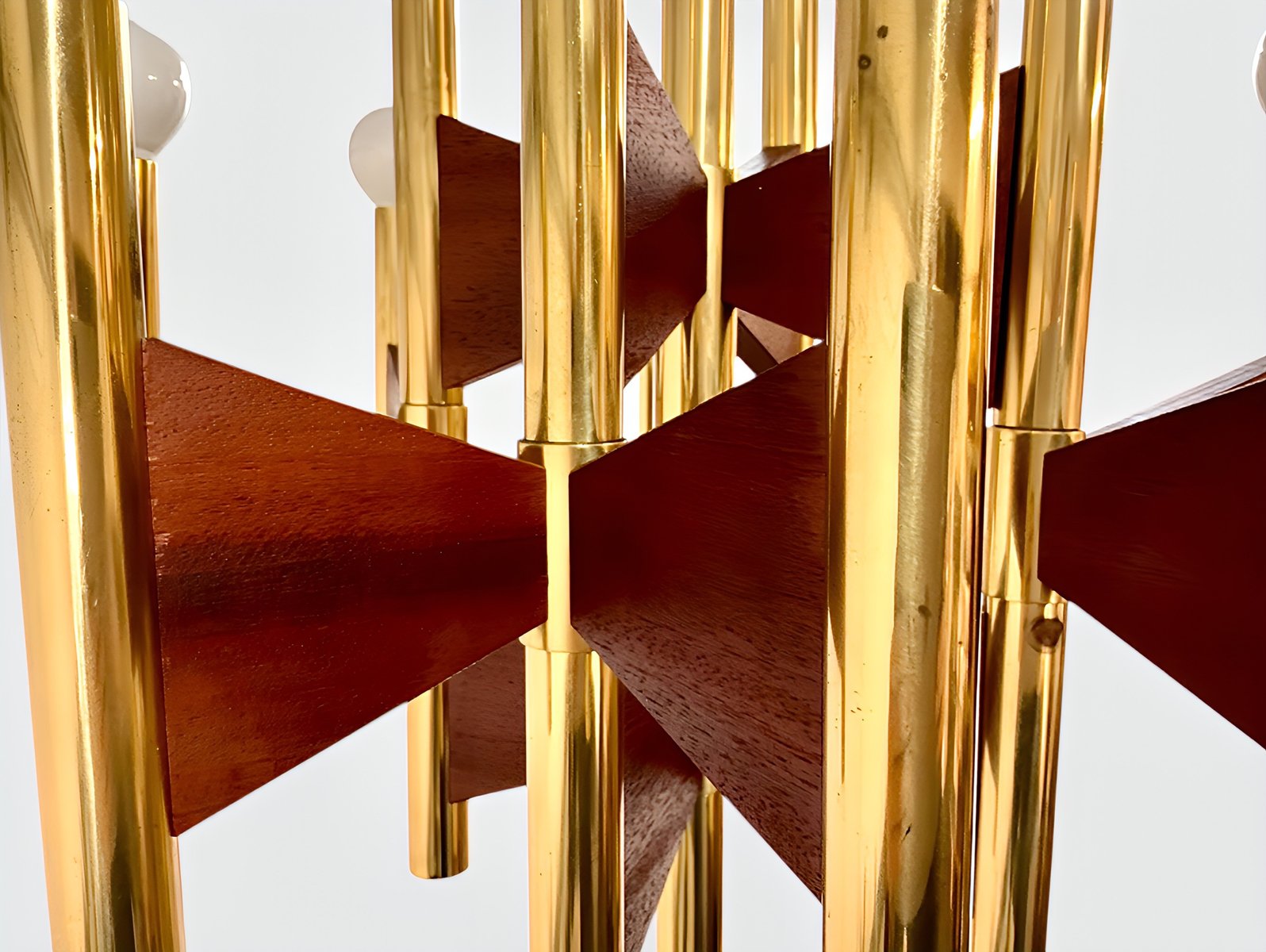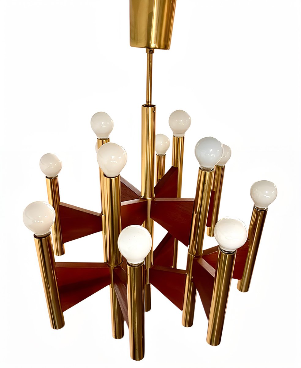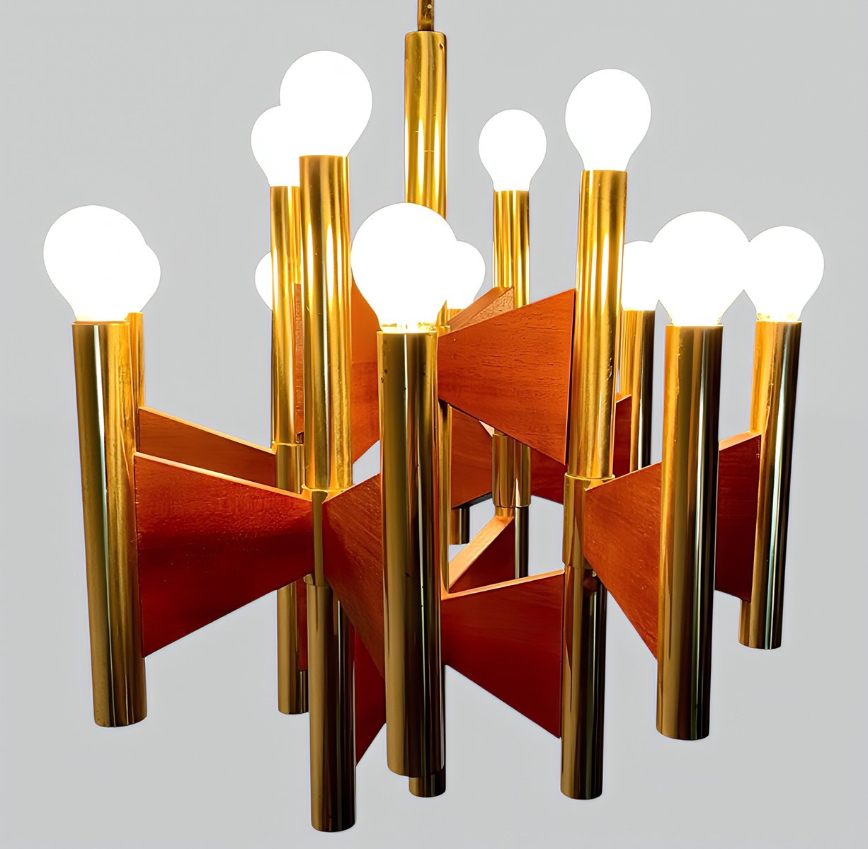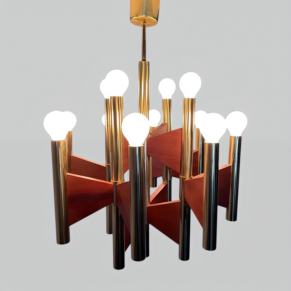 + The chandelier has 12 cylindrical, gold-plated brass and steel tube lamp holders/arms, which are additionally – and exceptionally – supported by geometrically shaped, thin teakwood plates.