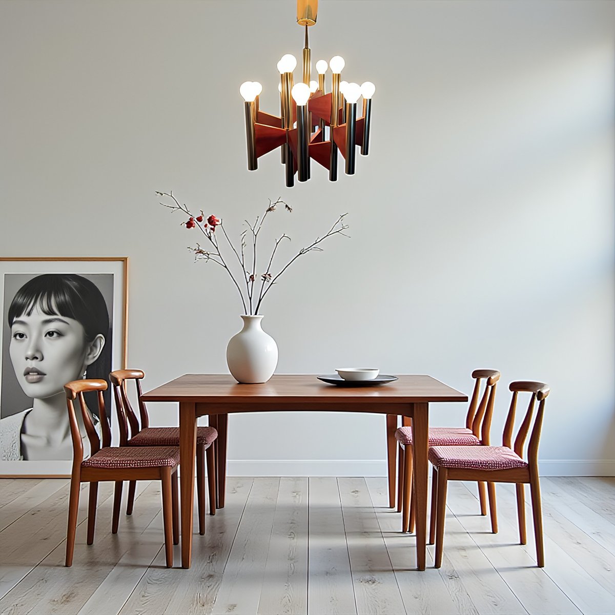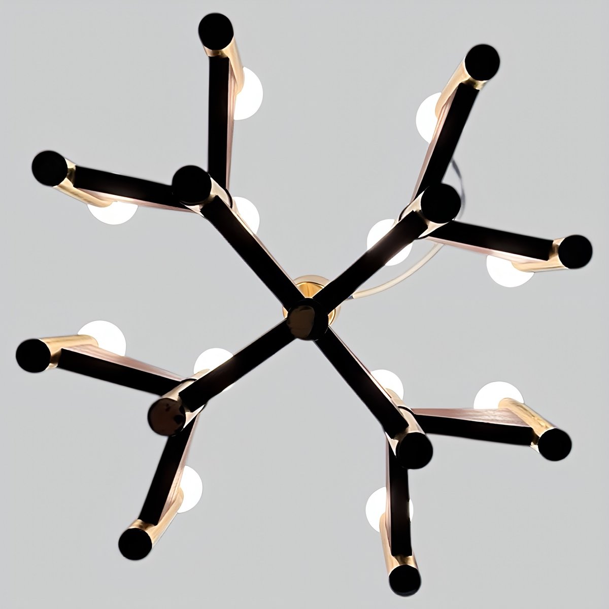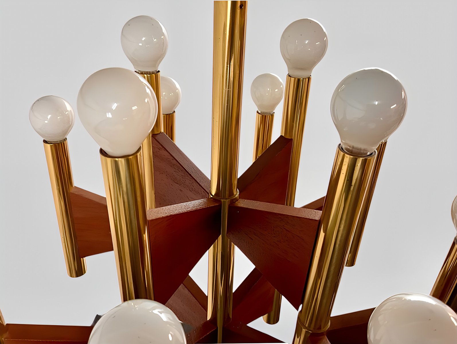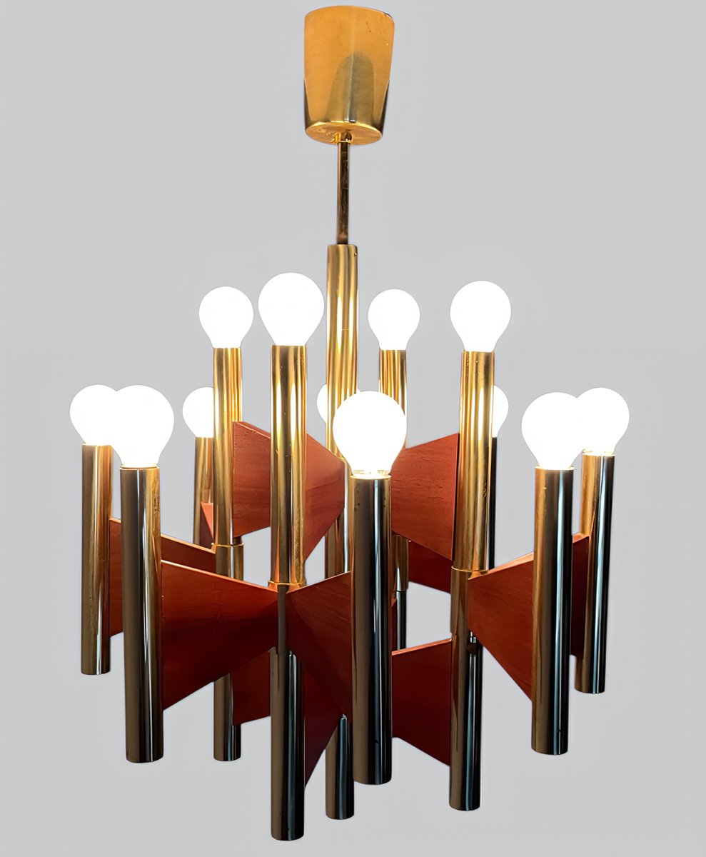 + The chandelier has 12 cylindrical, gold-plated brass and steel tube lamp holders/arms, which are additionally – and exceptionally – supported by geometrically shaped, thin teakwood plates.