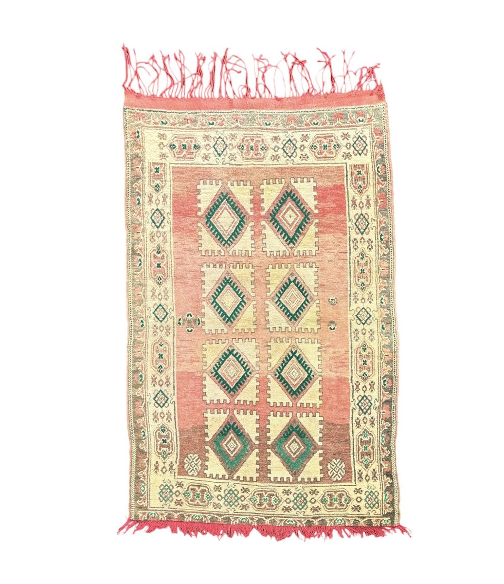 mit seinen leuchtenden Rot-, Rosa-, Orange- und Beigetönen sticht dieser Boujad-Teppich mit seinen kühnen geometrischen Mustern und einem Hauch von Abstraktion hervor.