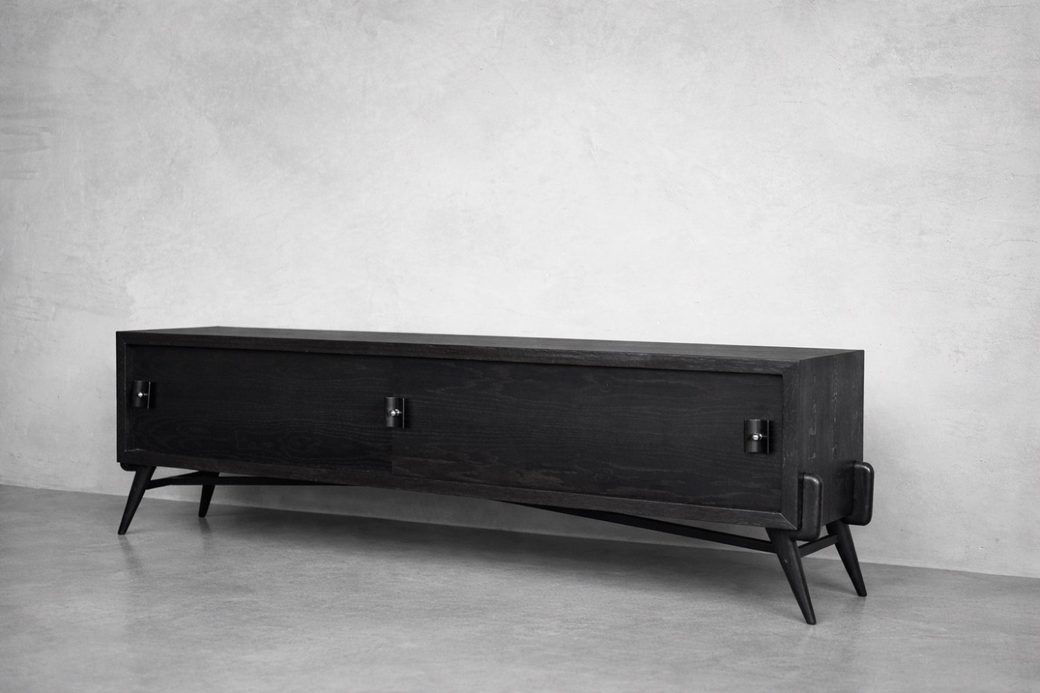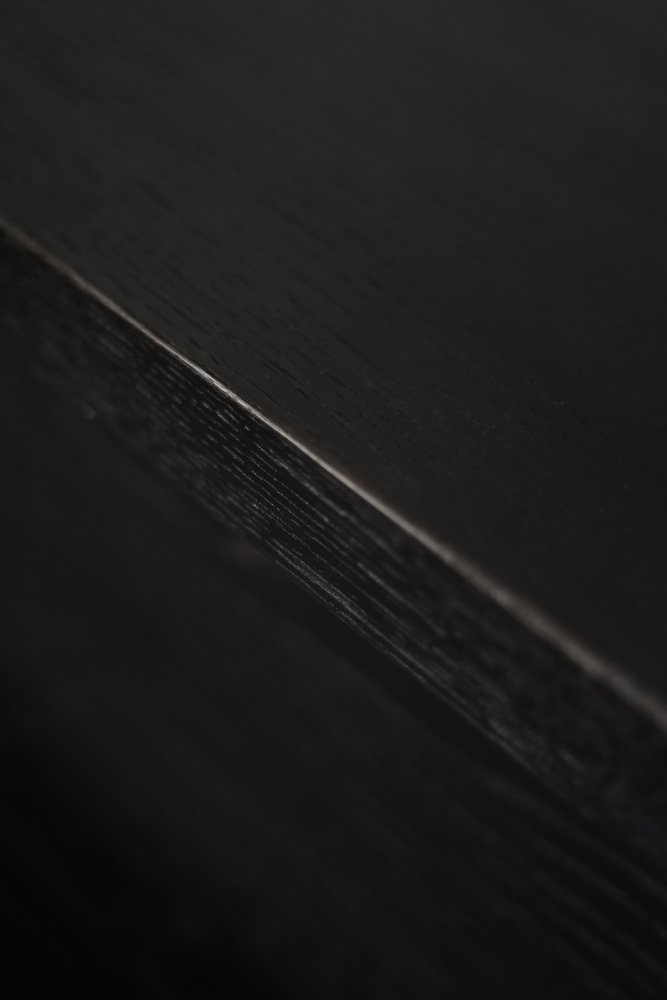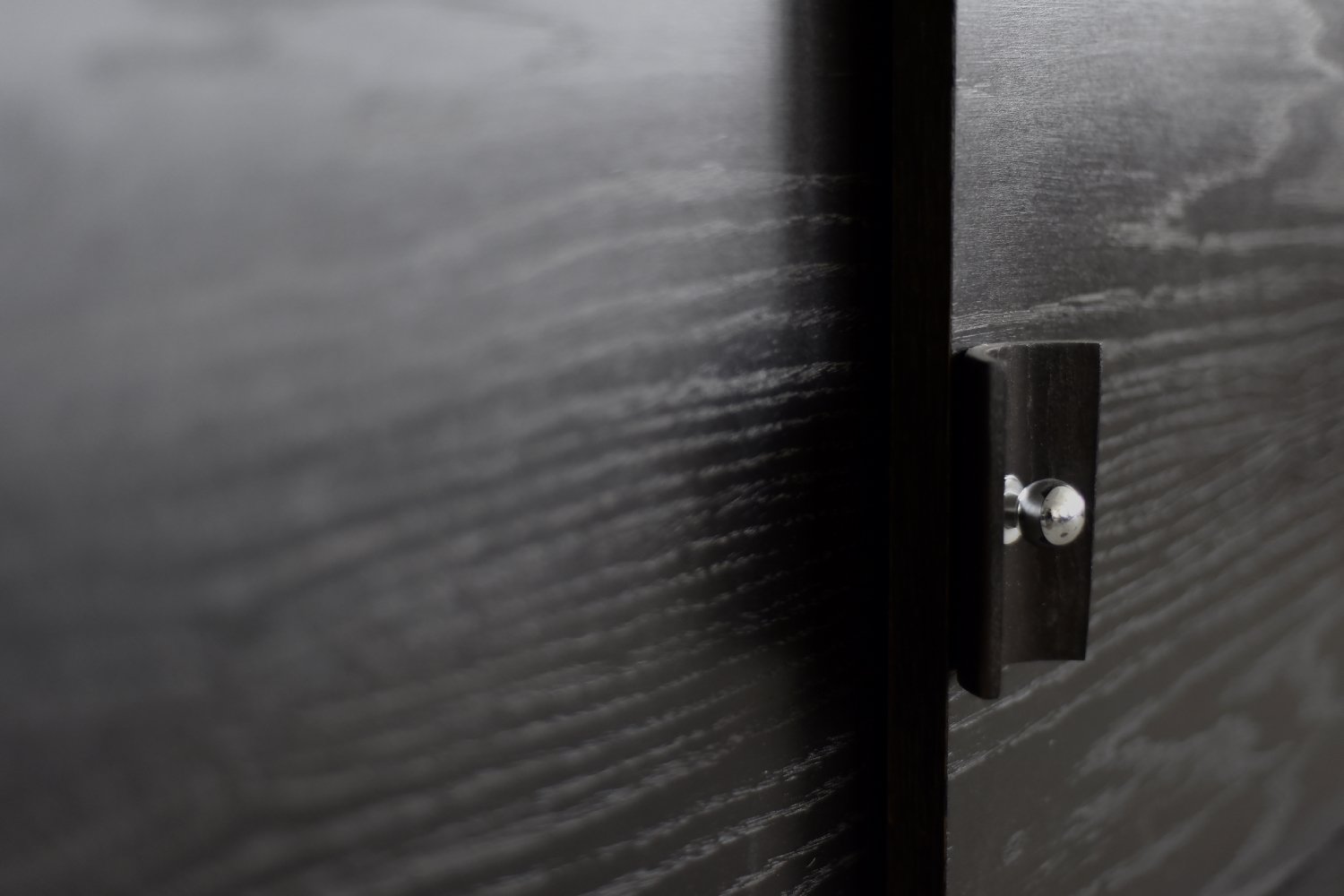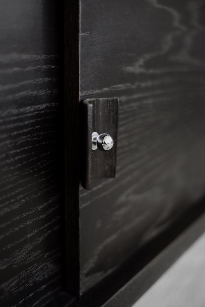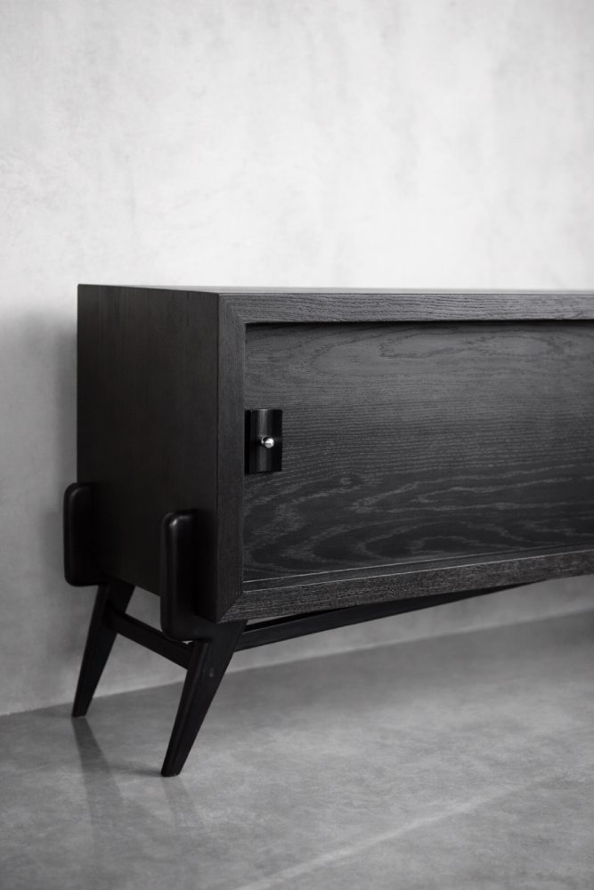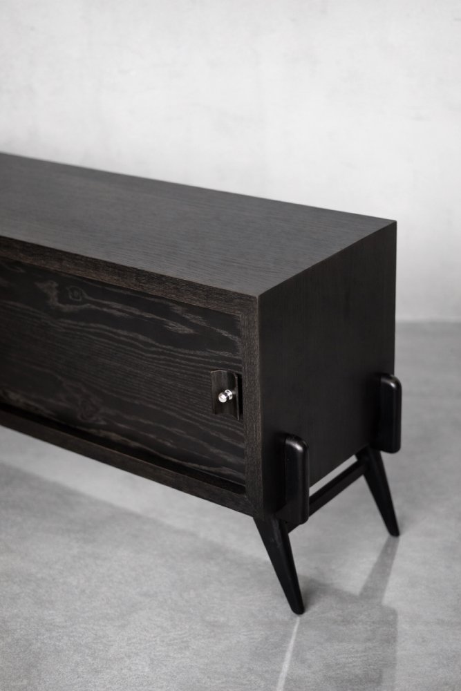 This modernist sideboard was made in Scandinavia during the 1960s. It was made of oak wood, which is considered royal wood. It is a very strong and durable material with rich grain. The wood is resistant to scratches and damage, and becomes noble with age. This sideboard is finished in a dark, varied color. from brownish tones to intense dark brown, which, depending on the angle of light, may give the impression of black. The strong, patterned grain flows harmoniously here. This creates a stuning visual effect. The front is a pair of sliding doors. There is one shelf and empty space inside. The geometric handles are made of wood supplemented with a metal ball. Elegant wooden legs perfectly match the sideboard. The multi-dimensional design of the furniture, materials used, non-obvious color and workmanship with the utmost care make it an extremely interesting object that will fit into many arrangements, from industrial to modern interiors.