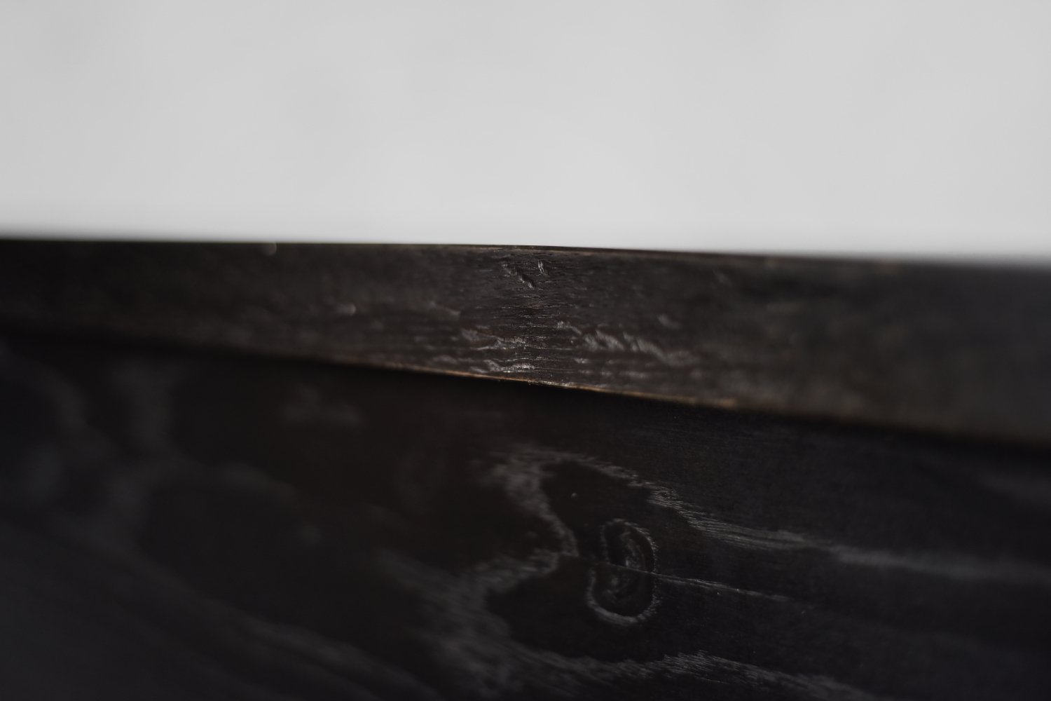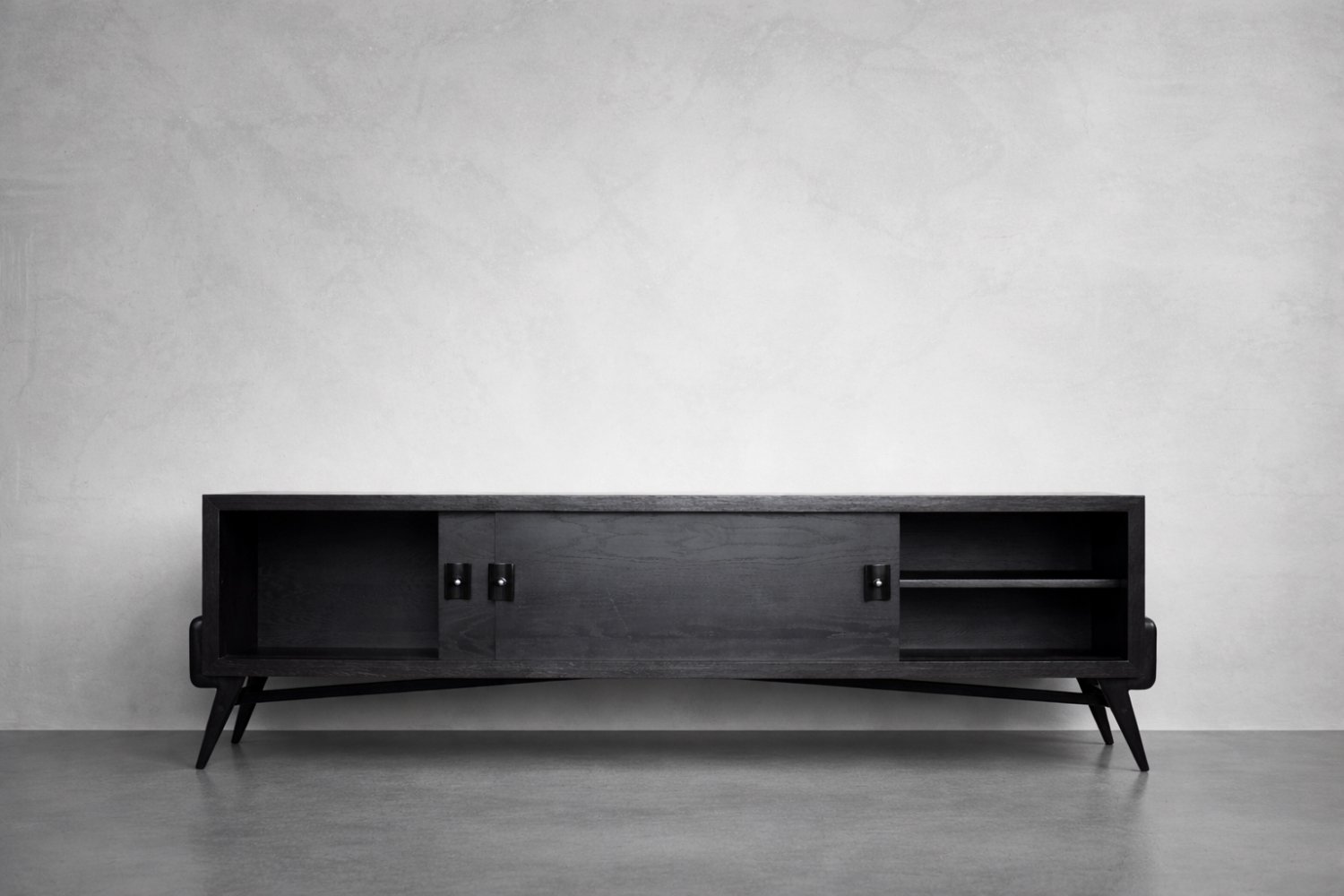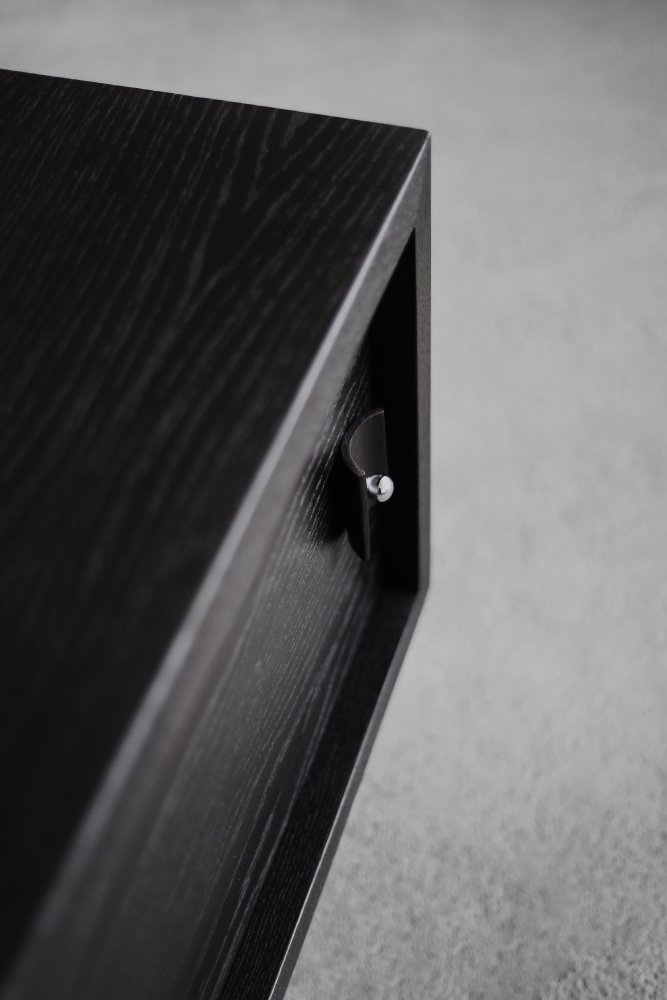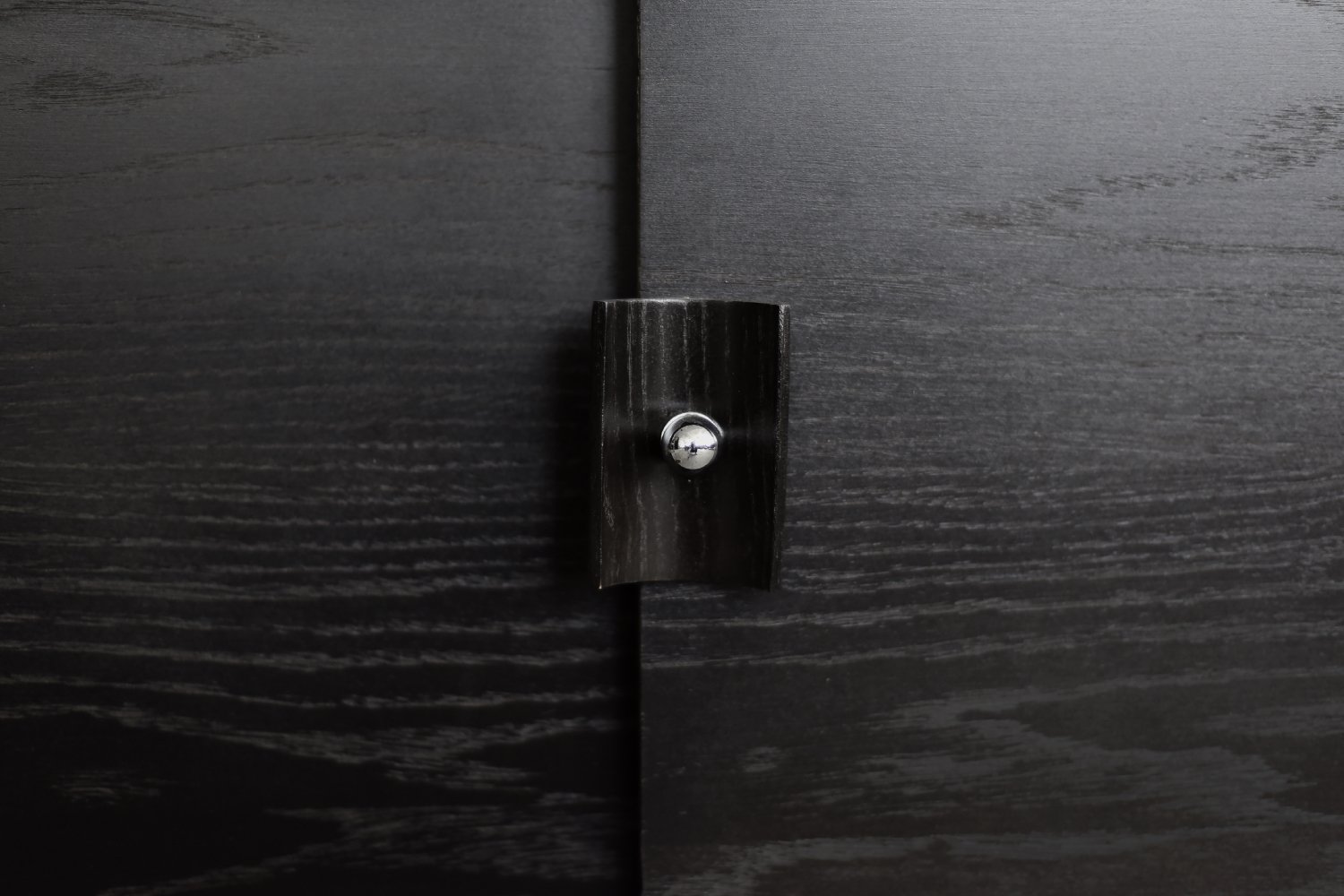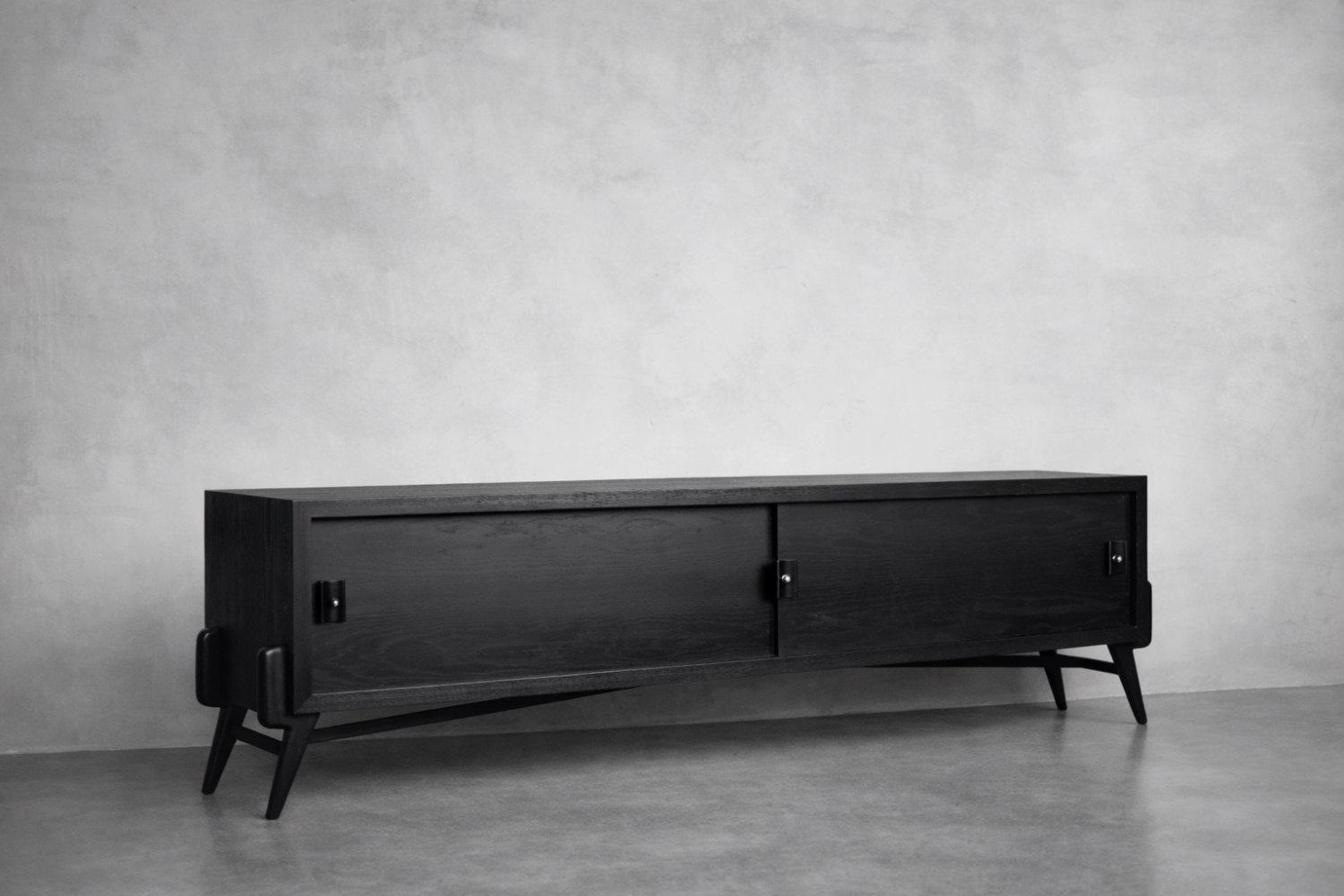 This modernist sideboard was made in Scandinavia during the 1960s. It was made of oak wood, which is considered royal wood. It is a very strong and durable material with rich grain. The wood is resistant to scratches and damage, and becomes noble with age. This sideboard is finished in a dark, varied color. from brownish tones to intense dark brown, which, depending on the angle of light, may give the impression of black. The strong, patterned grain flows harmoniously here. This creates a stuning visual effect. The front is a pair of sliding doors. There is one shelf and empty space inside. The geometric handles are made of wood supplemented with a metal ball. Elegant wooden legs perfectly match the sideboard. The multi-dimensional design of the furniture, materials used, non-obvious color and workmanship with the utmost care make it an extremely interesting object that will fit into many arrangements, from industrial to modern interiors.