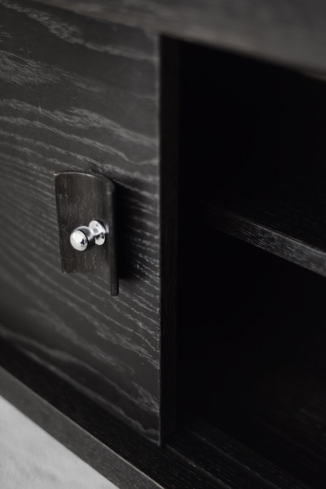 Dieses modernistische Sideboard wurde in den 1960er Jahren in Skandinavien hergestellt. Es wurde aus Eichenholz gefertigt, das als königliches Holz gilt. Es ist ein sehr starkes und langlebiges Material mit einer reichen Maserung. Das Holz ist widerstandsfähig gegen Kratzer und Beschädigungen und wird mit zunehmendem Alter immer edler. Dieses Sideboard ist in einer dunklen, abwechslungsreichen Farbe gehalten, die von bräunlichen Tönen bis zu intensivem Dunkelbraun reicht und je nach Lichteinfall den Eindruck von Schwarz vermitteln kann. Die kräftige, gemusterte Maserung verläuft hier harmonisch. Dies sorgt für einen atemberaubenden visuellen Effekt. Die Vorderseite besteht aus zwei Schiebetüren. Im Inneren befindet sich ein Regal und ein leerer Raum. Die geometrischen Griffe sind aus Holz gefertigt und mit einer Metallkugel ergänzt. Die eleganten Holzbeine passen perfekt zum Sideboard. Das multidimensionale Design der Möbel, die verwendeten Materialien, die ungewöhnliche Farbe und die sorgfältige Verarbeitung machen es zu einem äußerst interessanten Objekt, das sich in viele Einrichtungen einfügt, von industriellen bis hin zu modernen Interieurs. Das Sideboard wurde restauriert und befindet sich in einem sehr guten Vintage-Zustand.