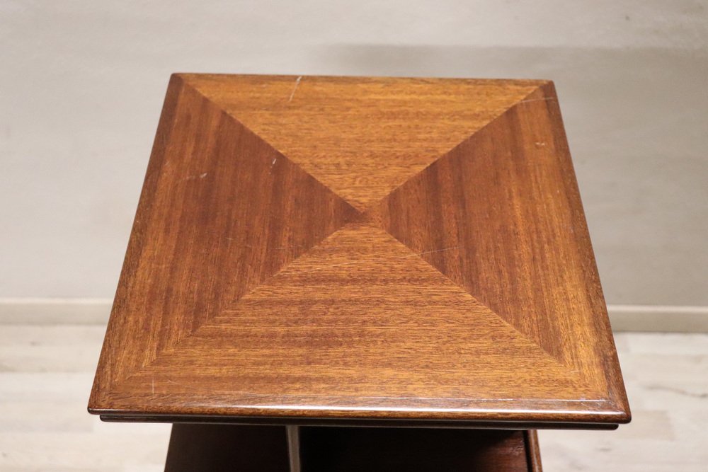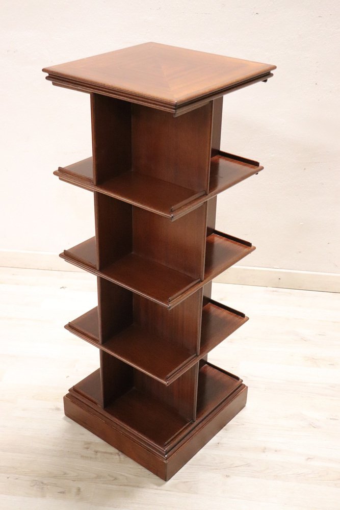 Das Bücherregal wird mit einem Zertifikat geliefert, das bescheinigt, dass das verwendete Holz nicht zu den geschützten Hölzern des Anhangs A gehört. Es handelt sich um ein wunderschönes und raffiniertes Möbelstück aus der Mitte des Jahrhunderts. Das unverwechselbare italienische Design der 1960er Jahre kommt in diesem drehbaren Bücherregal deutlich zum Ausdruck. Es besteht aus Holzfurnier und verfügt über modulare Regalböden, die sich vertikal ausziehen lassen und insgesamt fünf Ebenen bieten. Es weist keine Fertigungsspuren auf, aber die Qualität des Materials und das Design sind ausgezeichnet. Sein Design ist auch von ähnlichen Stücken des berühmten italienischen Designers Gianfranco Frattini inspiriert. Mit fünf verfügbaren Regalböden eignet sich dieses freistehende drehbare Bücherregal, obwohl es für Bücher konzipiert ist, auch hervorragend zur Präsentation einer Sammlung wertvoller Objekte wie kleiner Vasen oder Keramiken. Auf dem Foto ist es mit einer atemberaubenden Sammlung von Murano-Glasvasen kombiniert, wodurch dieses Bücherregal zum Blickfang des Raumes wird.