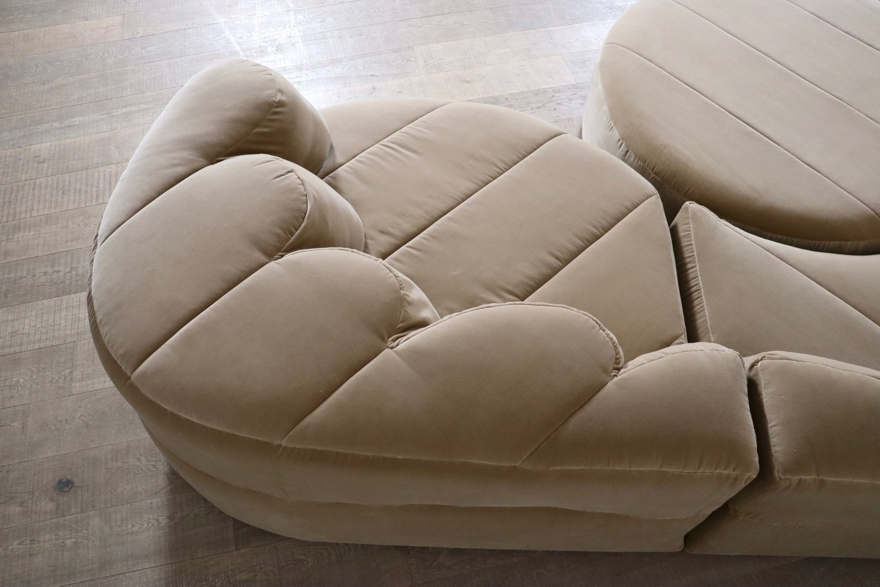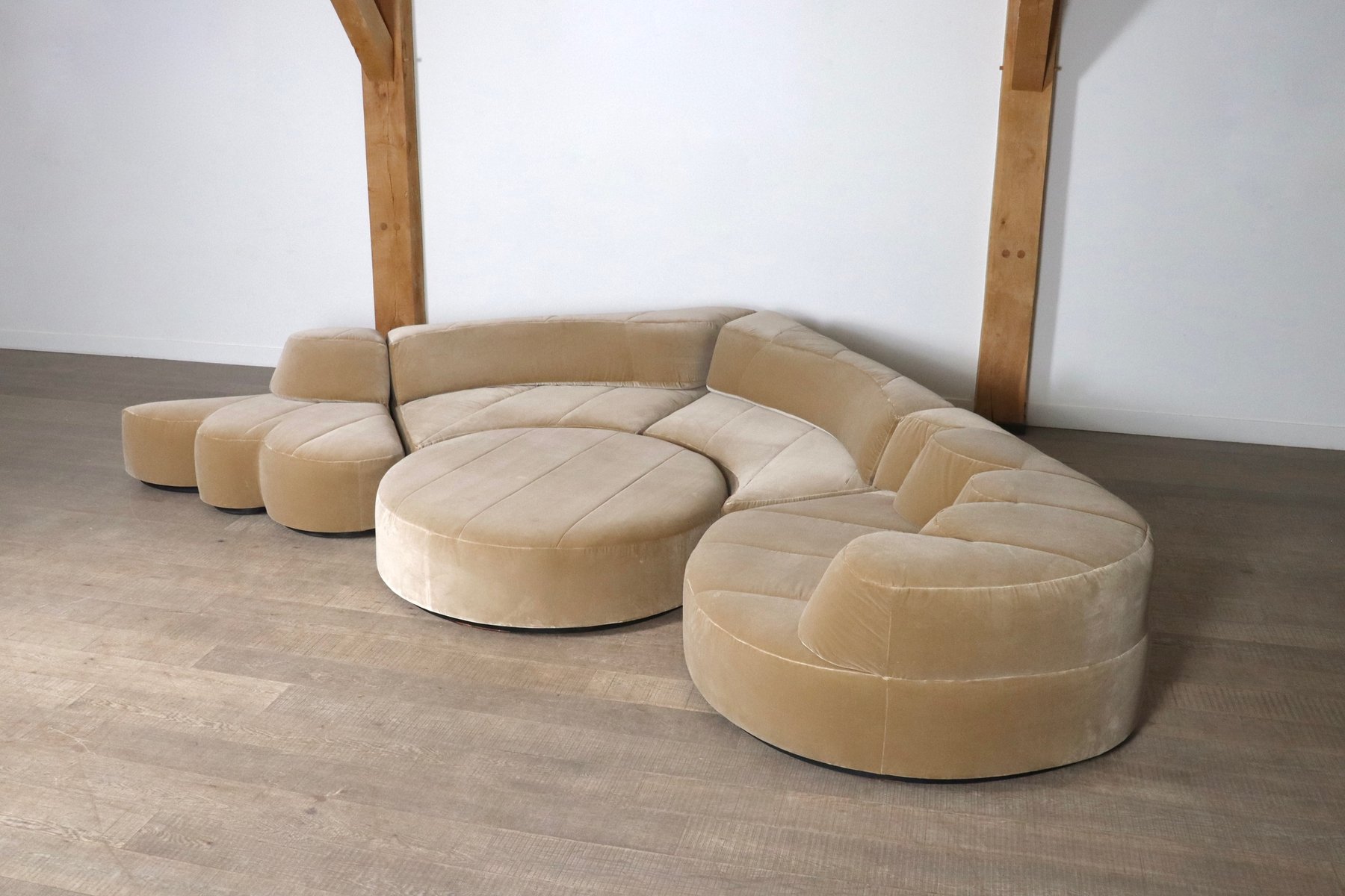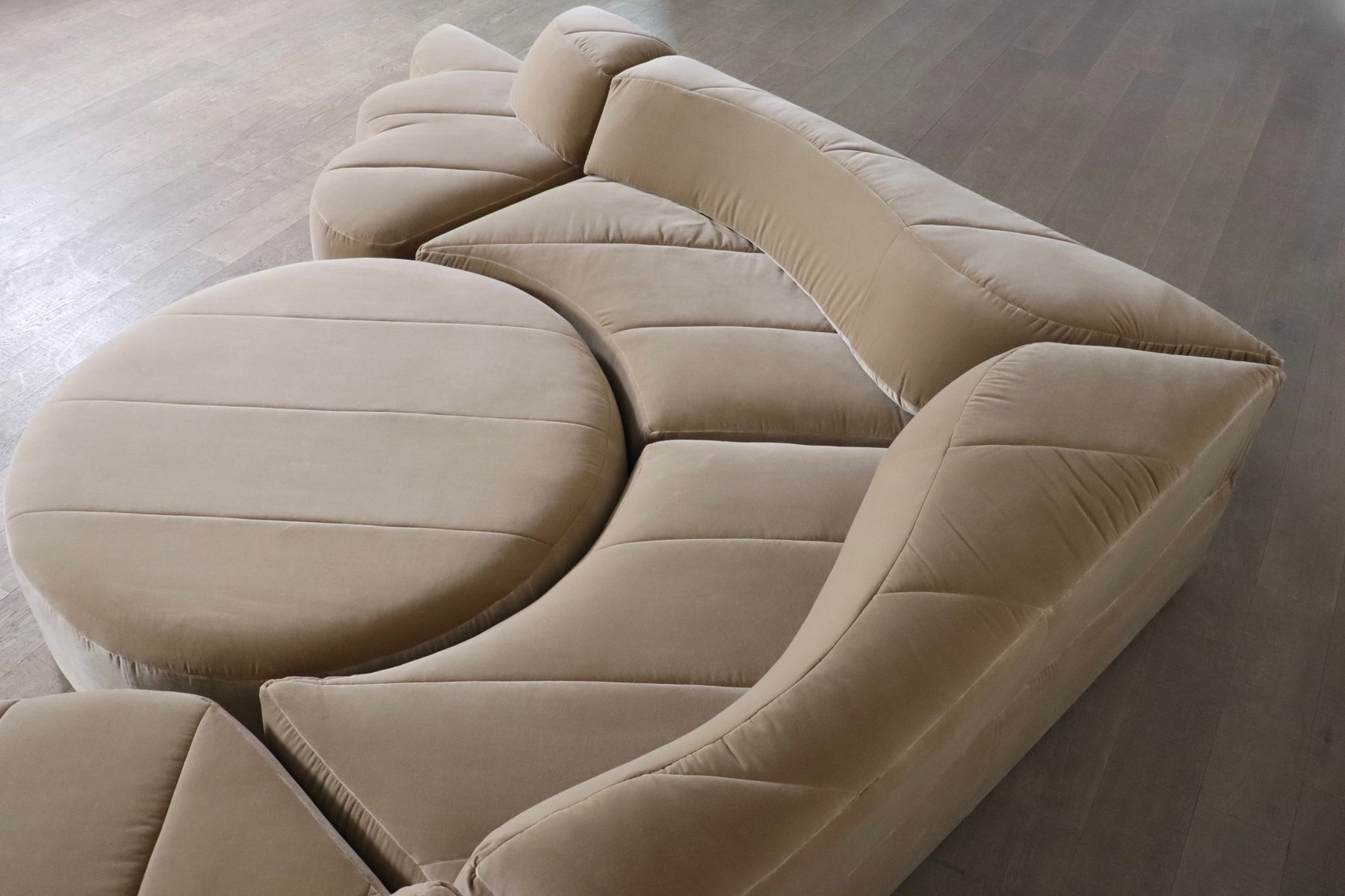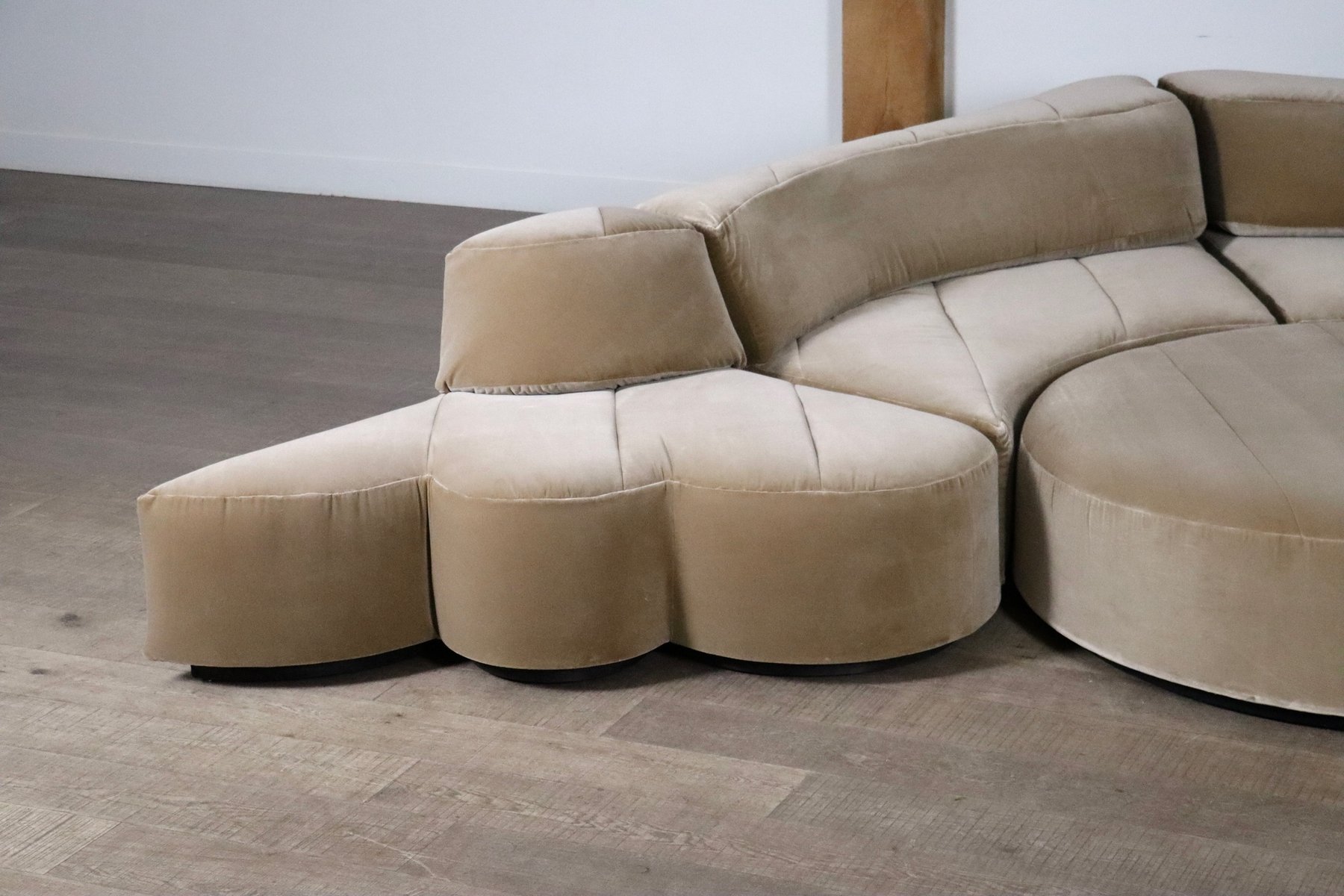 Dieses Sofa wurde professionell mit einem luxuriösen beigen Baumwollsamt neu gepolstert, wobei die ursprüngliche Linienführung und die Kurven beibehalten wurden. Die Polsterung verbindet zeitloses Design mit modernem Komfort und verspricht eine harmonische Mischung aus Stil und Funktionalität. Die Sofaelemente sind auf einem schwarzen Holzsockel aufgebaut, der einen schwebenden Effekt erzeugt. Die einzelnen Module können nach Belieben platziert werden. Wenn Ihnen der Sinn nach Faulenzen steht, können Sie den Pouf einfach wie ein Puzzle in die anderen Elemente einfügen, so dass eine große Lounge-Ecke entsteht. Wenn Sie gerne in größerer Runde sitzen, können Sie einfach einen größeren Sitzplatz schaffen, indem Sie den Pouf neben den Elementen oder sogar separat anbringen.