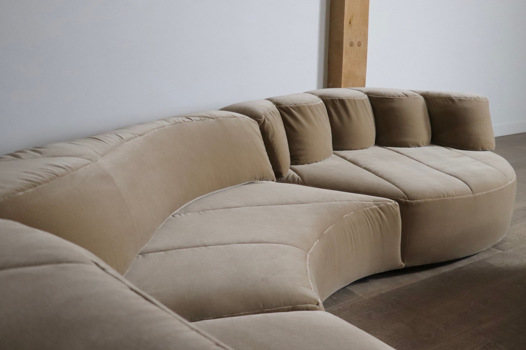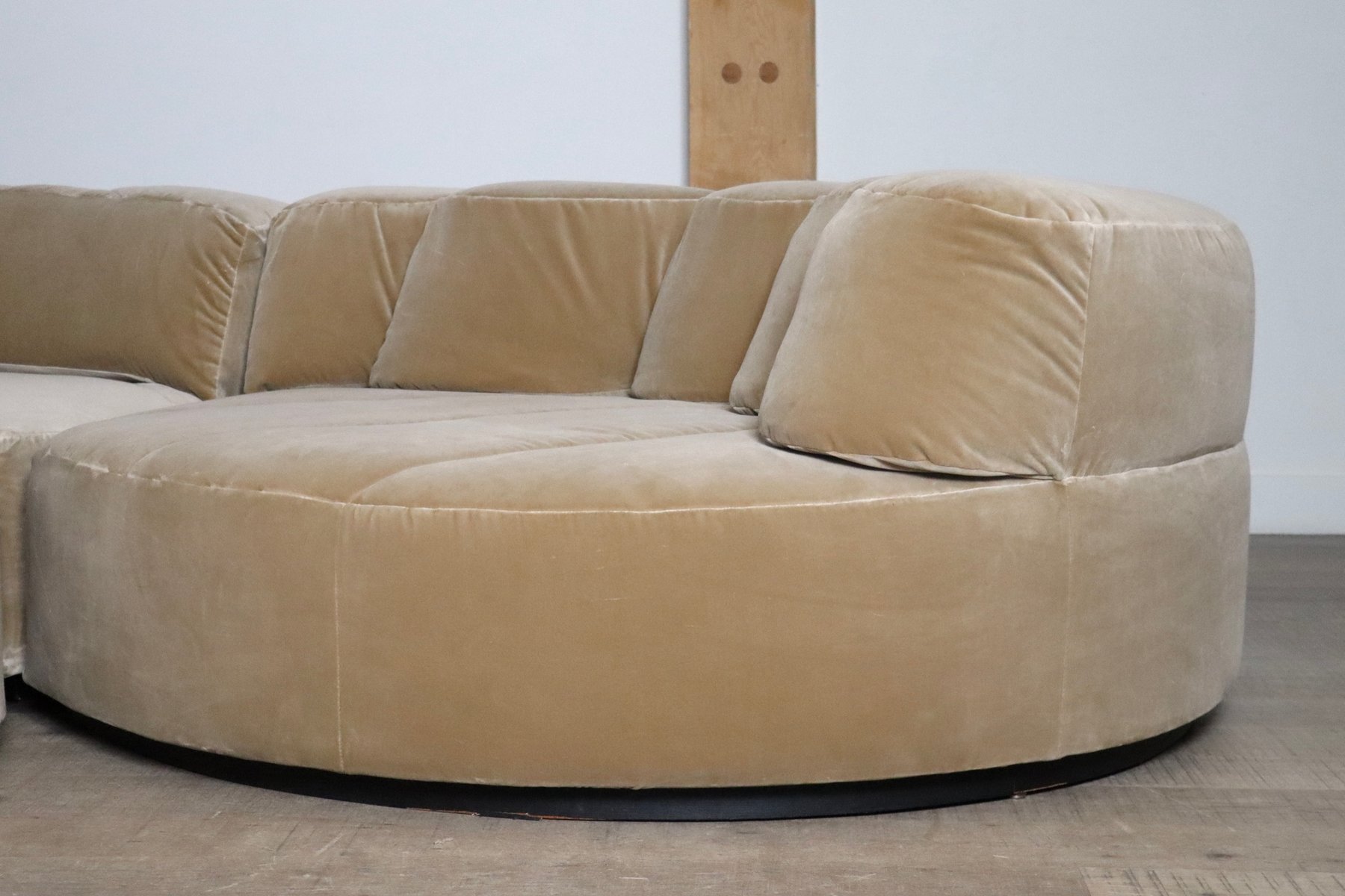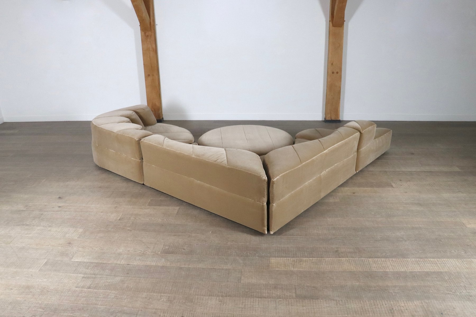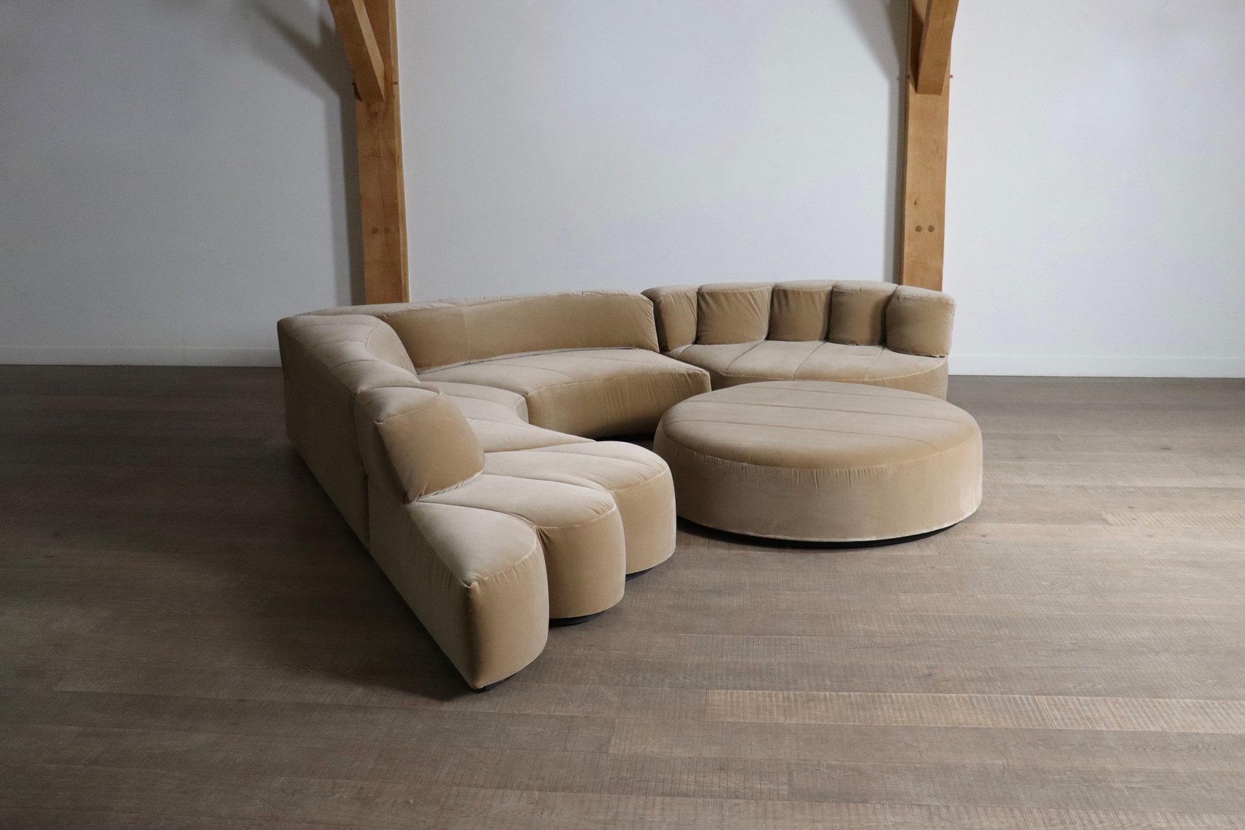 Dieses Sofa wurde professionell mit einem luxuriösen beigen Baumwollsamt neu gepolstert, wobei die ursprüngliche Linienführung und die Kurven beibehalten wurden. Die Polsterung verbindet zeitloses Design mit modernem Komfort und verspricht eine harmonische Mischung aus Stil und Funktionalität. Die Sofaelemente sind auf einem schwarzen Holzsockel aufgebaut, der einen schwebenden Effekt erzeugt. Die einzelnen Module können nach Belieben platziert werden. Wenn Ihnen der Sinn nach Faulenzen steht, können Sie den Pouf einfach wie ein Puzzle in die anderen Elemente einfügen, so dass eine große Lounge-Ecke entsteht. Wenn Sie gerne in größerer Runde sitzen, können Sie einfach einen größeren Sitzplatz schaffen, indem Sie den Pouf neben den Elementen oder sogar separat anbringen.