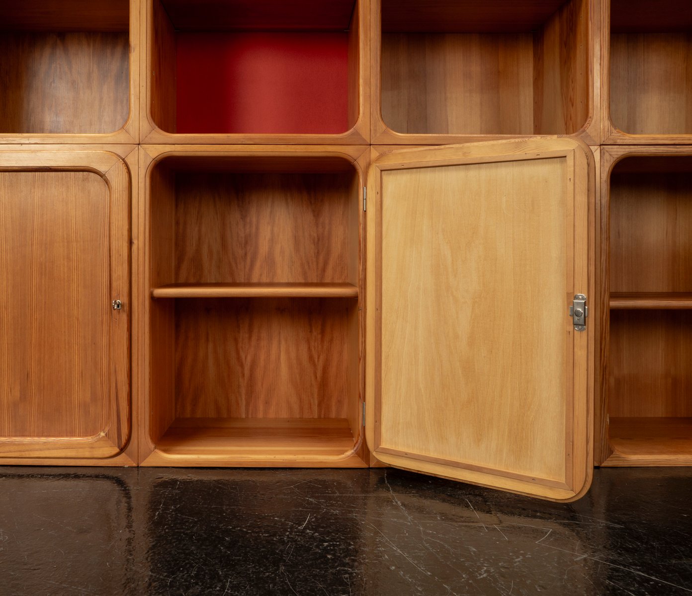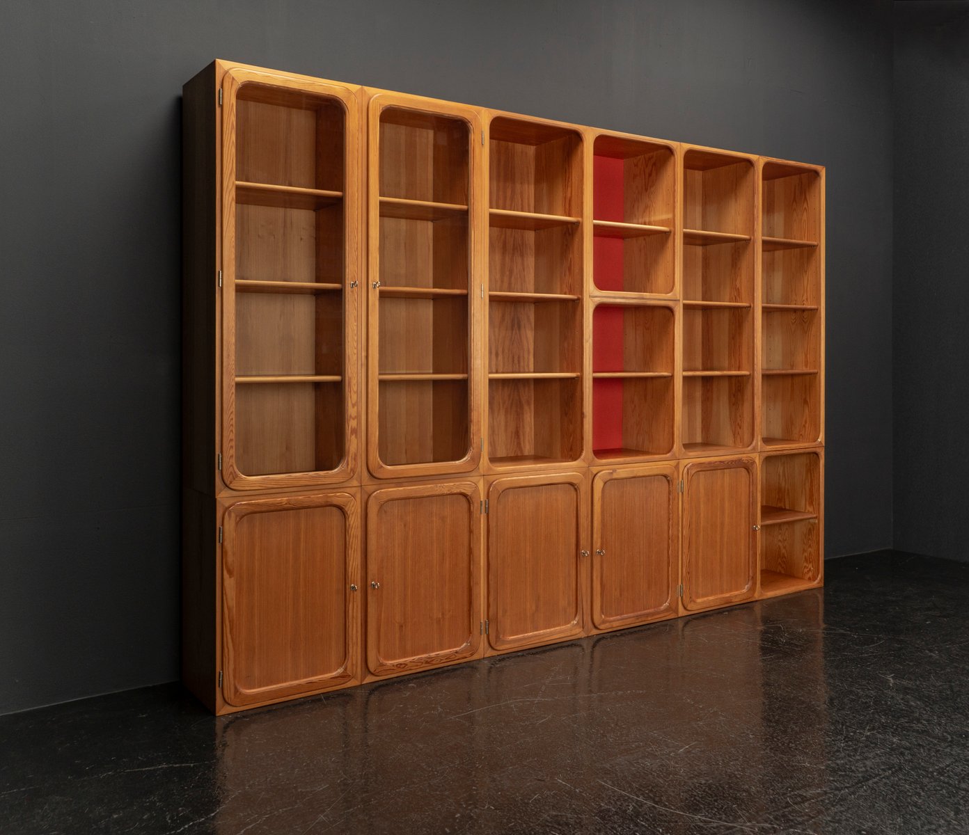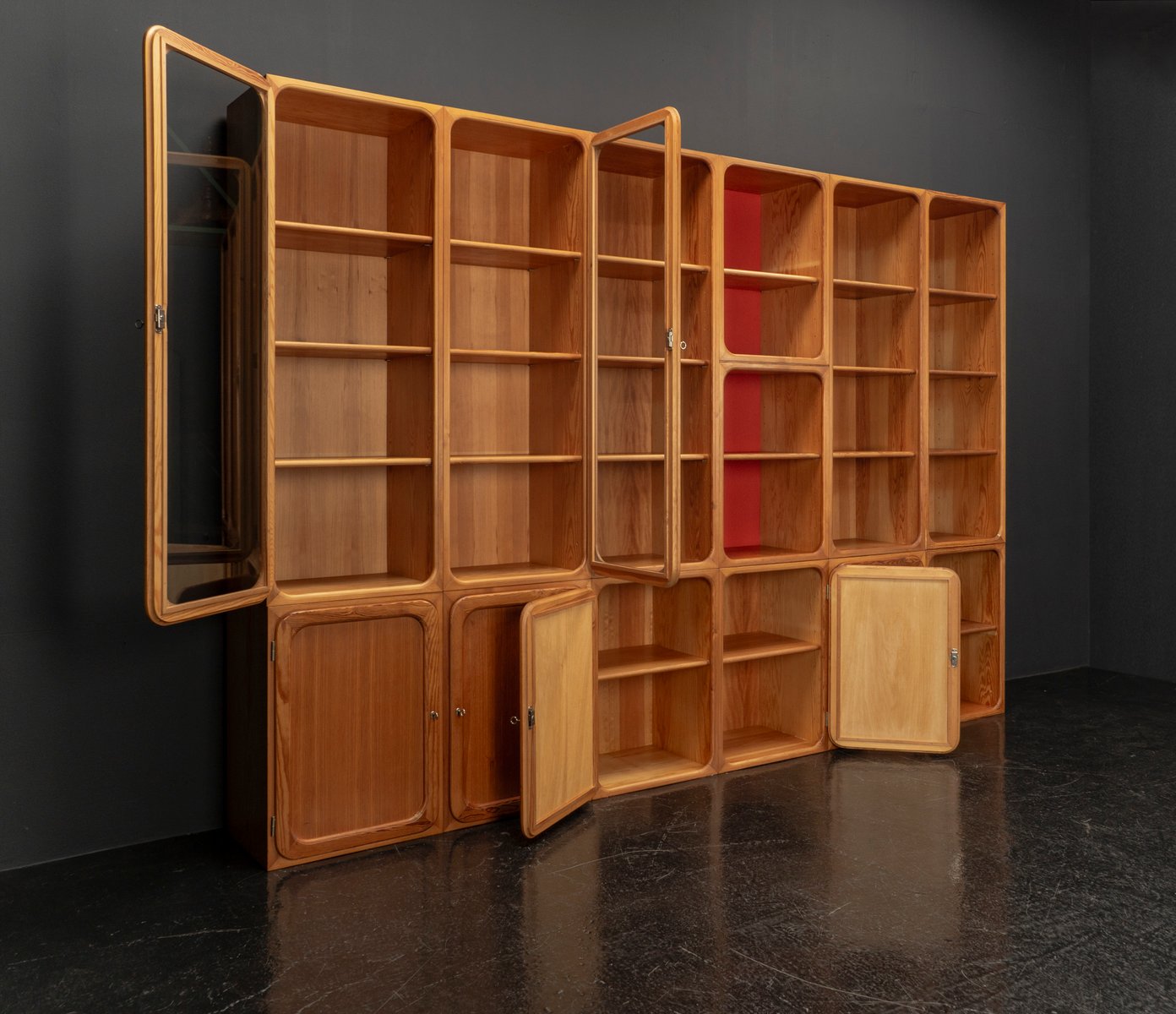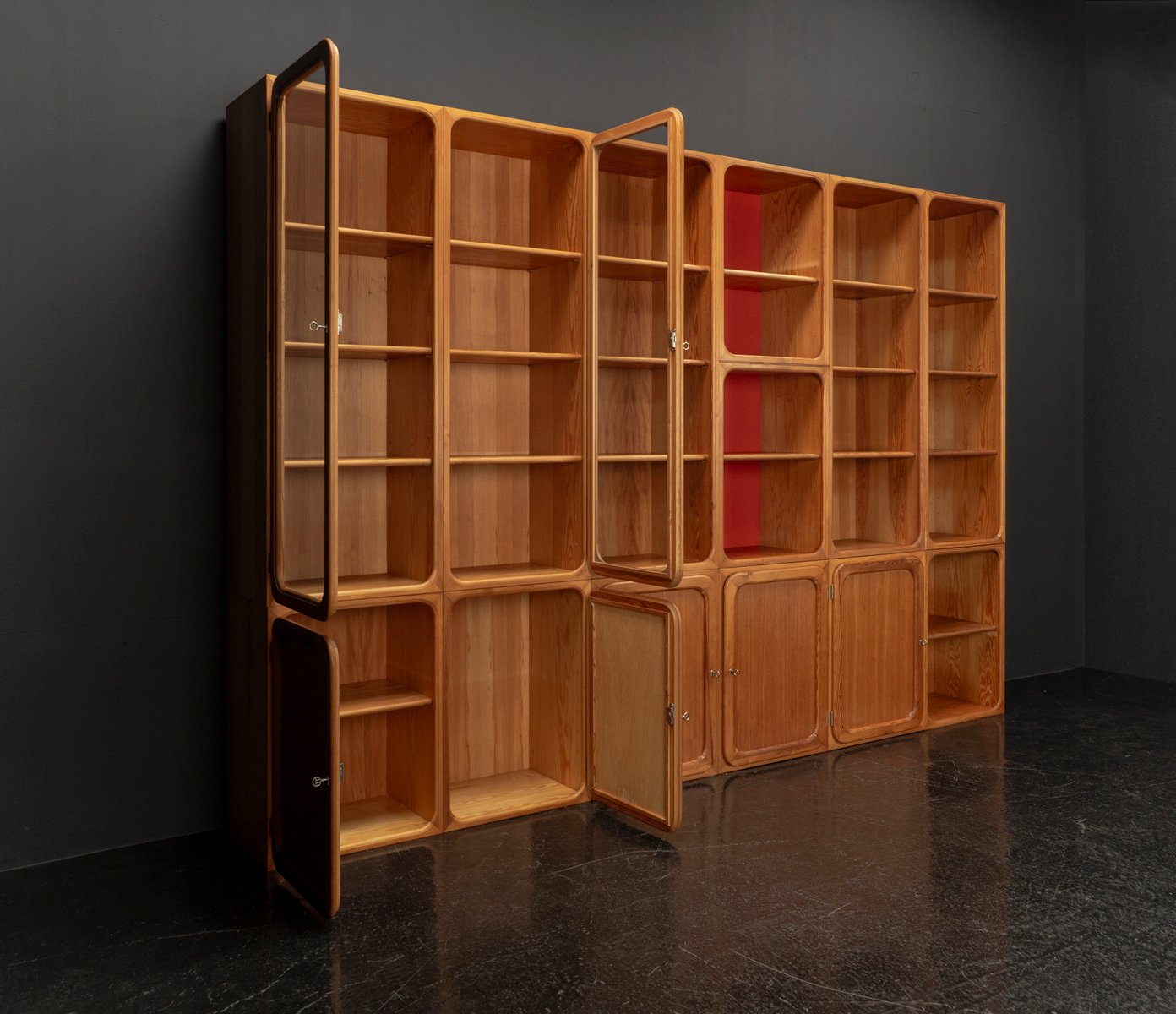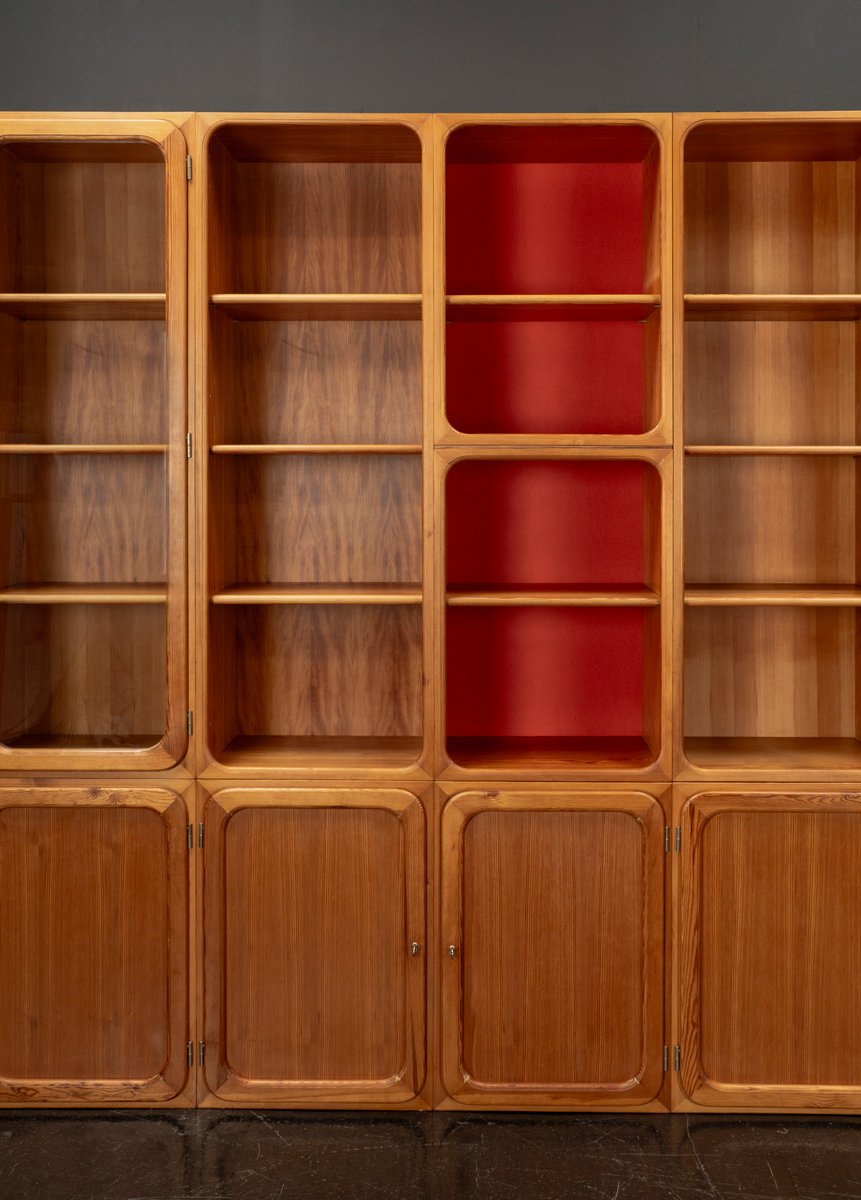 This exceptional wall unit with 14 pieces from the 1960s embodies the perfect balance between functionality and refined aesthetics. Crafted from warm pine veneer with solid pine doors, it exudes natural elegance and superb craftsmanship. Its well proportioned design reveals the hand of a talented though unknown designer who created a piece of timeless beauty through harmony and subtle detail. The ensemble consists of thirteen modules that together form an impressive architectural composition. Two large elements with glass doors elegantly display objects or books, while five smaller units with wooden doors provide concealed storage. Two modules feature a vivid cinnabarred back panel, introducing a bold modernist accent, and four open units add lightness and transparency to the overall structure.