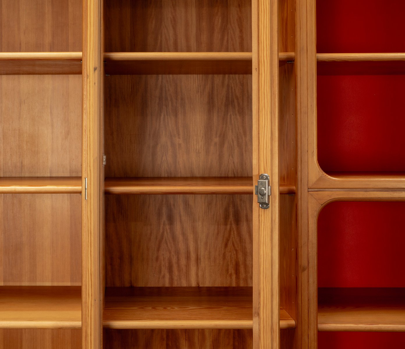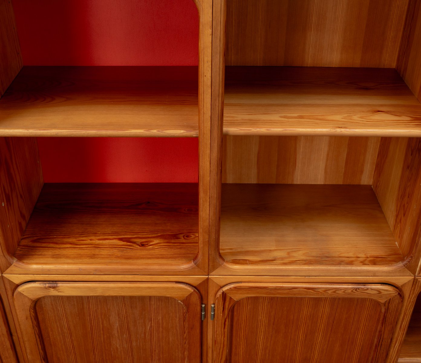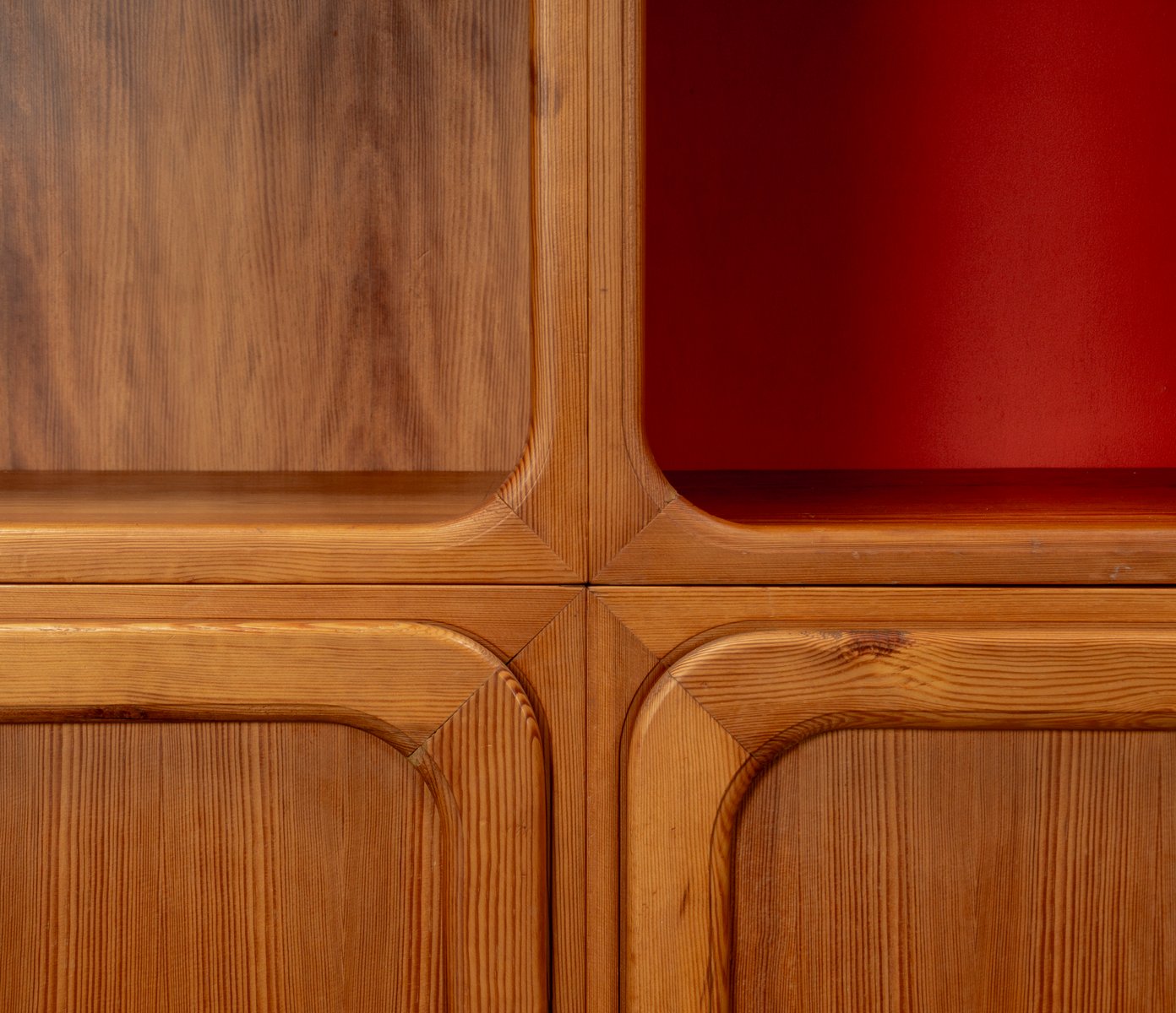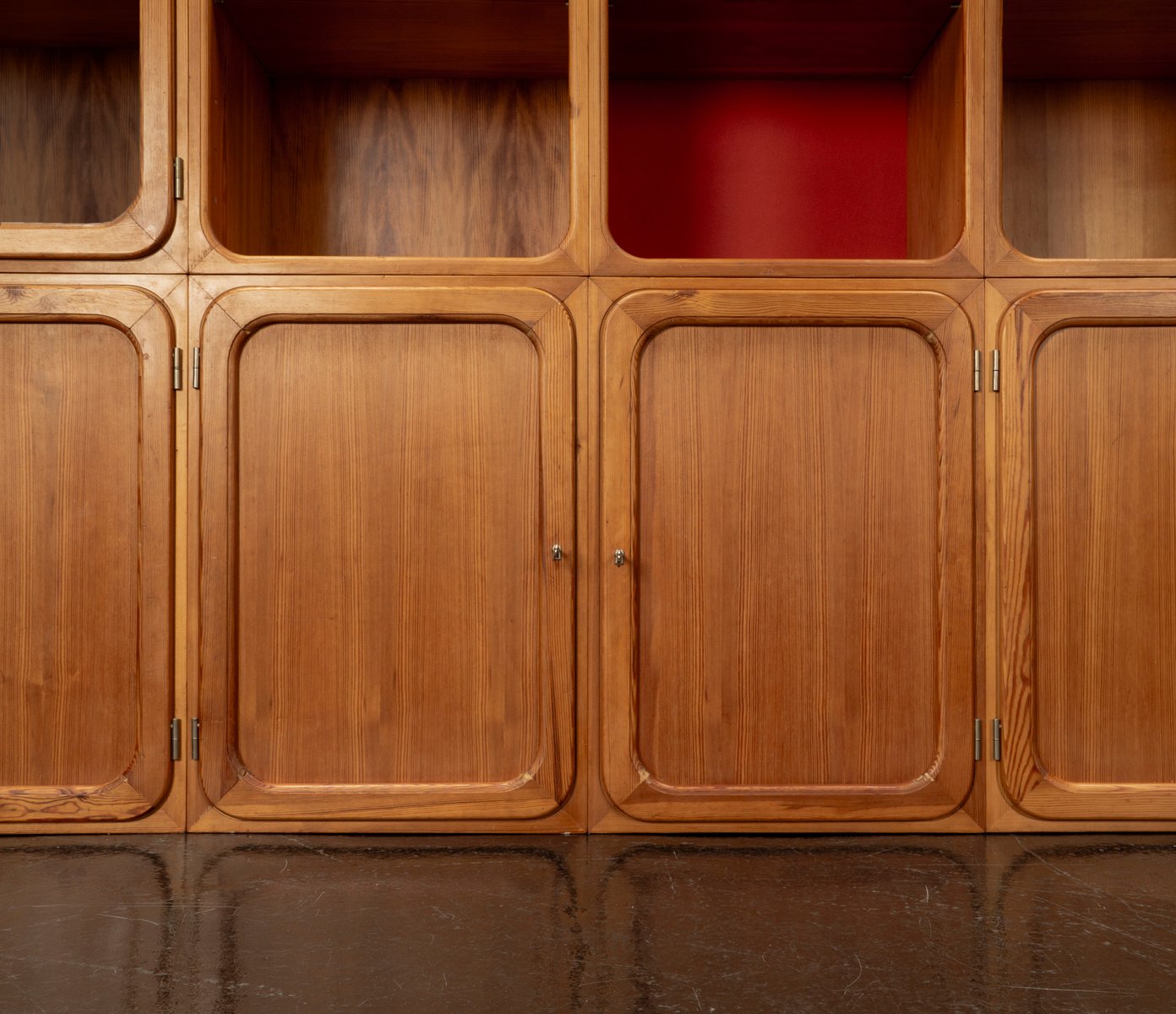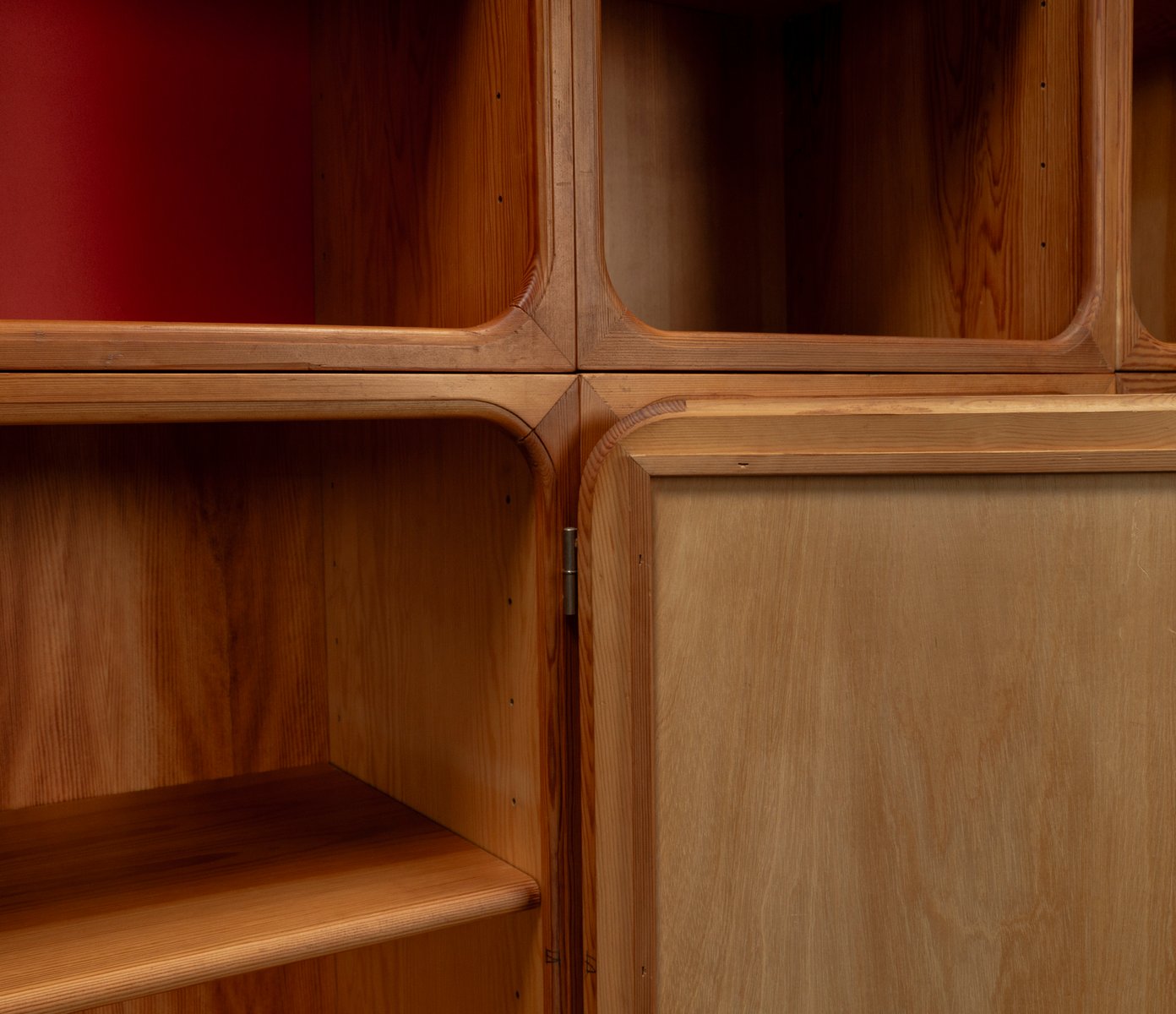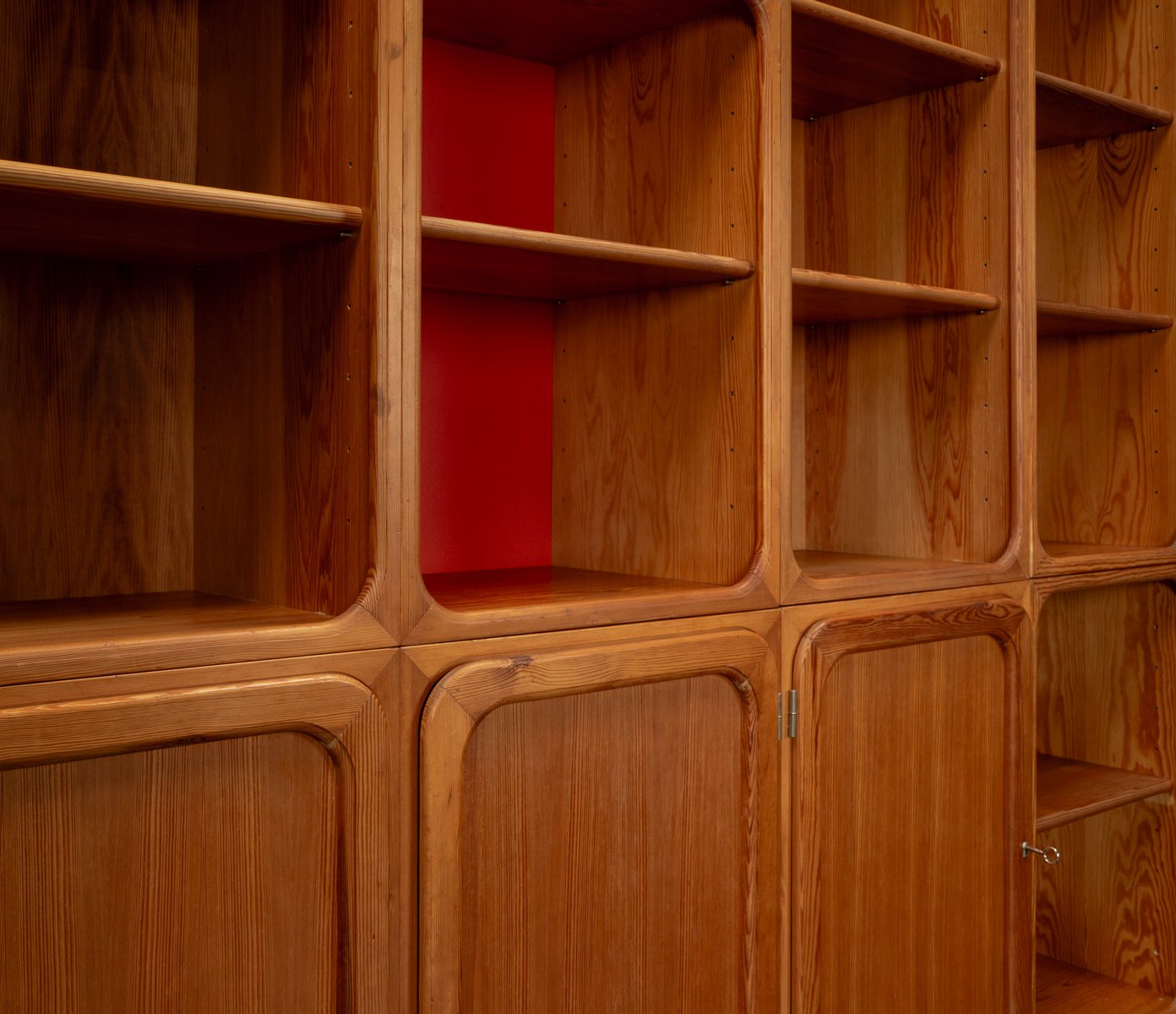 This exceptional wall unit with 14 pieces from the 1960s embodies the perfect balance between functionality and refined aesthetics. Crafted from warm pine veneer with solid pine doors, it exudes natural elegance and superb craftsmanship. Its well proportioned design reveals the hand of a talented though unknown designer who created a piece of timeless beauty through harmony and subtle detail. The ensemble consists of thirteen modules that together form an impressive architectural composition. Two large elements with glass doors elegantly display objects or books, while five smaller units with wooden doors provide concealed storage. Two modules feature a vivid cinnabarred back panel, introducing a bold modernist accent, and four open units add lightness and transparency to the overall structure.