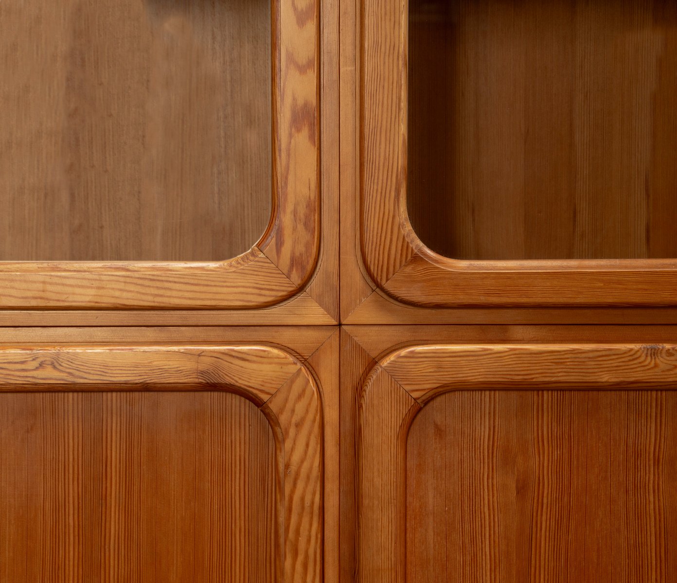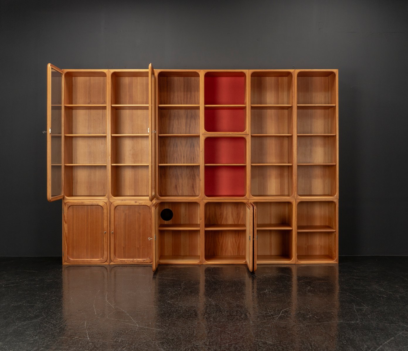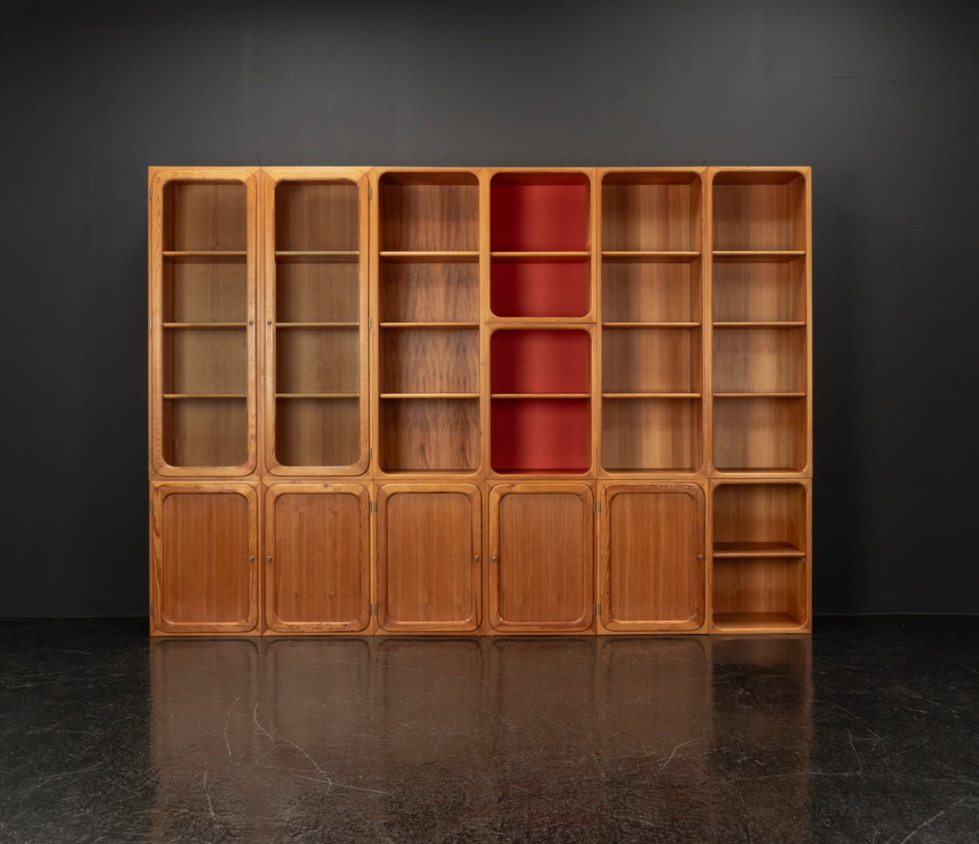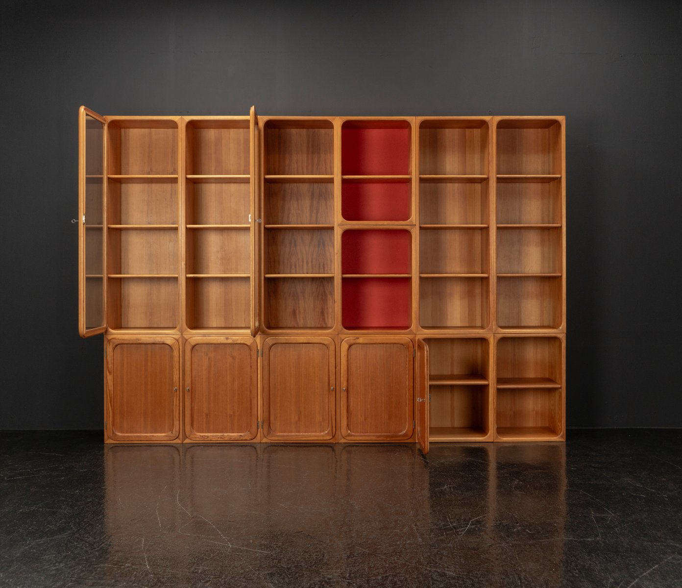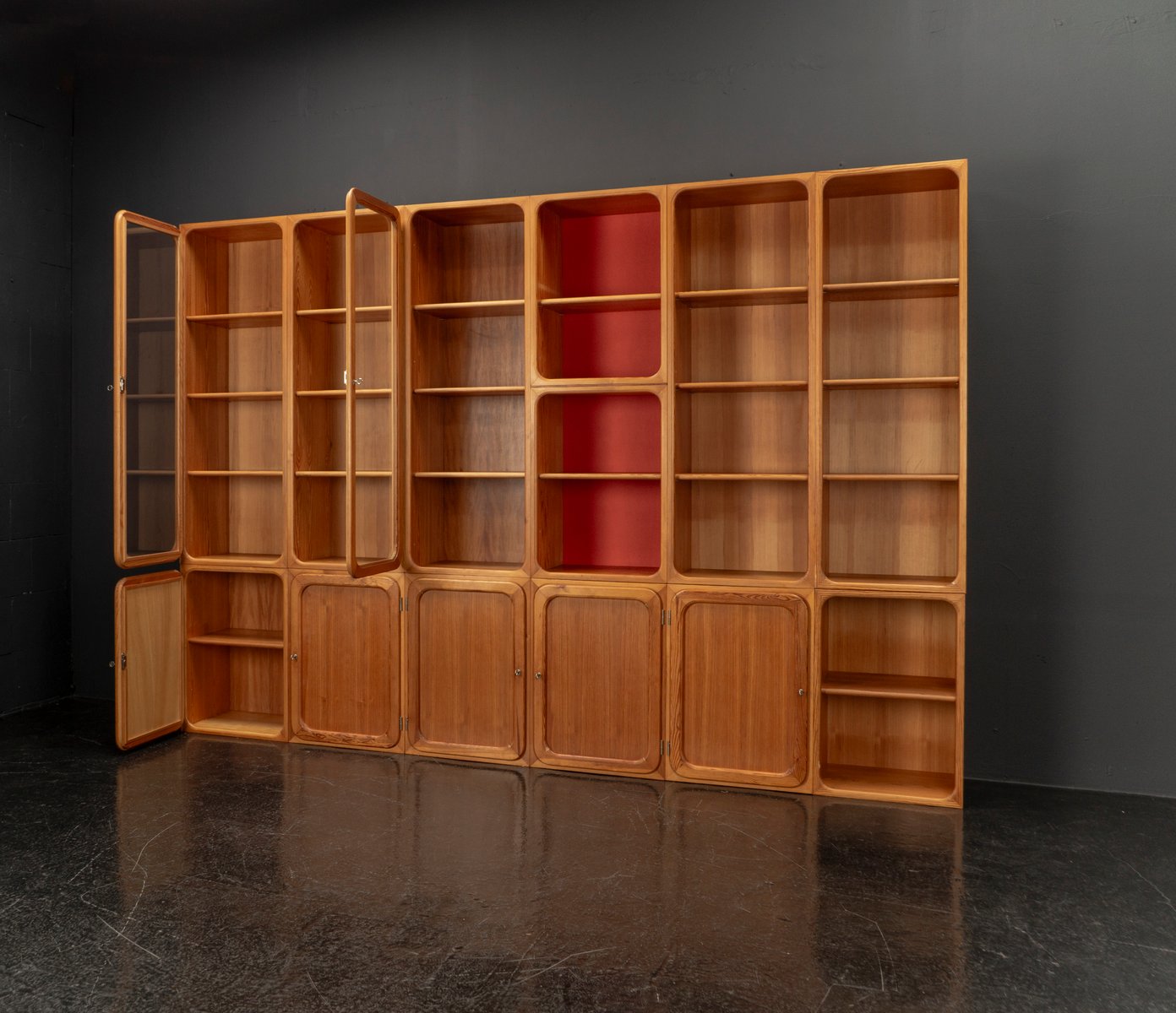 This exceptional wall unit with 14 pieces from the 1960s embodies the perfect balance between functionality and refined aesthetics. Crafted from warm pine veneer with solid pine doors, it exudes natural elegance and superb craftsmanship. Its well proportioned design reveals the hand of a talented though unknown designer who created a piece of timeless beauty through harmony and subtle detail. The ensemble consists of thirteen modules that together form an impressive architectural composition. Two large elements with glass doors elegantly display objects or books, while five smaller units with wooden doors provide concealed storage. Two modules feature a vivid cinnabarred back panel, introducing a bold modernist accent, and four open units add lightness and transparency to the overall structure.
