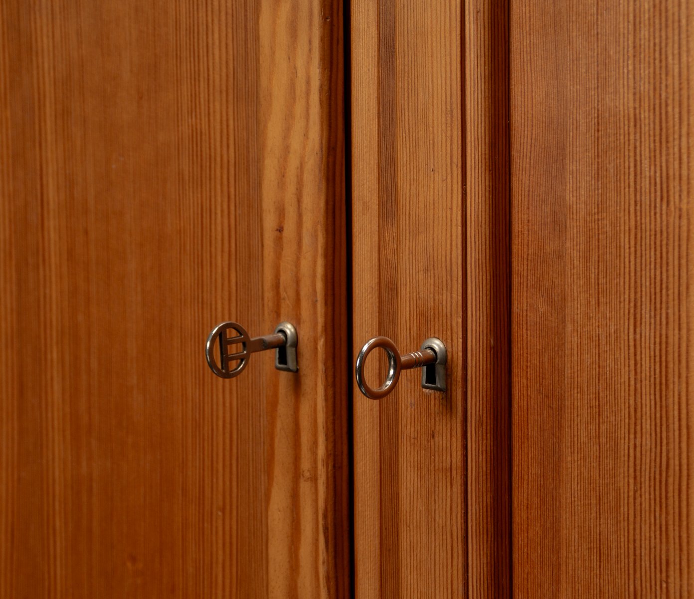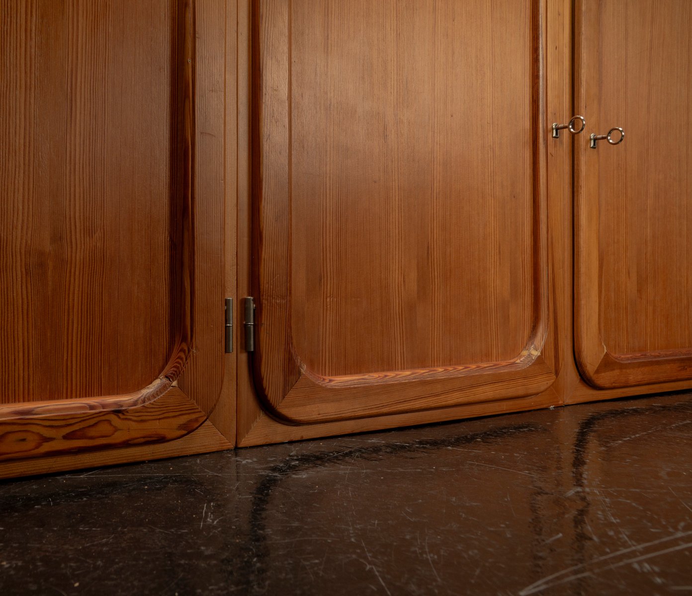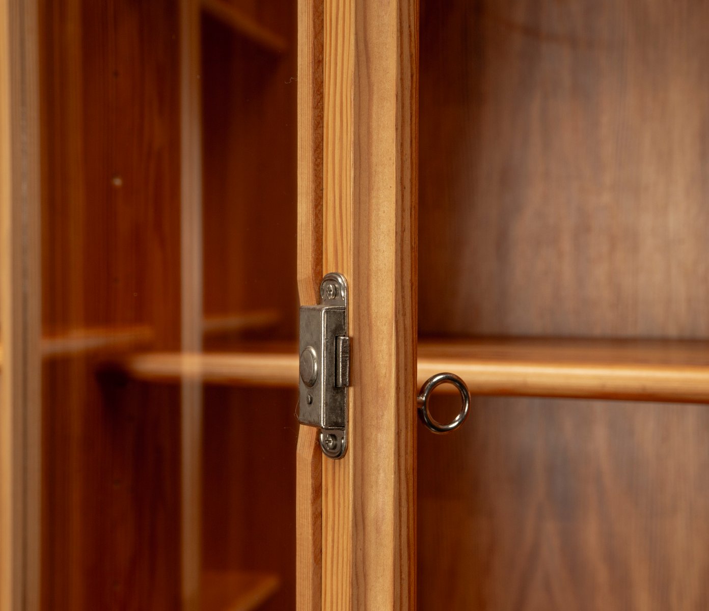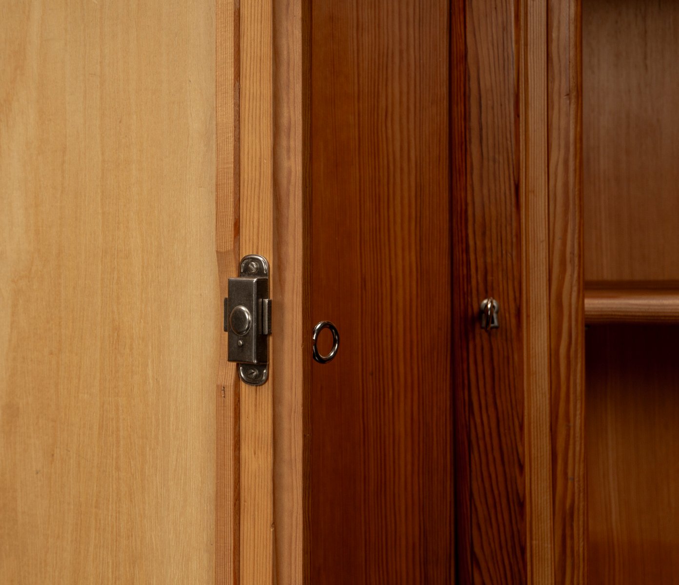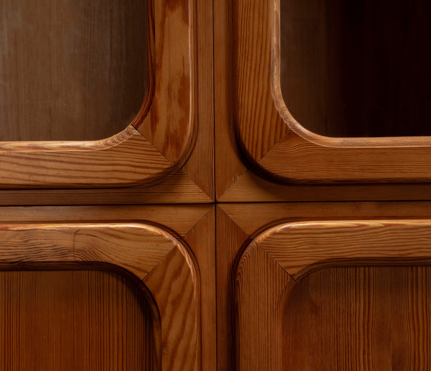 This exceptional wall unit with 14 pieces from the 1960s embodies the perfect balance between functionality and refined aesthetics. Crafted from warm pine veneer with solid pine doors, it exudes natural elegance and superb craftsmanship. Its well proportioned design reveals the hand of a talented though unknown designer who created a piece of timeless beauty through harmony and subtle detail. The ensemble consists of thirteen modules that together form an impressive architectural composition. Two large elements with glass doors elegantly display objects or books, while five smaller units with wooden doors provide concealed storage. Two modules feature a vivid cinnabarred back panel, introducing a bold modernist accent, and four open units add lightness and transparency to the overall structure.