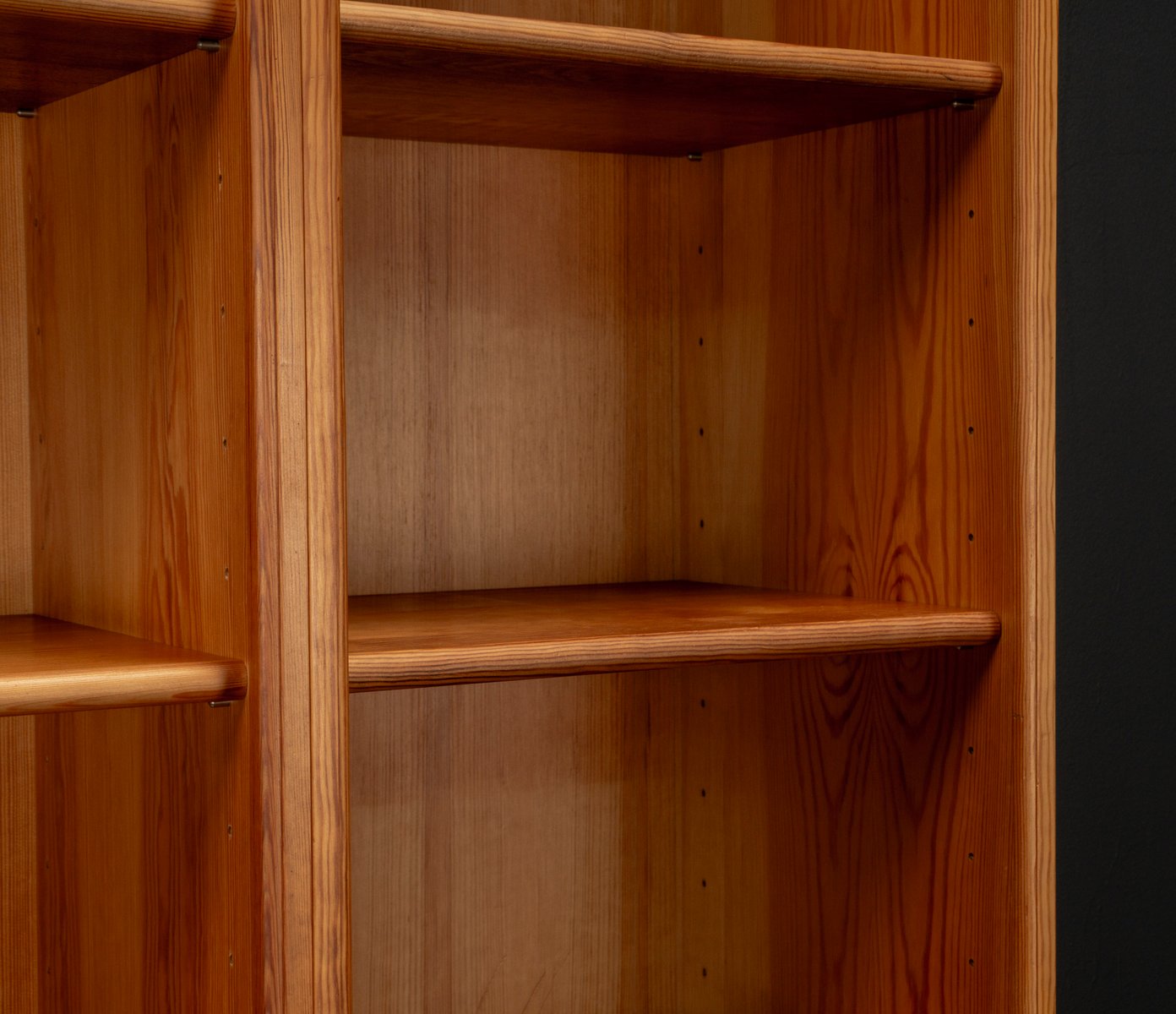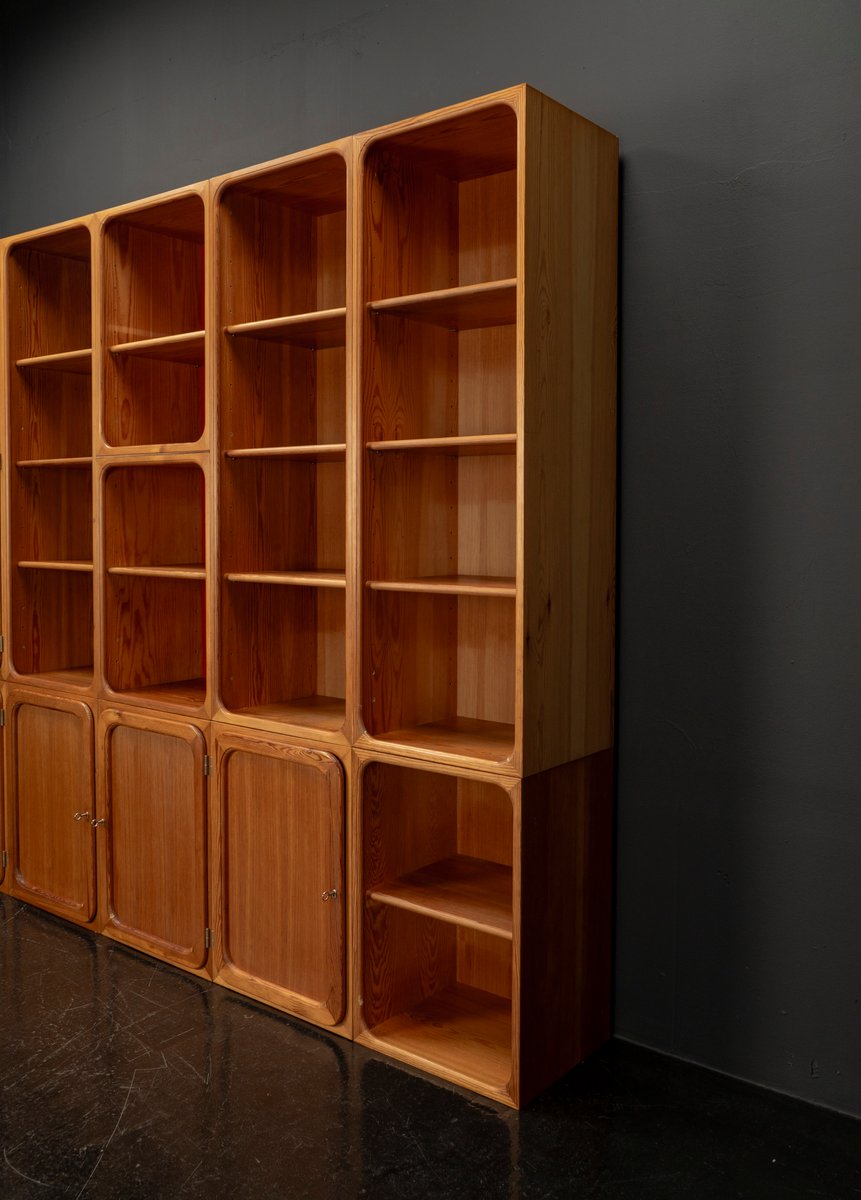 Jedes Element folgt dem 32-mm-Regalsystem, so dass die Regale auf verschiedene Höhen eingestellt werden können. Diese Modularität bietet unendliche Konfigurationsmöglichkeiten, von einem symmetrischen Bücherregal bis hin zu einer vitrinenartigen Auslage oder einer Raumkomposition mit rhythmischer Variation. Die Schrankwand wurde professionell gereinigt, desinfiziert und sorgfältig restauriert, um die natürliche Wärme und Textur des Kiefernfurniers zu erhalten. Die seidenmatte Oberfläche hebt die Holzmaserung hervor und verleiht dem Stück eine ruhige und doch unverwechselbare Präsenz. Ob als skulpturales Wandelement in einem modernen Wohnraum, als elegante Ablage in einem Atelier oder als Statement in einem Interieur aus der Mitte des Jahrhunderts - dieses modulare System ist mehr als ein funktionales Objekt, es ist ein Stück Designgeschichte, das mit seinen klaren Linien und seinem poetischen Sinn für Form und Farbe jede Umgebung bereichert.