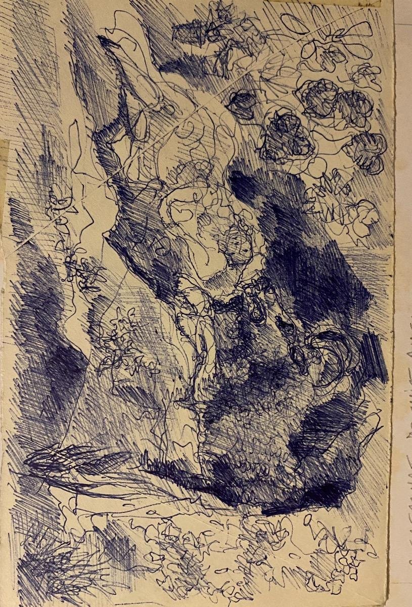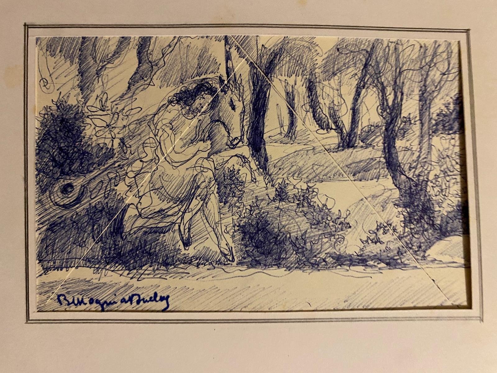 Figure in the Woods is an original colored drawing in pen on ivory-colored paper, realized by the French painter Bertrand Mogniat-Duclos. In very good conditions. Image Dimensions: 10 x 15 cm This artwork is a very beautiful drawing, with vivid and harmonious Lines. On the back of the drawing there is another design with various figures. Hand-signed in black marker on the lower margin. Bertrand Mogniat-Duclos (1903-1987) is a genre painter, figures, nudes, animated landscapes, still lifes, draftsman. He settled early in Paris. He made frequent stays in Italy, notably in Venice. He also painted landscapes in Paris and in several regions of France.