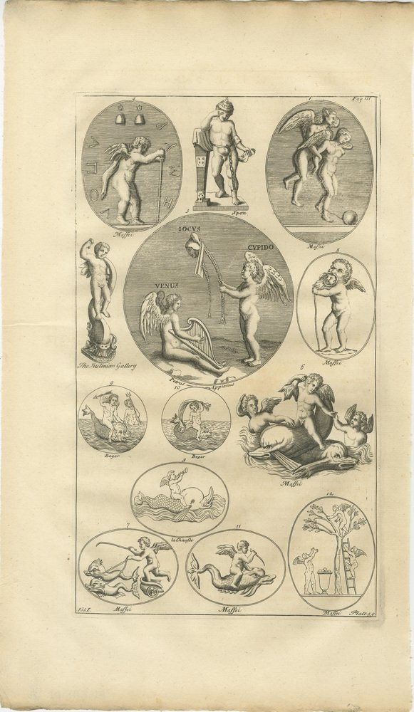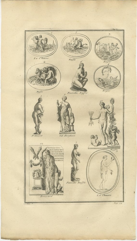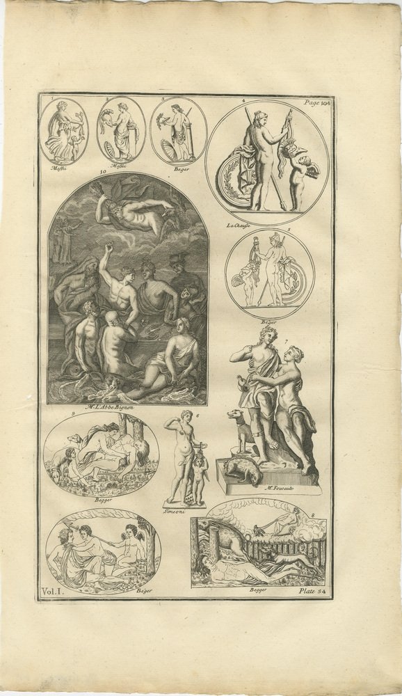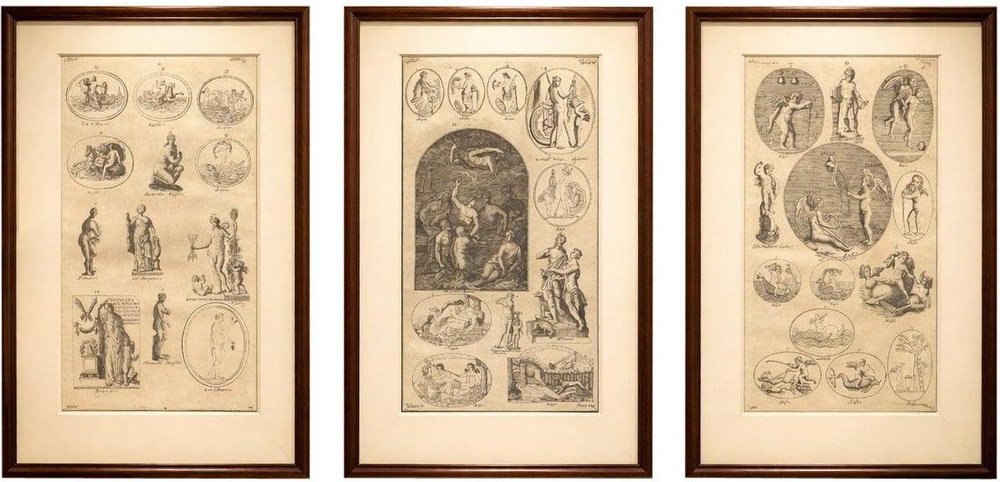 Classical Gods & Mythology, Set of 3 Antique Engravings – Montfaucon 1721 This cohesive set of three copper engravings originates from Bernard de Montfaucon’s seminal antiquarian publication Antiquity Explained and Represented in Sculptures, Volume I, issued in London in 1721. Each plate records mythological scenes and classical figures based on ancient Roman reliefs, sculptures, and monuments preserved in prominent European collections. Montfaucon’s work marks the beginning of systematic classical archaeology, presenting antiquity through engraved visual evidence rather than textual alone. The scenes shown here reflect the narrative richness of Roman mythology, combining gods, allegorical figures, and symbolic episodes that were central to ancient visual culture. Together, the three engravings form a balanced ensemble with strong decorative rhythm. The combination of oval medallions and larger narrative scenes gives the set both academic depth and visual presence, making it well suited to refined interiors, libraries, or collector-focused displays inspired by the Grand Tour tradition. The set is sold unframed. Condition report: Consistent age toning across all three sheets, visible plate marks, and stable, moderately inked impressions with natural variation in line strength. Minor edge wear and light surface handling, in keeping with early 18th-century folio engravings. Framing suggestions: Frame as a unified group using matching dark wood or black frames with ivory mats; works well as a vertical arrangement or as three aligned pieces for a classical wall display. Keywords: Bernard de Montfaucon, Antiquity Explained, 1721 engraving, mythological scenes, classical gods, Roman mythology, antiquarian print set, ancient sculpture, early archaeology, Grand Tour art, 18th century engraving, classical wall art, interior decoration Technique: Copper engraving Maker: Bernard de Montfaucon, London, 1721. Consistent age toning across all three sheets, visible plate marks, and stable, moderately inked impressions with natural variation in line strength. Minor edge wear and light surface handling, in keeping with early 18th-century folio engravings.