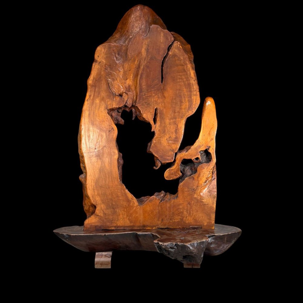 Das Holz ist höchstwahrscheinlich Keyaki (japanische Zelkova) oder ein vergleichbares dichtes Hartholz, was durch seinen warmen Honig- bis Bernsteinton, seine lebhafte Maserung und die offensichtliche Dichte des Materials nahegelegt wird. Die Oberfläche wurde poliert, doch natürliche Risse, Vertiefungen, Astlöcher und Einschlüsse wurden bewusst erhalten und bilden einen wesentlichen Teil seines Charakters. Die Form erinnert an Felsformationen, Landschaften oder sogar an ein Tor – ein unverkennbar japanisches Zusammenspiel zwischen Masse und negativem Raum. In Japan stehen Objekte wie dieses in Verbindung mit Wurzelholz- oder Baumstammskulpturen, die oft als kontemplative Blickpunkte in einer Tokonoma-Umgebung oder in geräumigen Innenräumen, Tempeln und Privatsammlungen ausgestellt werden. Heute fungiert es unabhängig von jeglichem praktischen Nutzen als wunderschöner architektonischer Akzent im Innenraum.