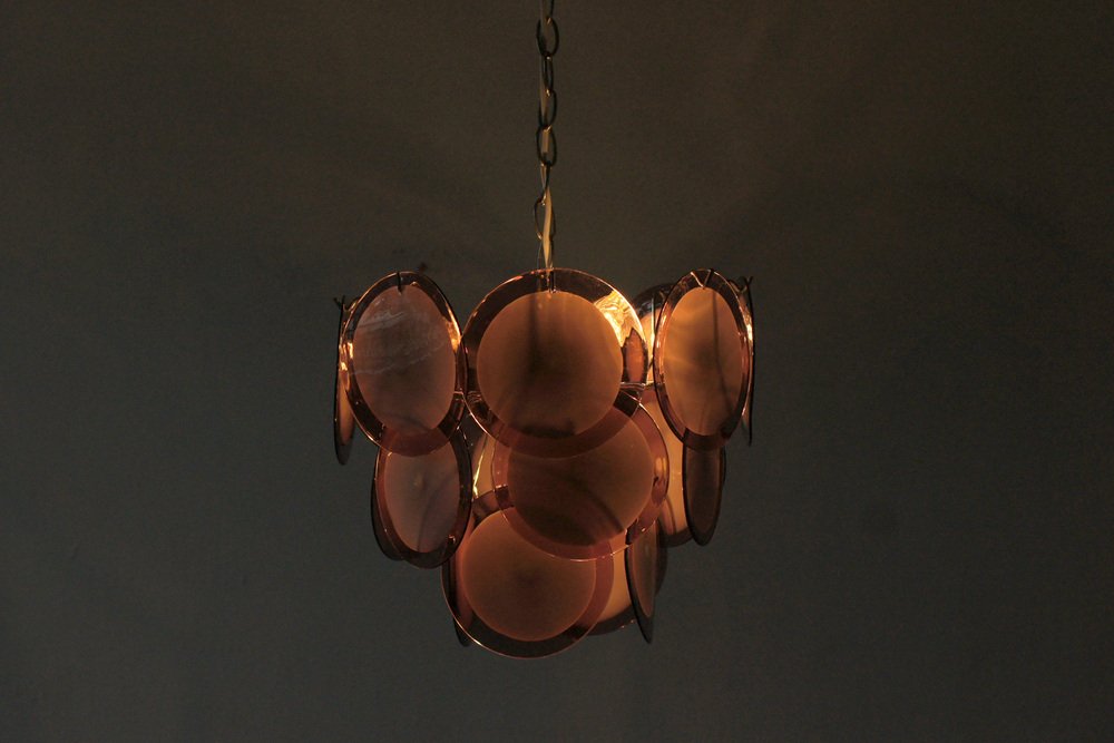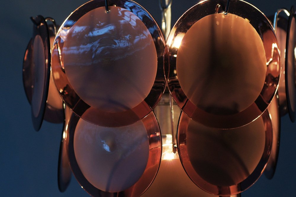 Each disc was made using traditional techniques by Venetian glass masters , giving the lamp a unique character and a slightly organic structure.