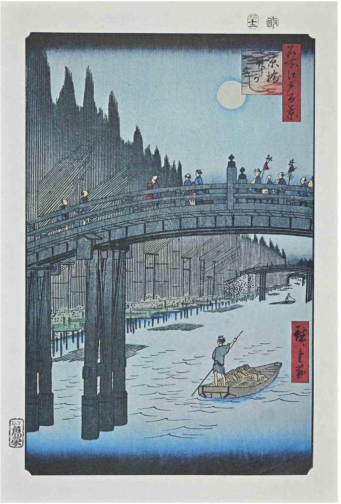 The Bridge is a modern artwork realized in the Mid-20th Century. Mixed colored lithograph after a woodcut realized by the great Japanese artist Utagawa Hiroshige in the 19th century. Very Good conditions. Utagawa Hiroshige, also known as Hiroshige (Edo, 1797-1858) When it comes to ukiyo-e artists there are not many legendary names like Utagawa Hiroshige. Born in 1797, the iconic master of woodblock prints became famous thanks to his extraordinary landscape paintings. Student of Utagawa Toyohiro (ca. 1773-1829), he studied the Western-style introduced by the founder of the Utagawa school Toyoharu (1735-1814). Together with Hokusai, he is considered one of the leading Japanese landscape painters of the nineteenth century and one of the most famous representatives of the Ukiyo-e art movement. with an immense artistic production that counts more than 400 engravings of actors, warriors, courtesans, and above all naturalistic landscapes, Hiroshige placed at the center of his research the contemplation of nature and its representation in a morphologically harmonic key: the human feeling linked to religion whilst listening to nature and to the breath of the cosmos. His most famous series is The 100 Famous Edo Views. Hiroshige extraordinarily influenced European painting of the late nineteenth century, especially Impressionists and Post-Impressionists, including artists like Claude Monet and Vincent van Gogh.