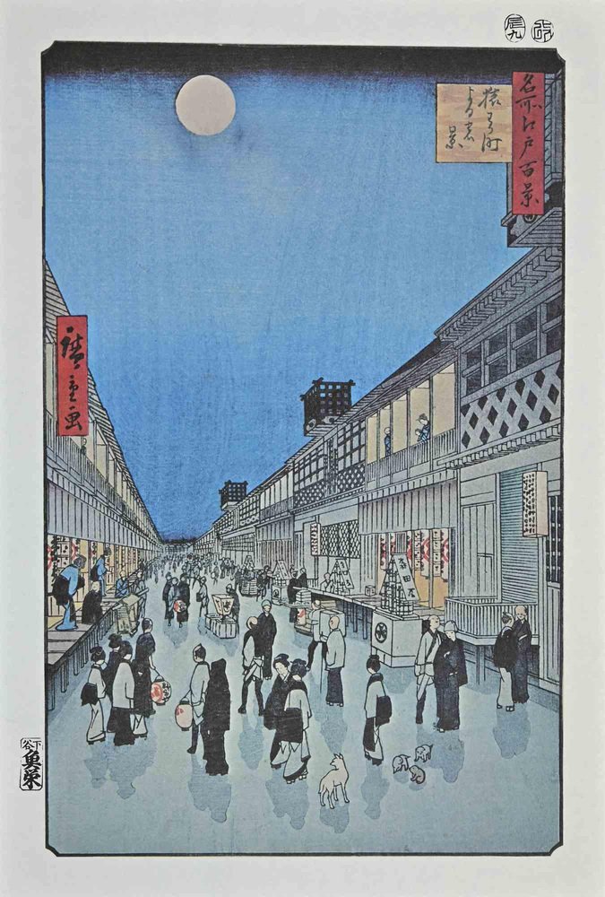 View of Urban Japan is a modern artwork realized in the Mid-20th Century. Mixed colored lithograph after a woodcut realized by the great Japanese artist Utagawa Hiroshige in the 19th century. Very Good conditions. Collect an oriental artwork! Utagawa Hiroshige, also known as Hiroshige (Edo, 1797-1858) When it comes to ukiyo-e artists there are not many legendary names like Utagawa Hiroshige. Born in 1797, the iconic master of woodblock prints became famous thanks to his extraordinary landscape paintings. Student of Utagawa Toyohiro (ca. 1773-1829), he studied the Western-style introduced by the founder of the Utagawa school Toyoharu (1735-1814). Together with Hokusai, he is considered one of the leading Japanese landscape painters of the nineteenth century and one of the most famous representatives of the Ukiyo-e art movement. With an immense artistic production that counts more than 400 engravings of actors, warriors, courtesans, and above all naturalistic landscapes, Hiroshige placed at the center of his research the contemplation of nature and its representation in a morphologically harmonic key: the human feeling linked to religion whilst listening to nature and to the breath of the cosmos. His most famous series is The 100 Famous Edo Views. Hiroshige extraordinarily influenced European painting of the late nineteenth century, especially Impressionists and Post-Impressionists, including artists like Claude Monet and Vincent van Gogh.