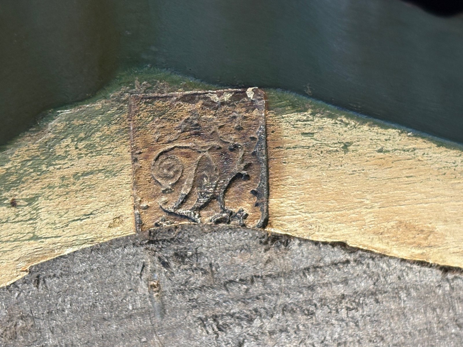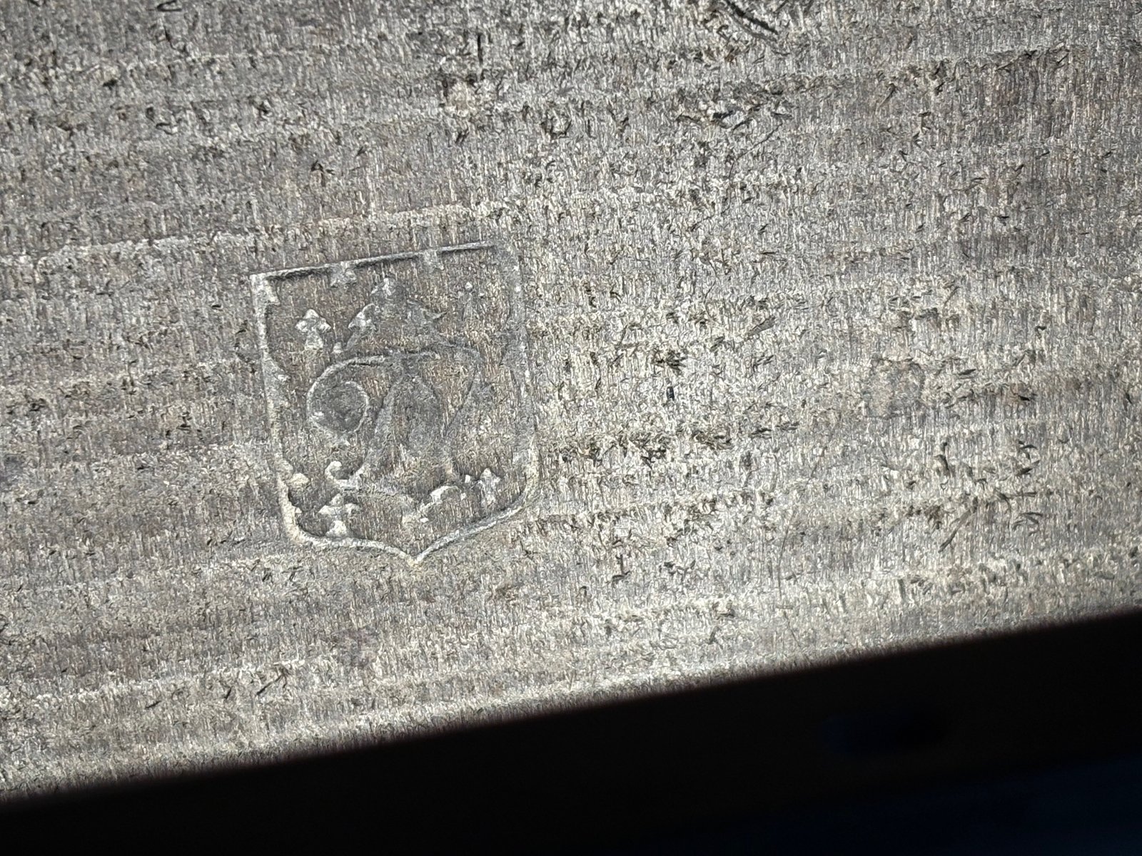 Auf der Rückseite ist die Werkstattmarke DC" in einem mit stilisierten Hermelinen verzierten Wappen eingraviert - ein seltenes Detail, das auf einen bretonischen oder westfranzösischen Kunsthandwerker schließen lässt.