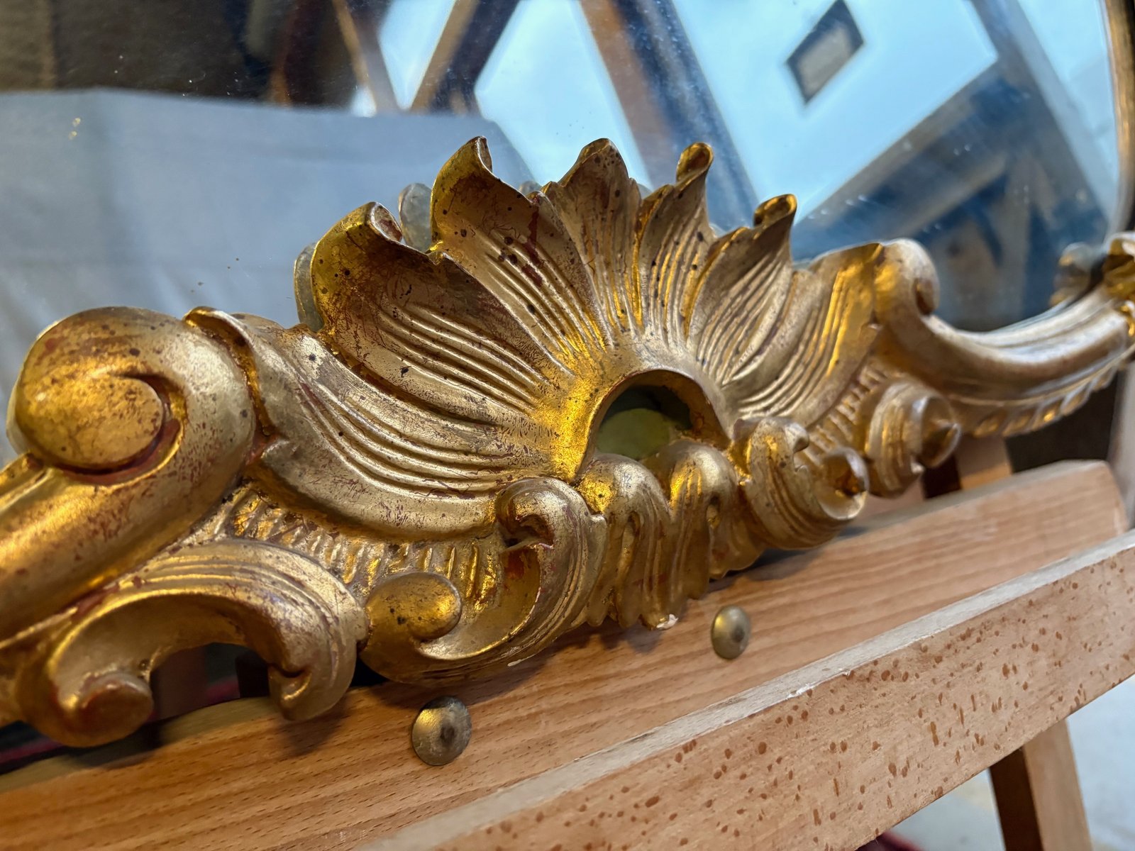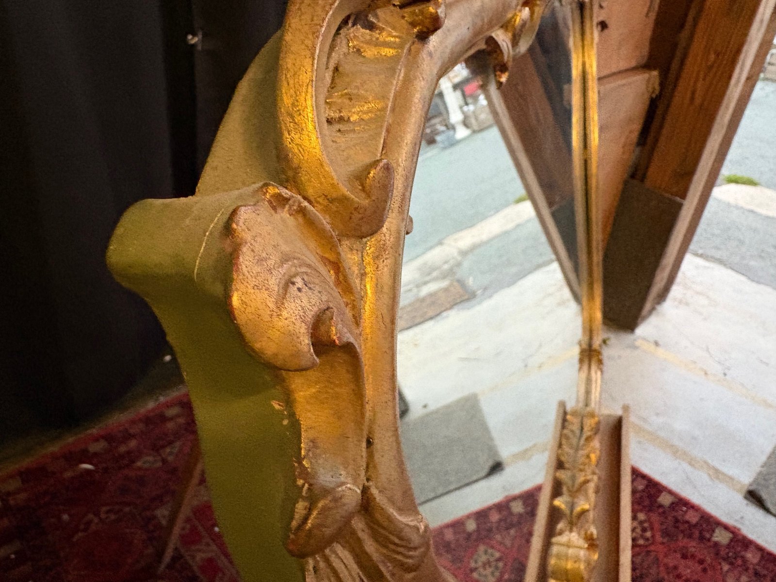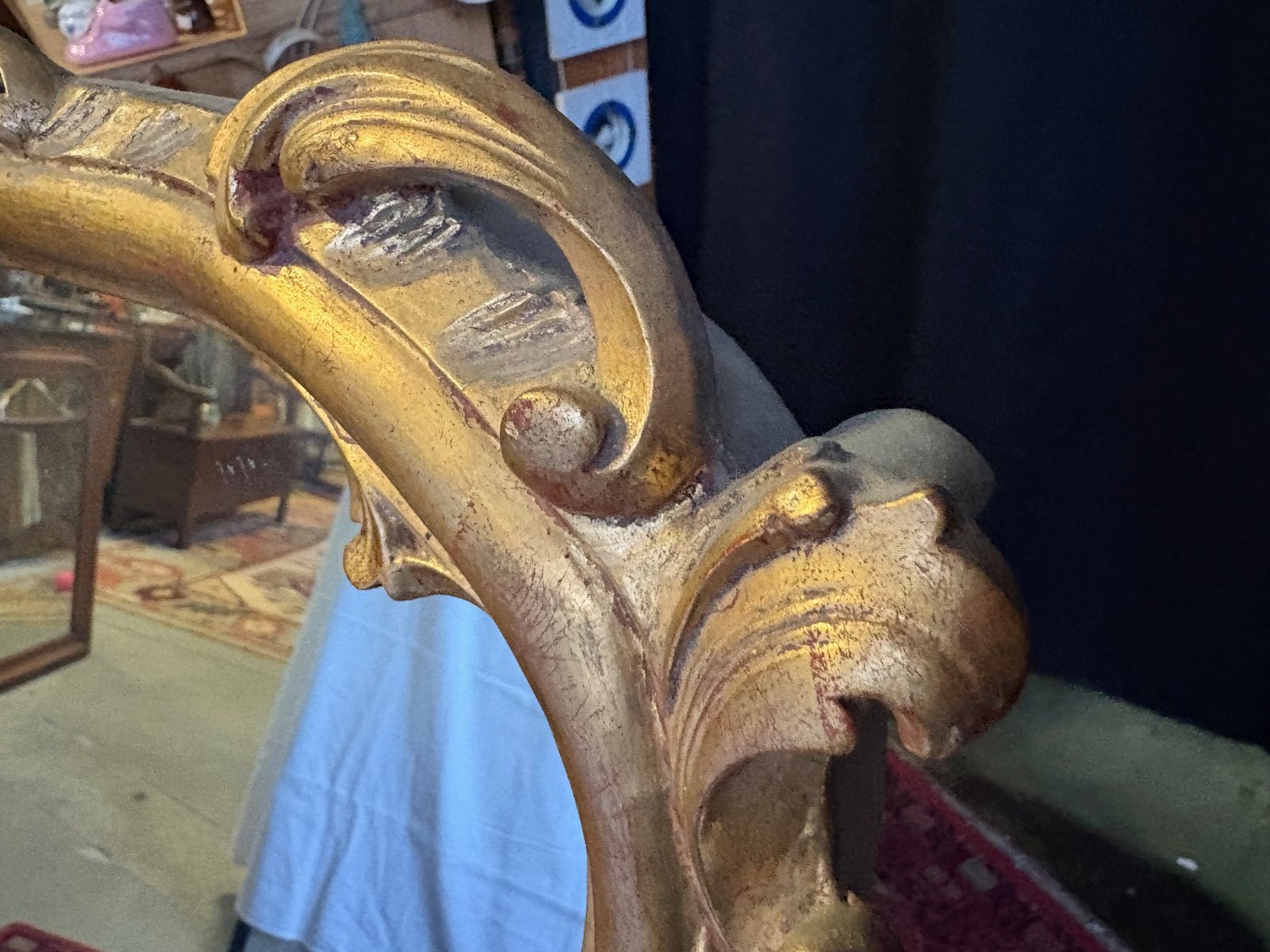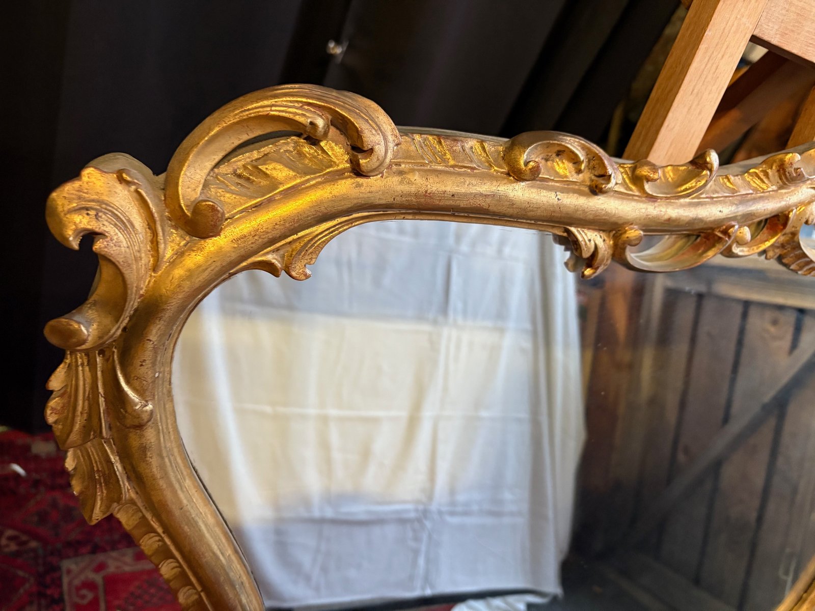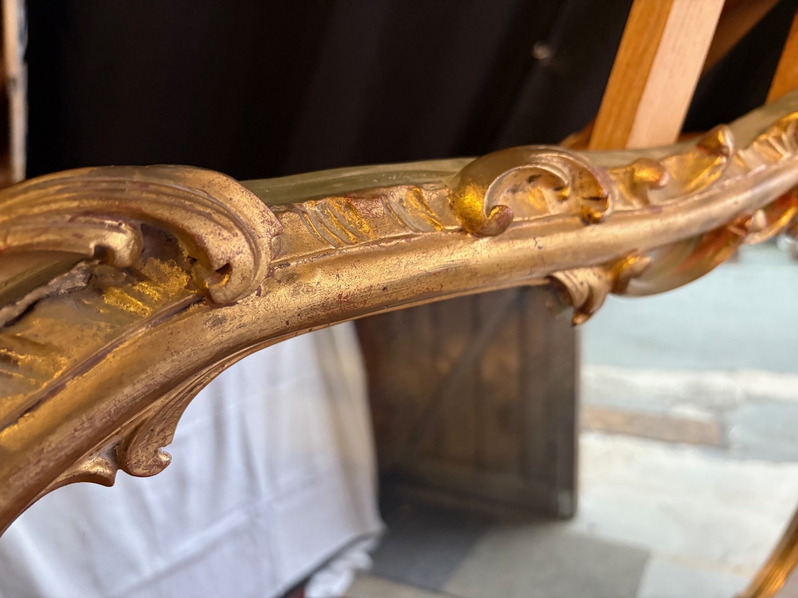 Der Rahmen weist feine Schnörkel, Muscheln und Blätter auf, die für das französische Rokoko typisch sind.