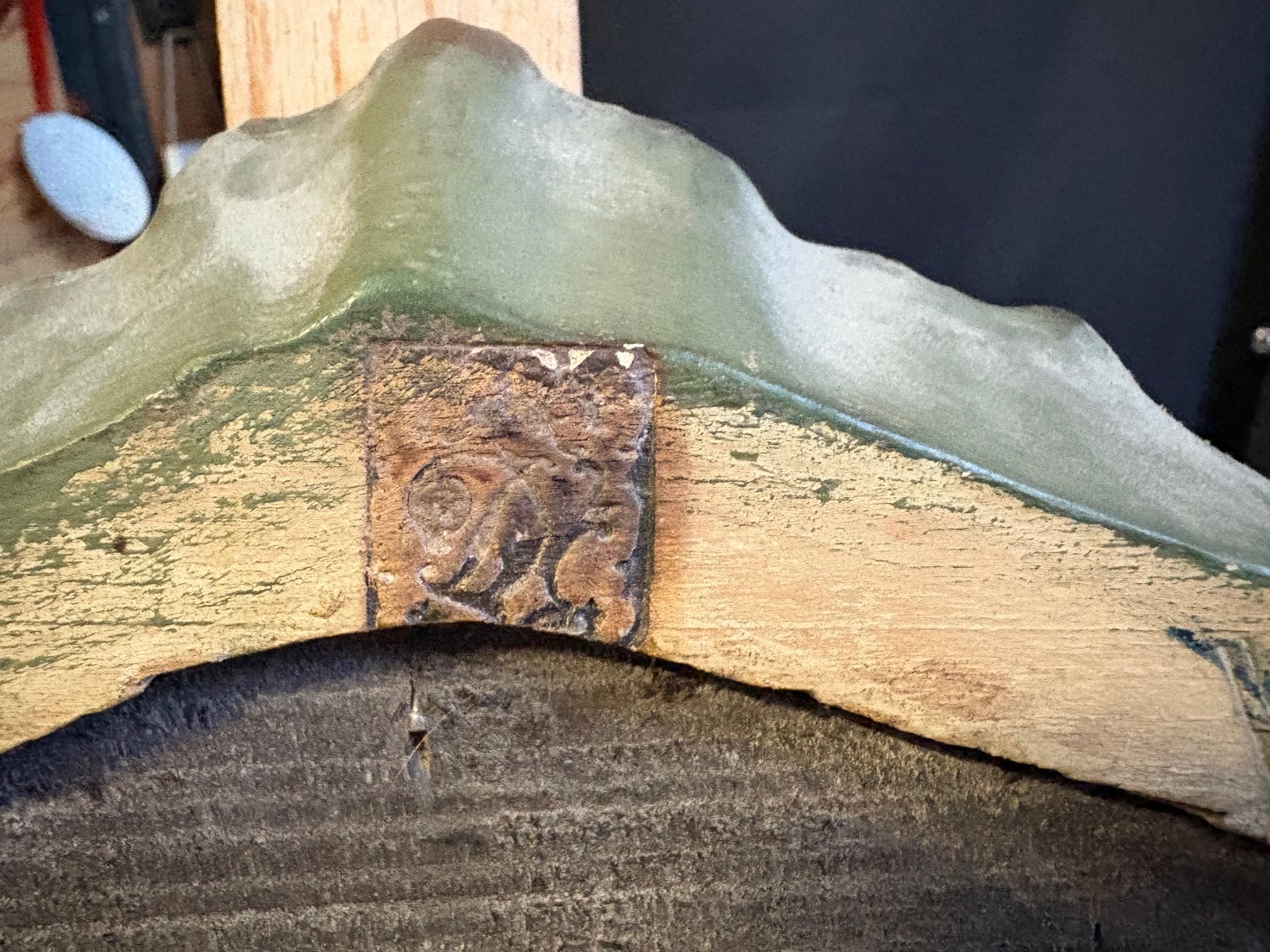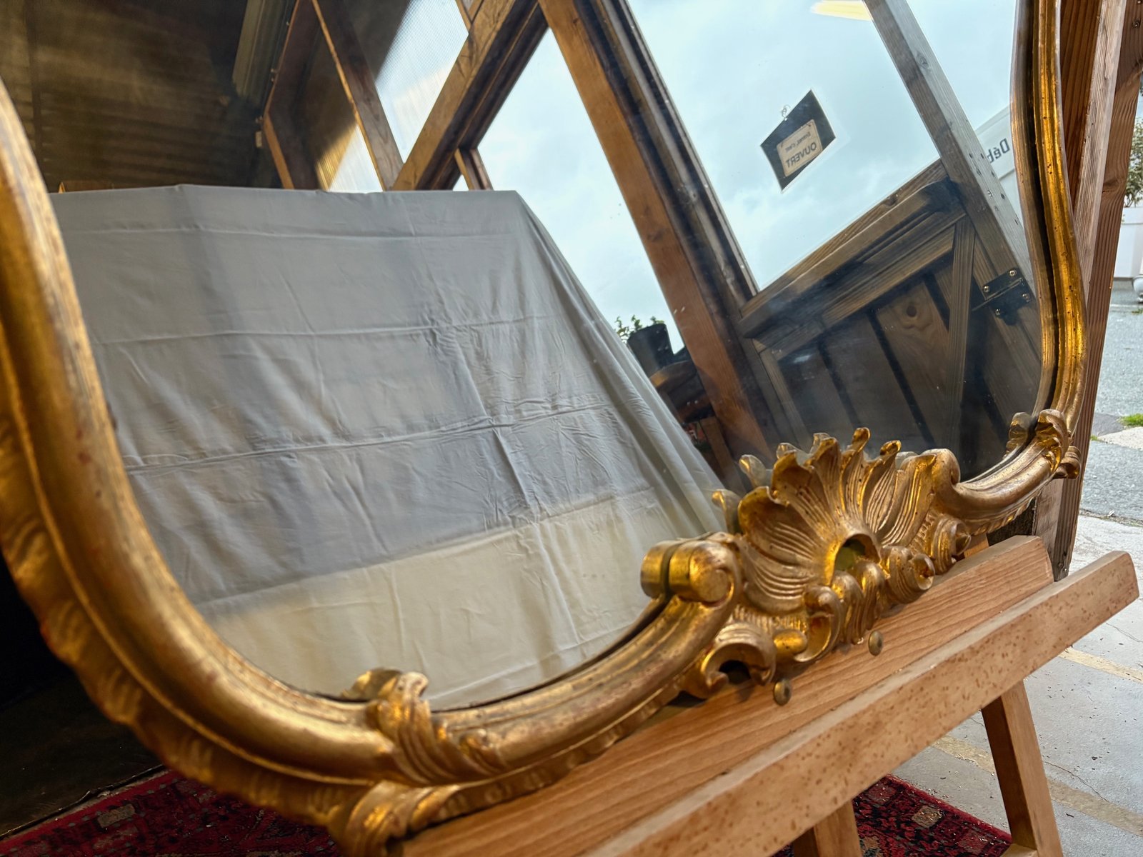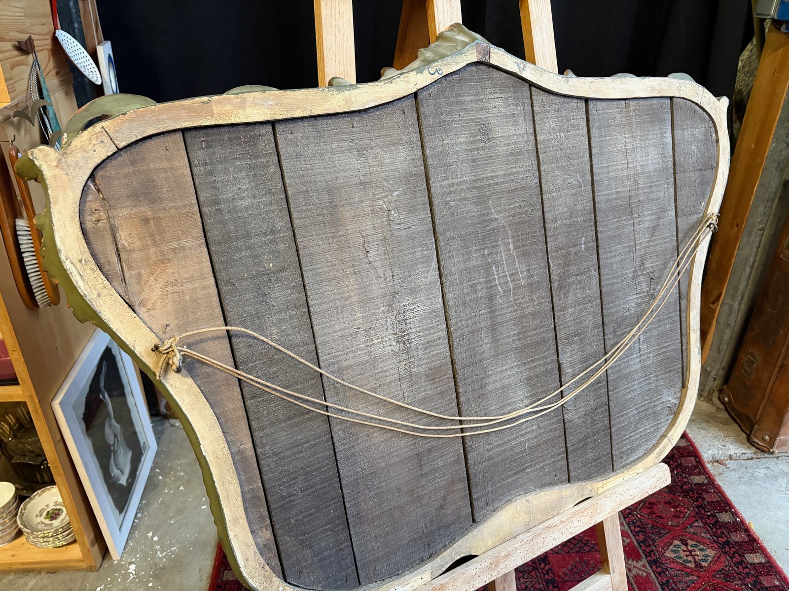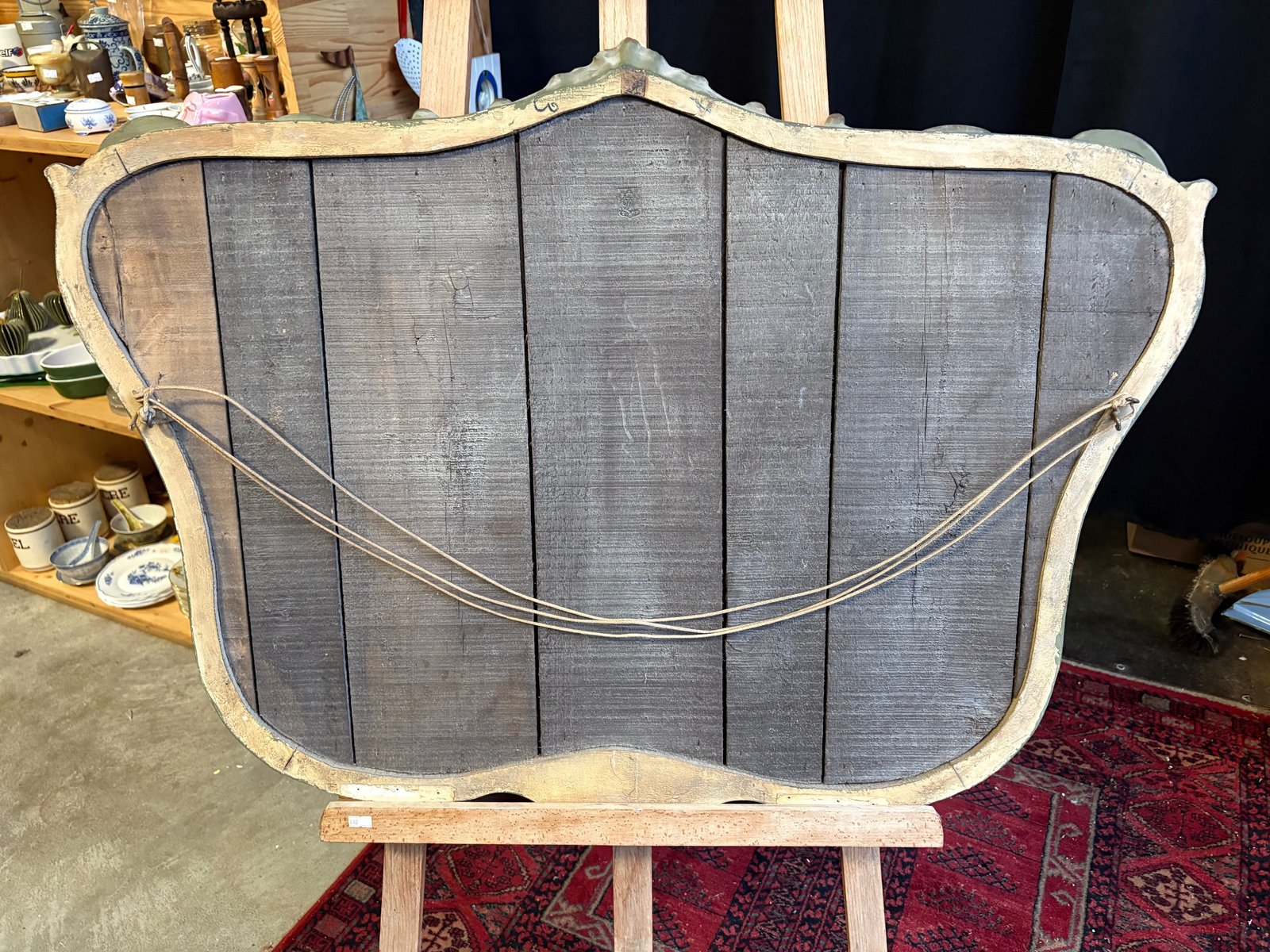 Die Rückseite besteht aus antiken Brettern, wahrscheinlich aus Quecksilberglas mit leichten Löchern, die auf das Alter und die Echtheit hinweisen.
