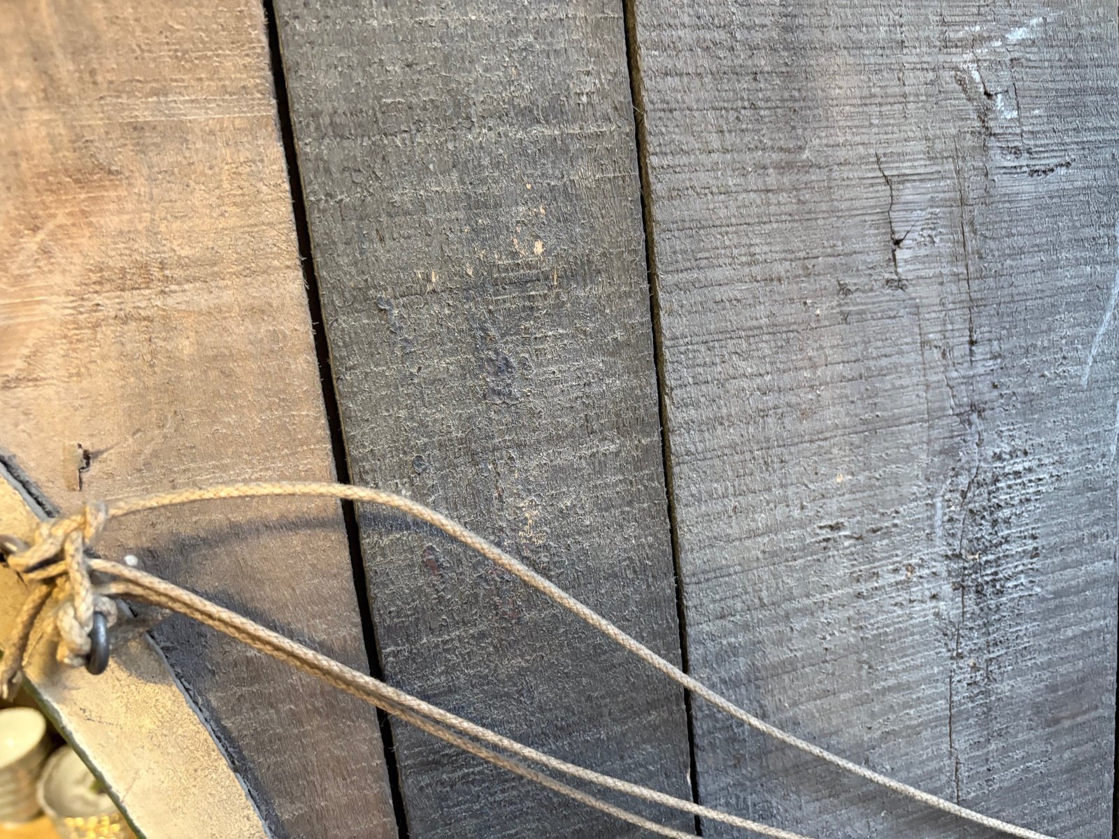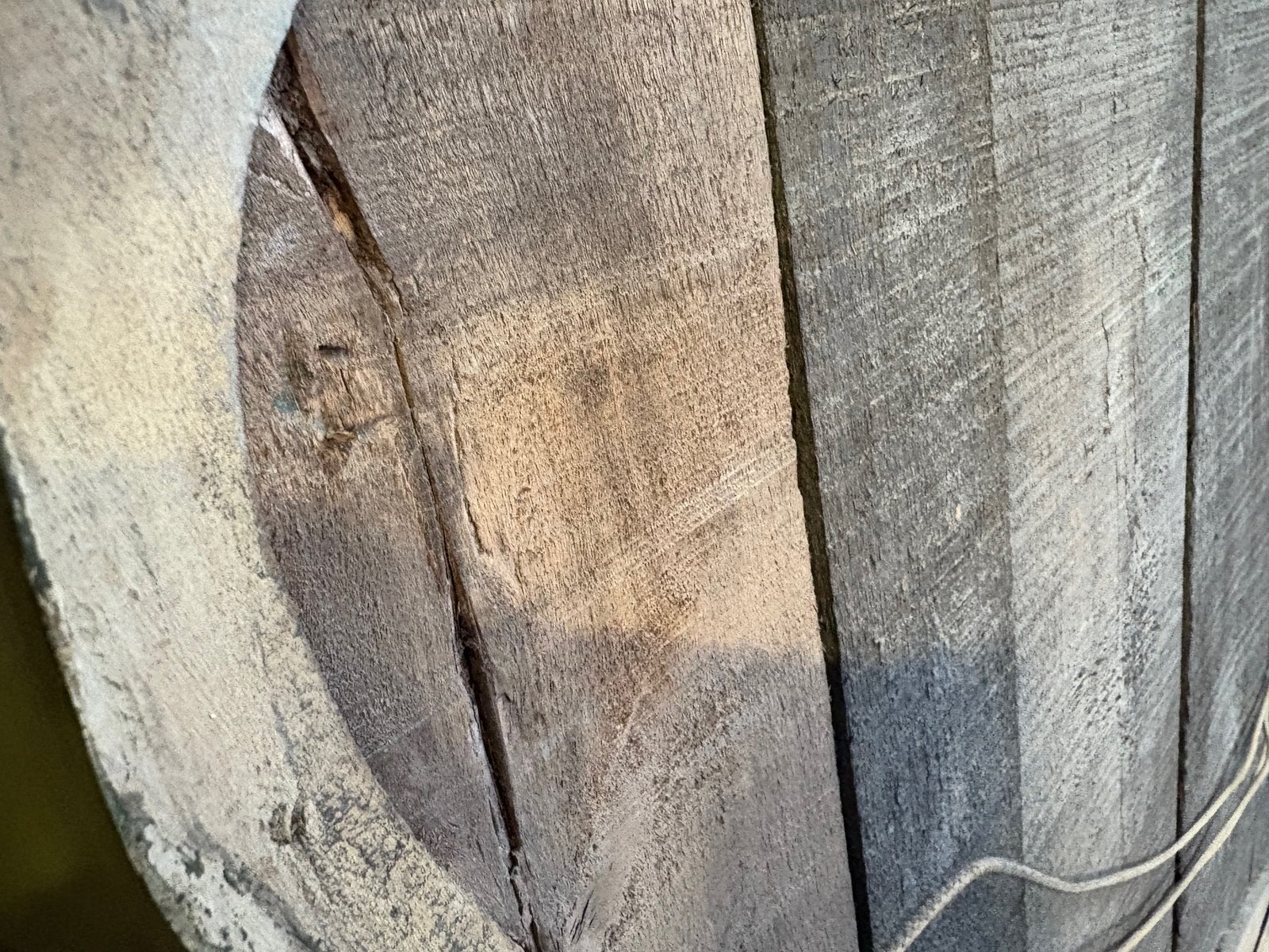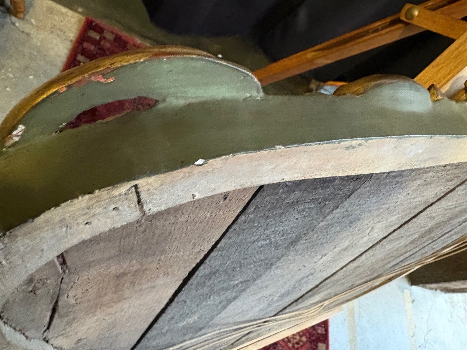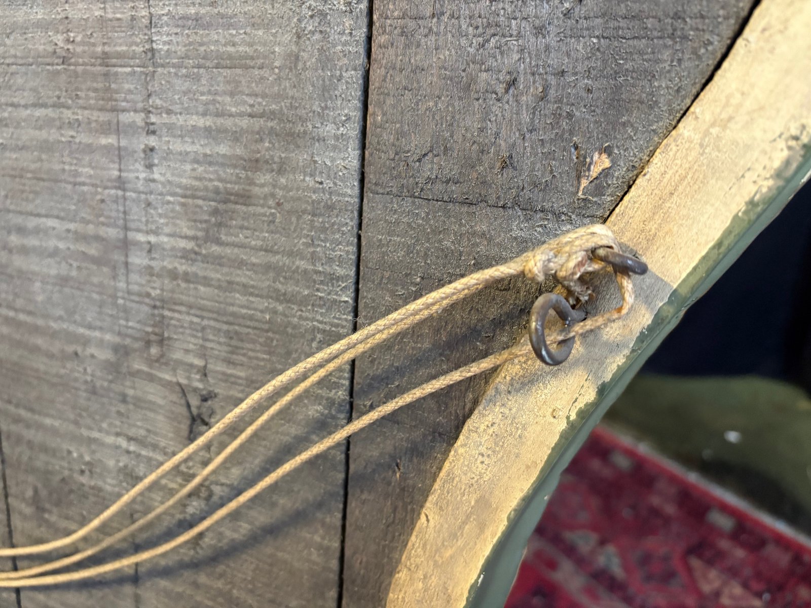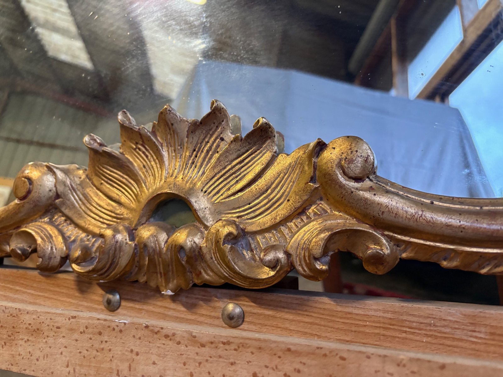 Back made of antique planks, probably mercury glass with light pitting, evidence of age and authenticity.