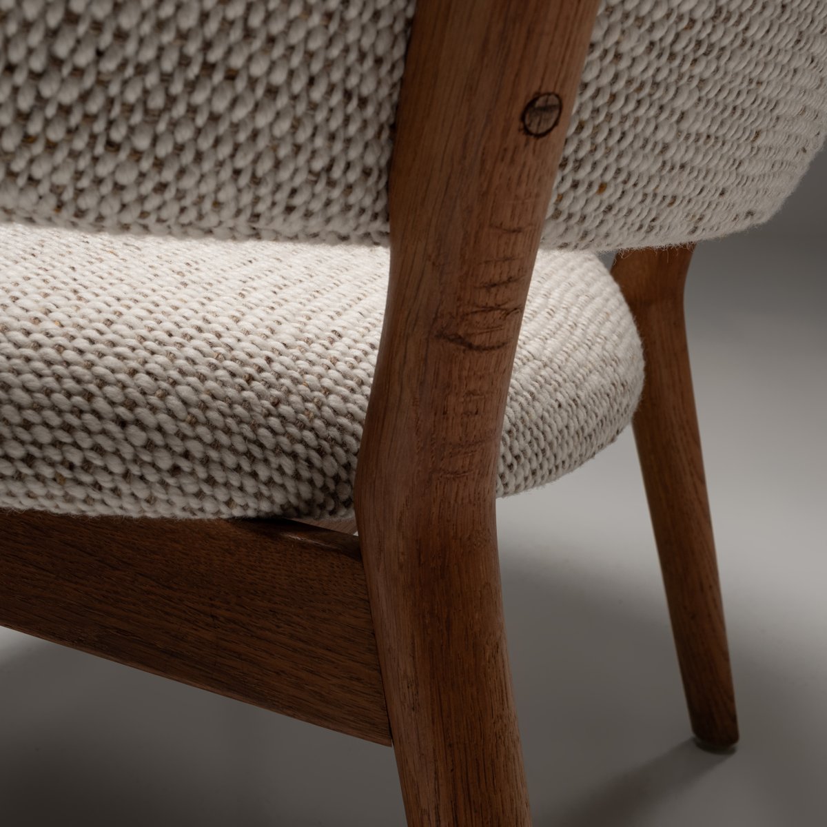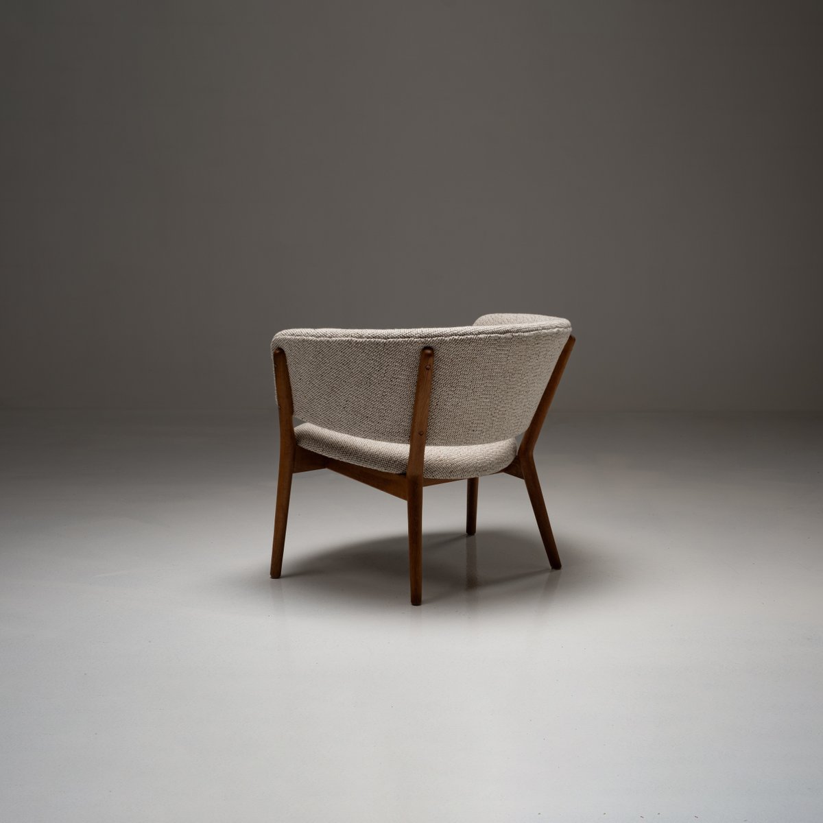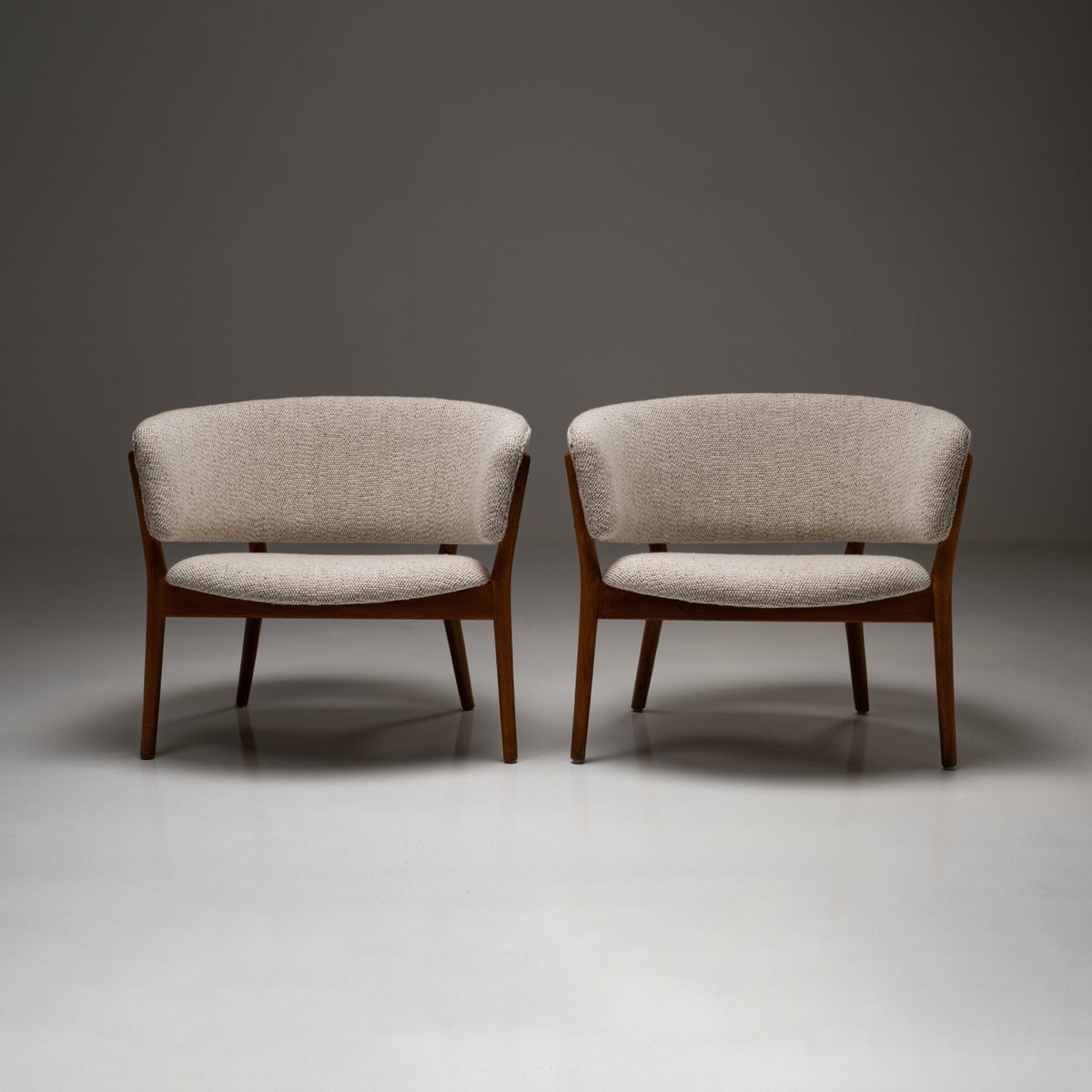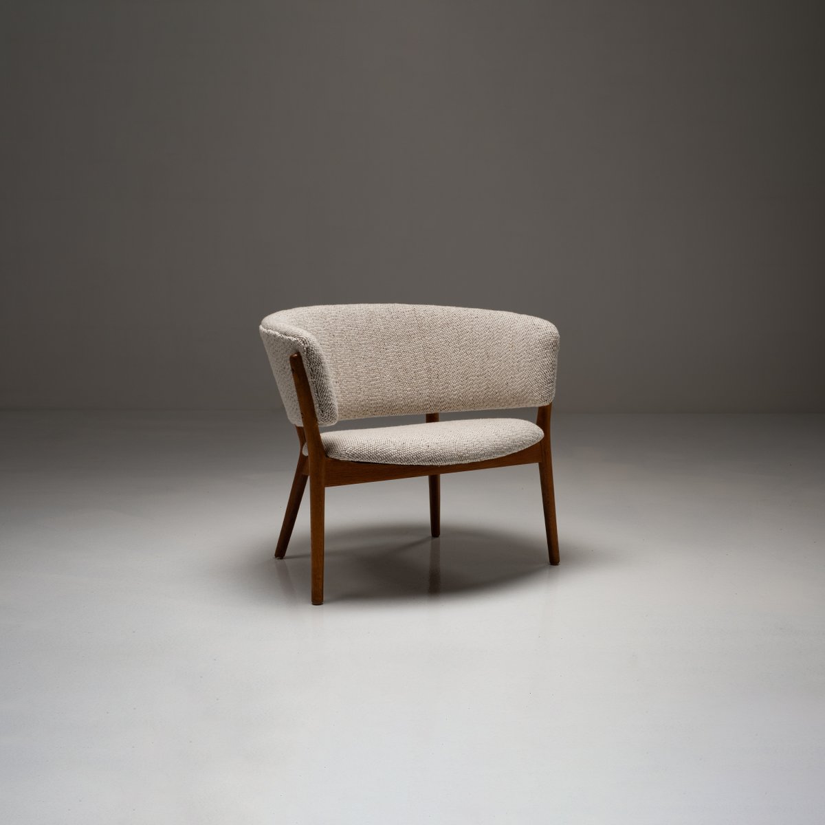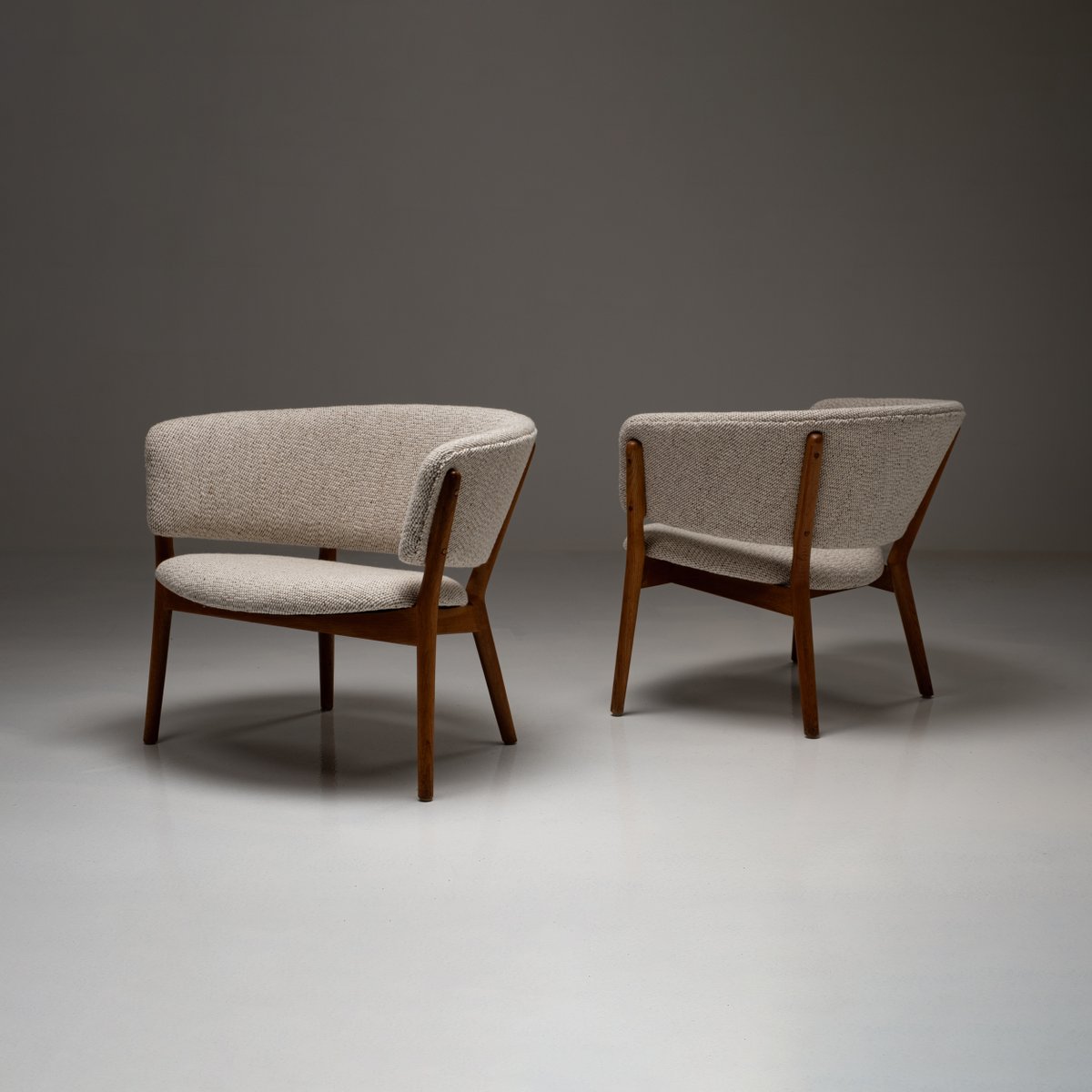 This set of Nanna Ditzel ND-83 lounge chairs is a strong example of her sculptural yet deeply human approach to Danish modern design. The chairs feature elegantly shaped solid oak frames, carefully proportioned to create both visual lightness and structural strength. The gently curved armrests and angled legs give the design a distinctive architectural presence, while maintaining an inviting, relaxed posture.