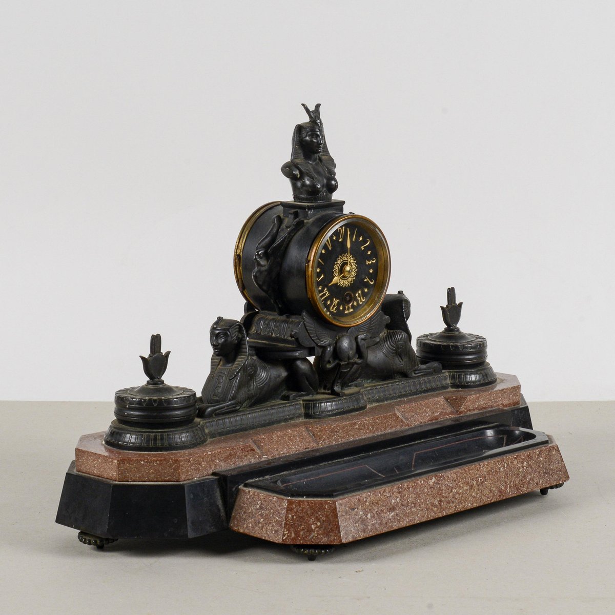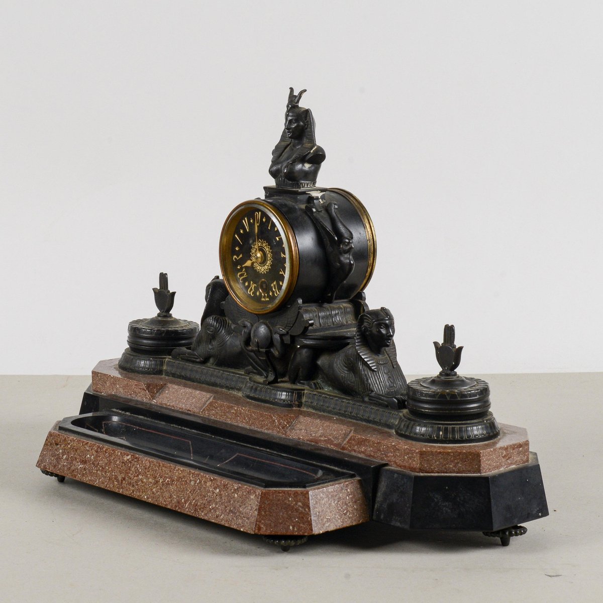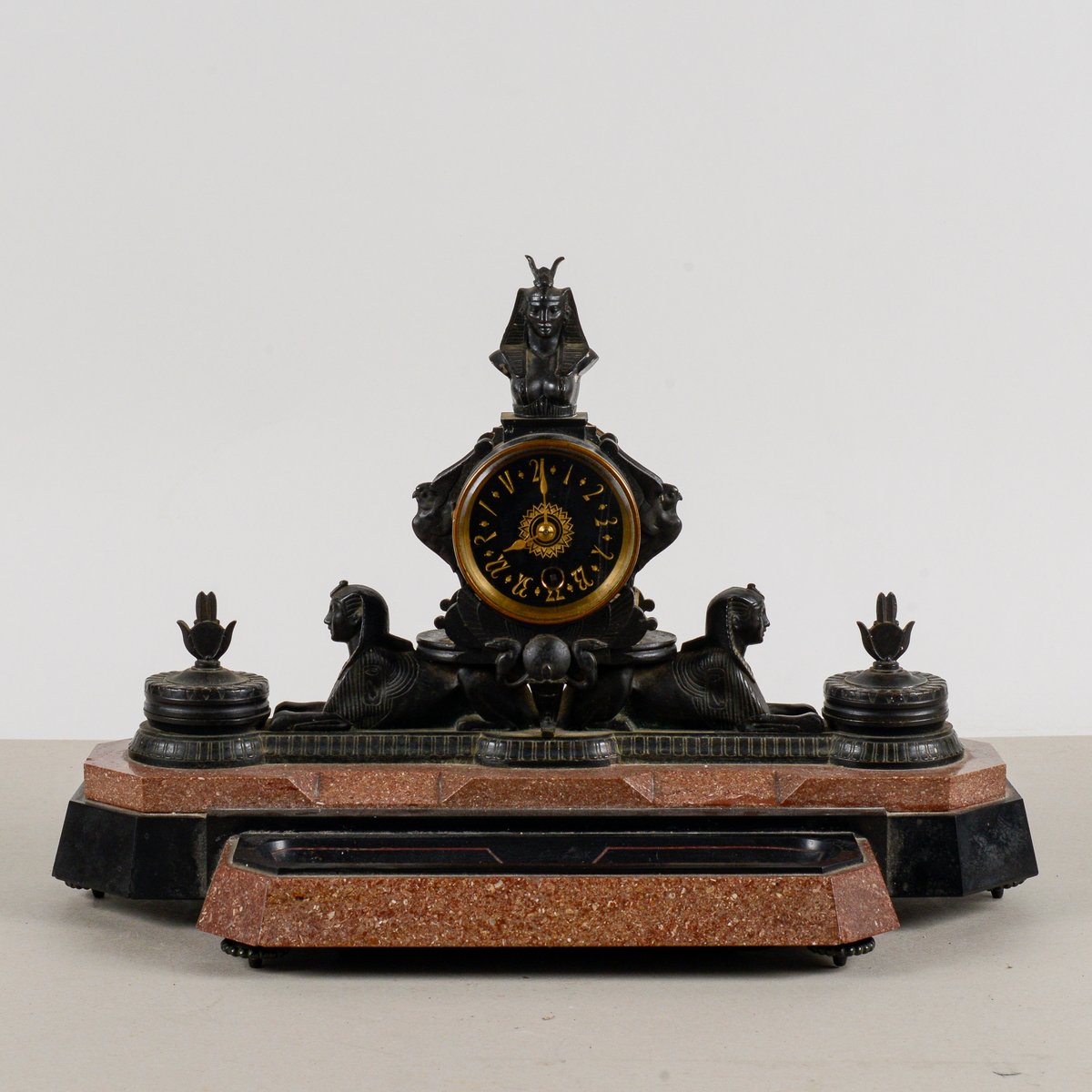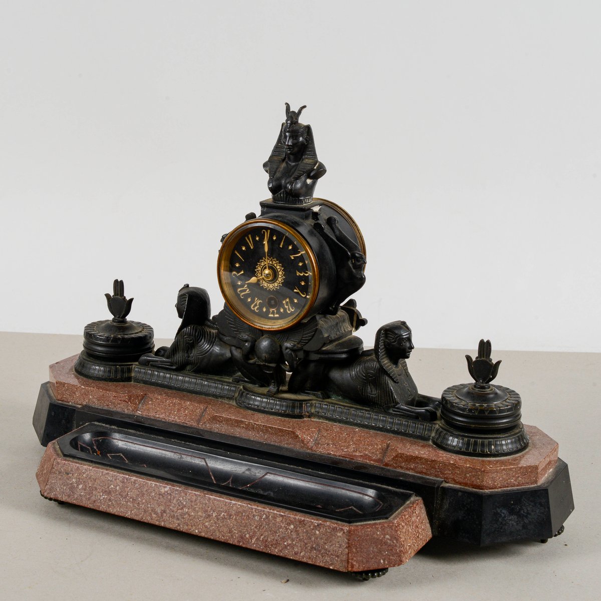Diese Kaminsimsuhr aus Bronze und polychromem Marmor ist ein bemerkenswertes Beispiel für den neo-ägyptischen Stil, eine künstlerische Bewegung, die im späten 19. und frühen 20. Jahrhundert wieder auflebte. Ihre Größe und ikonografischen Details machen sie zu einem visuell beeindruckenden Stück von großem historischem Wert. Der polychrome Marmorsockel bildet einen Farbkontrast, der die reich mit altägyptischen Elementen verzierte Bronzestruktur hervorhebt. Die Anwesenheit von Sphinxen und hieratischen Figuren unterstreicht die exotische Inspiration und die Vorliebe für Archäologie, die in dieser Epoche herrschte. Diese Uhr ist mehr als nur ein Zeitmesser, sie ist eine echte dekorative Skulptur, perfekt für einen Sammler oder jeden, der einen Raum mit historischer Pracht ausstatten möchte. Abmessungen: Breite 44 cm, Tiefe 20 cm, Höhe 30 cm KATEGORIE Uhr STIL neo-ägyptisch ABMESSUNGEN: HÖHE 30 cm BREITE 44 cm TIEFE 20 cm FARBE: Schwarzgold rot rosa MATERIAL: Marmor Stein Bronze Messing ZUSTAND: Ausgezeichnet Dieses Vintage-Stück ist in nahezu originalem Zustand. Es kann kleinere Gebrauchsspuren und/oder kleinere Restaurierungen aufweisen.