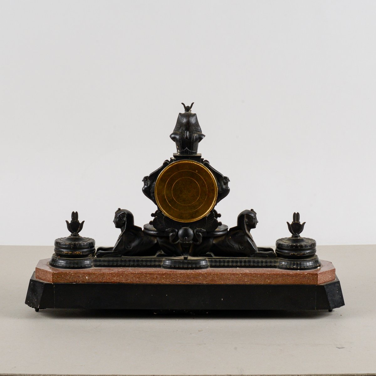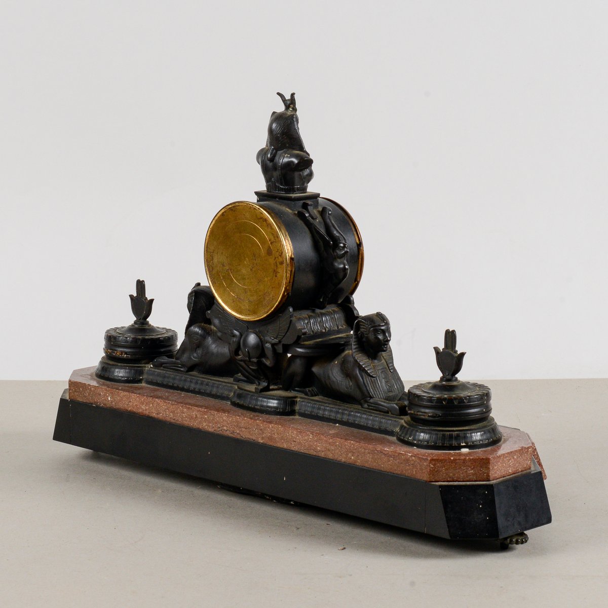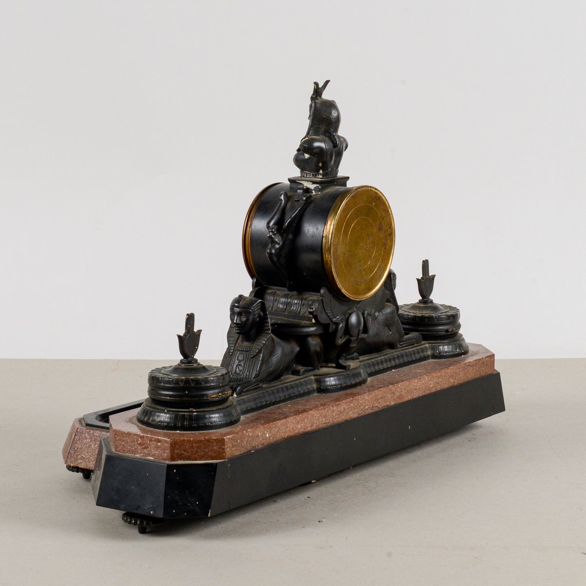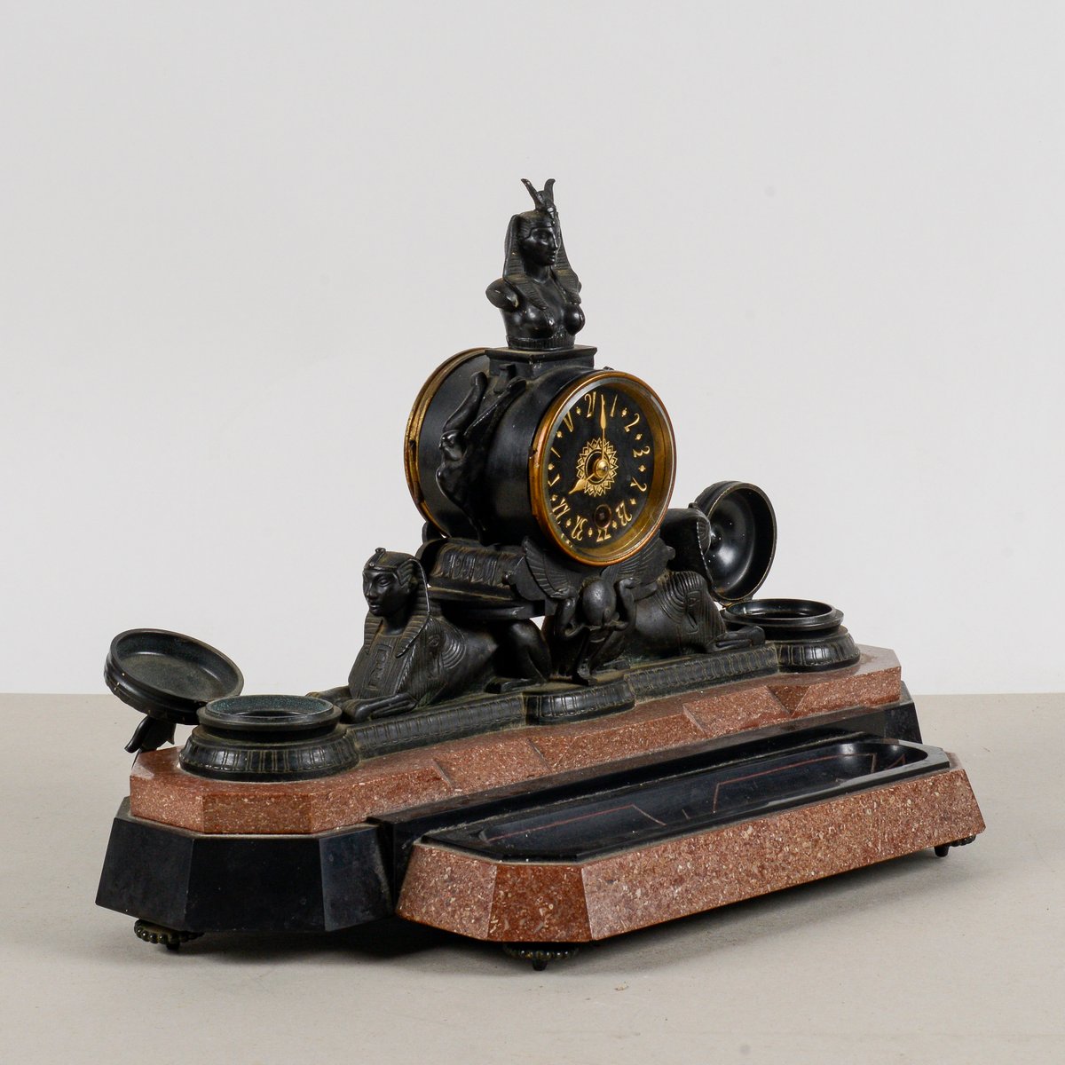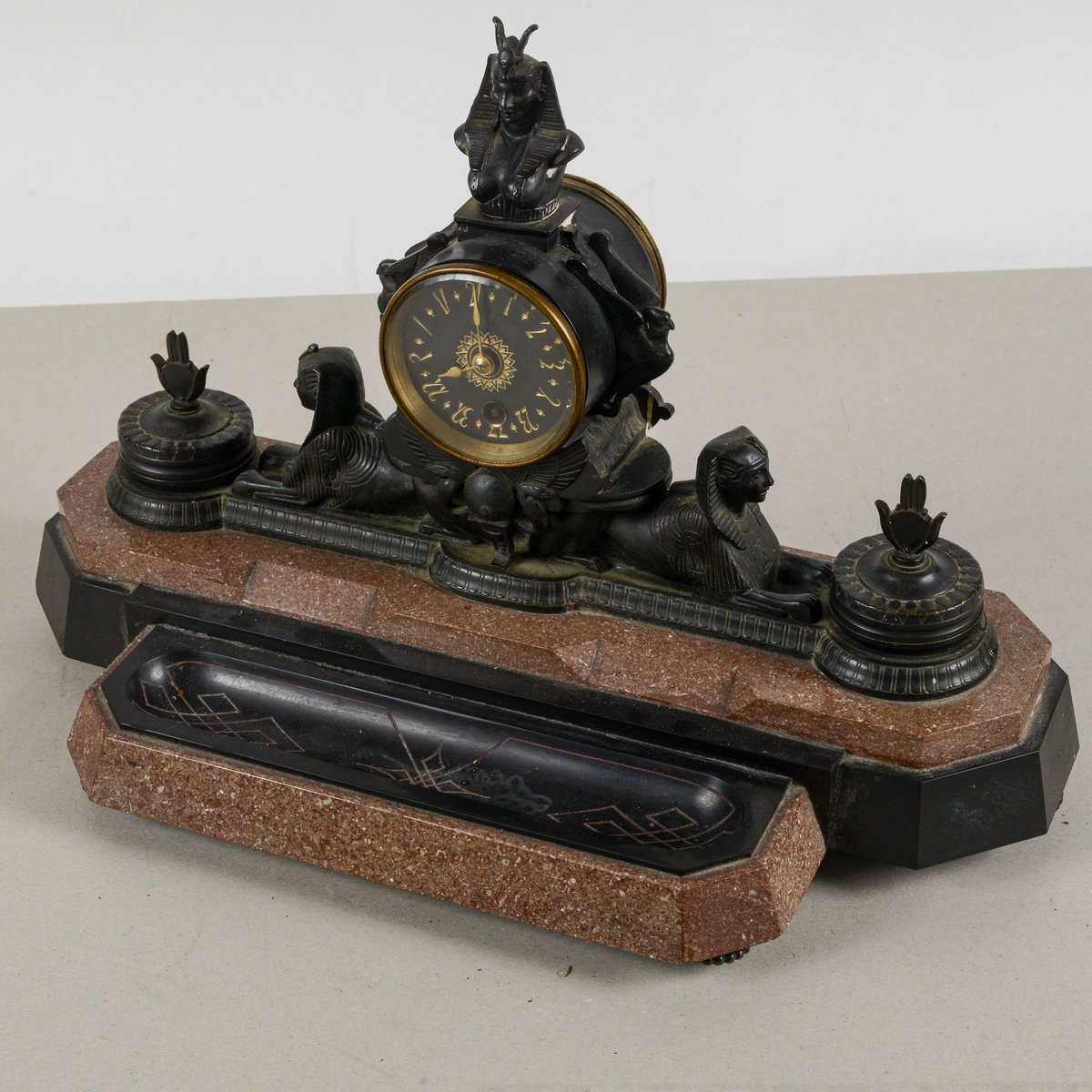 Diese Kaminsimsuhr aus Bronze und polychromem Marmor ist ein bemerkenswertes Beispiel für den neo-ägyptischen Stil, eine künstlerische Bewegung, die im späten 19. und frühen 20. Jahrhundert wieder auflebte. Ihre Größe und ikonografischen Details machen sie zu einem visuell beeindruckenden Stück von großem historischem Wert. Der polychrome Marmorsockel bildet einen Farbkontrast, der die reich mit altägyptischen Elementen verzierte Bronzestruktur hervorhebt. Die Anwesenheit von Sphinxen und hieratischen Figuren unterstreicht die exotische Inspiration und die Vorliebe für Archäologie, die in dieser Epoche herrschte. Diese Uhr ist mehr als nur ein Zeitmesser, sie ist eine echte dekorative Skulptur, perfekt für einen Sammler oder jeden, der einen Raum mit historischer Pracht ausstatten möchte. Abmessungen: Breite 44 cm, Tiefe 20 cm, Höhe 30 cm KATEGORIE Uhr STIL neo-ägyptisch ABMESSUNGEN: HÖHE 30 cm BREITE 44 cm TIEFE 20 cm FARBE: Schwarzgold rot rosa MATERIAL: Marmor Stein Bronze Messing ZUSTAND: Ausgezeichnet Dieses Vintage-Stück ist in nahezu originalem Zustand. Es kann kleinere Gebrauchsspuren und/oder kleinere Restaurierungen aufweisen.