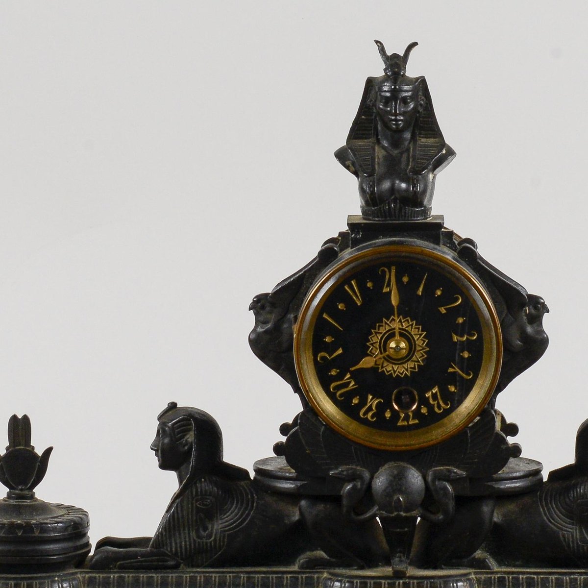 This bronze and polychrome marble mantel clock is a remarkable example of the Neo-Egyptian style, an artistic movement that resurfaced strongly in the late 19th and early 20th centuries. Its grandeur and iconographic detail make it a visually striking piece of great historical value. The polychrome marble base provides a chromatic contrast that enhances the bronze structure, richly decorated with elements reminiscent of ancient Egypt. The presence of sphinxes and hieratic figures underscores the exotic inspiration and taste for archaeology that permeated the era. This clock is more than just a timekeeping mechanism, but a true decorative sculpture, perfect for a collector or anyone wishing to instill a sense of historical grandeur in a space. Measurements: Width 44 cm, Depth 20 cm, Height 30 cm CATEGORY clock STYLE neo-Egyptian DIMENSIONS: HEIGHT 30 cm WIDTH 44 cm DEPTH 20 cm COLOR: black gold red rose MATERIAL: marble stone bronze brass CONDITION: Excellent This vintage piece is in near-original condition. It may show minor traces of use and/or minor restorations.