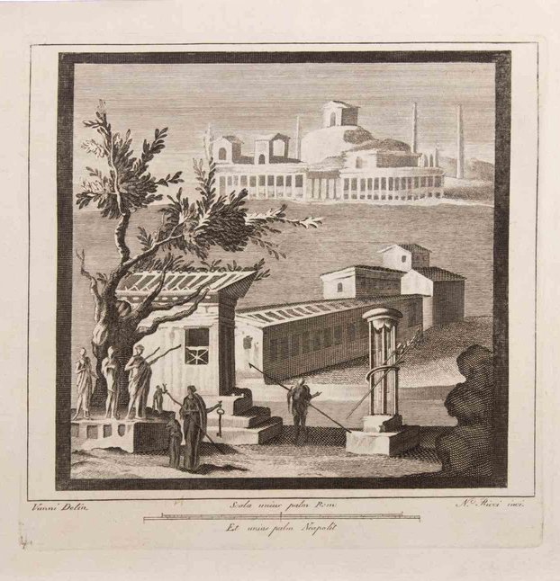 Seascape with Monuments and Figures is an Etching realized by Niccolò Vanni (1750-1770). The etching belongs to the print suite “Antiquities of Herculaneum Exposed” (original title: “Le Antichità di Ercolano Esposte”), an eight-volume volume of engravings of the finds from the excavation of the ruins of Herculaneum in the Kingdom of Naples (now Campania, Italy). It was published between 1757 and 1792 by the Regia Stamperia, and copies were delivered to selected recipients across Europe. Despite the title, the Antiquity of Herculaneum shows objects from all the excavations undertaken by the Bourbons in the Gulf of Naples. These include Pompeii, Stabia and two sites of Herculaneum: Resina and Portici. The Bourbon King Carlo appointed fifteen scholars creating a new “Herculaneum Academy” to study the artifacts and publish the results of the archaeological excavations of the sites. The engravings are of high quality and the accompanying text shows a large scholarship. They were realized by 25 prominent artists involved by the King to prepare drawings and engravings on the finds, among which we can find Giovanni Elia Morghen, Carlo Nolli, Luigi Vanvitelli and Giovanni Battista Casanova. The “Antiquities” was designed more to amaze readers with the quality of the objects in the collection of the King of Naples than to be used in research., following and increasing the interest of 18th century society for the classical culture and Art in particular. Through the exaltation of the classical concept of proportions and harmony, the book was of inspiration to the neoclassical movement in Europe, giving artists and decorators access to a huge shop of Hellenistic motifs. Ref.: National Gallery (Washington), Mark J. Millard Architectural, IV (2000), no. 1; L. Garcia y Garcia, Nova bibliotheca pompeiana (2 v., 1998); Royal Institute of British Architects, British Architectural Library ... Early printed books, 1 (1994), no. 112. U. Pannuti, 'Incisori e disegnatori della Stamperia Reale di Napoli nel secolo XVIII: la pubblicazione delle Antichità di Ercolano', in Xenia antiqua, 9 (2000), p. 151-178; V. Trombetta, 'L'edizione de Le Antichità di Ercolano esposte' in Rendiconti dell'Accademia di Archeologia, lettere e belle arti di Napoli , 59 (1984), p.151-172.